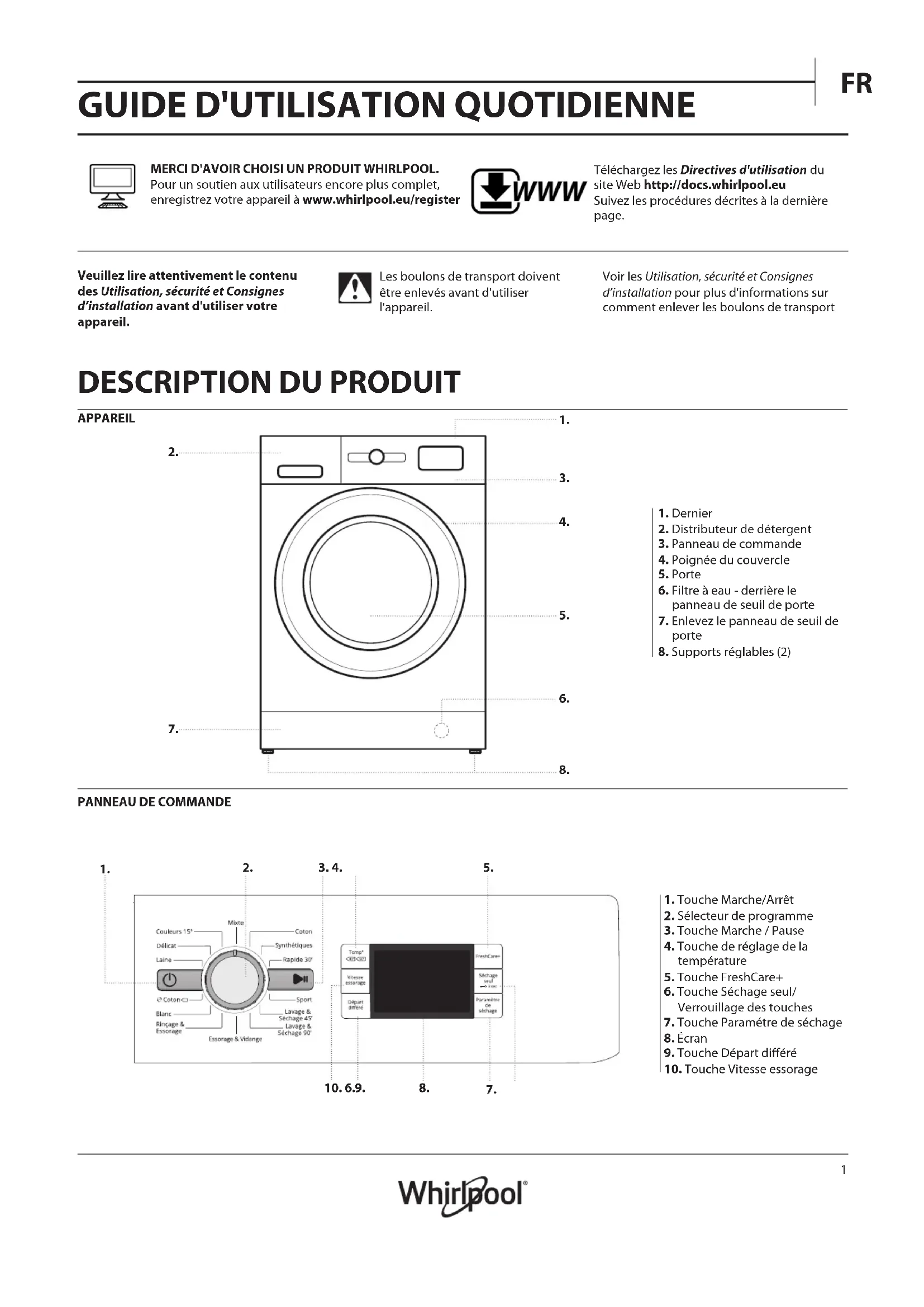 Veuillez lire attentivement le contenu des Utilisation, sécurité et Consignes d’installation avant d'utiliser votre appareil. Les boulons de transport doivent être enlevés avant d'utiliser l'appareil. Voir les Utilisation, sécurité et Consignes d’installation pour plus d'informations sur comment enlever les boulons de transport MERCI D'AVOIR CHOISI UN PRODUIT WHIRLPOOL. Pour un soutien aux utilisateurs encore plus complet, enregistrez votre appareil à www.whirlpool.eu/register Téléchargez les Directives d'utilisation du site Web http://docs.whirlpool.eu Suivez les procédures décrites à la dernière page. WWW