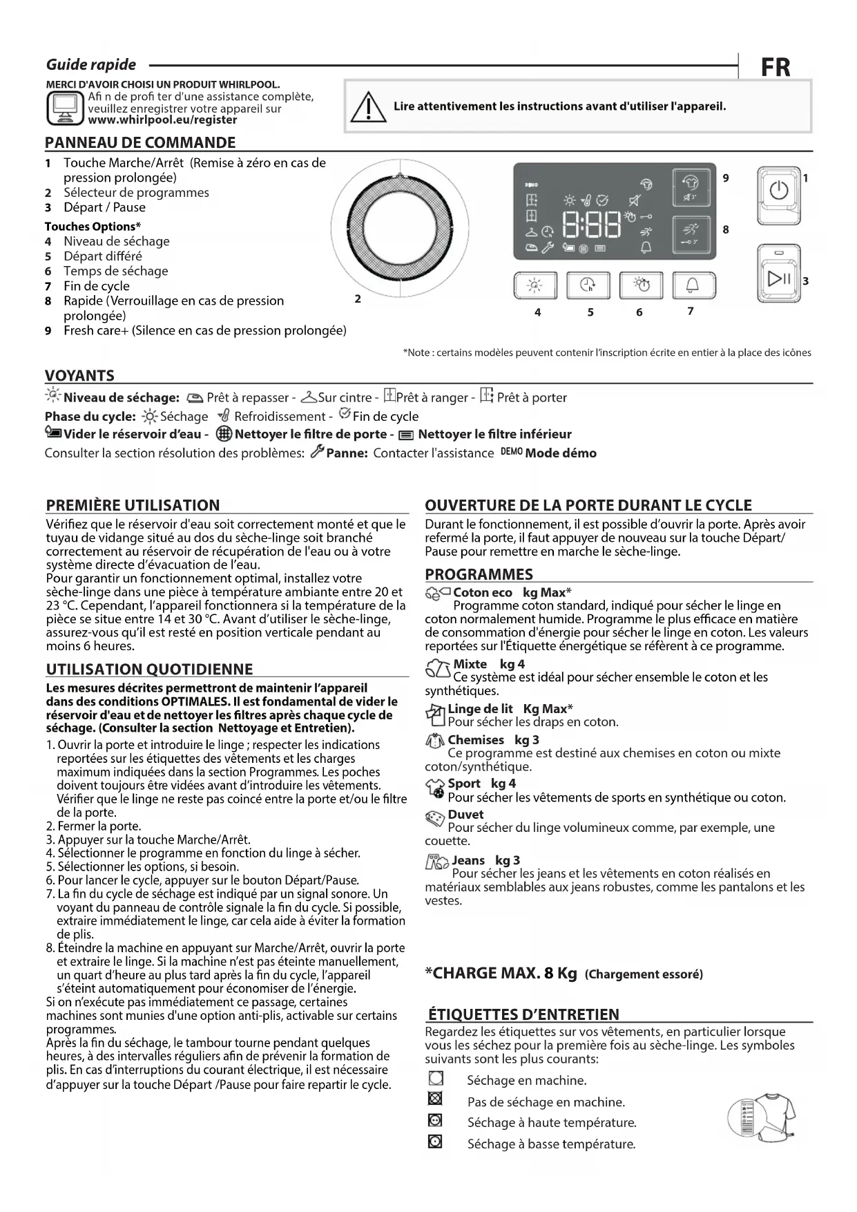 *CHARGE MAX. 8 Kg (Chargement essore)