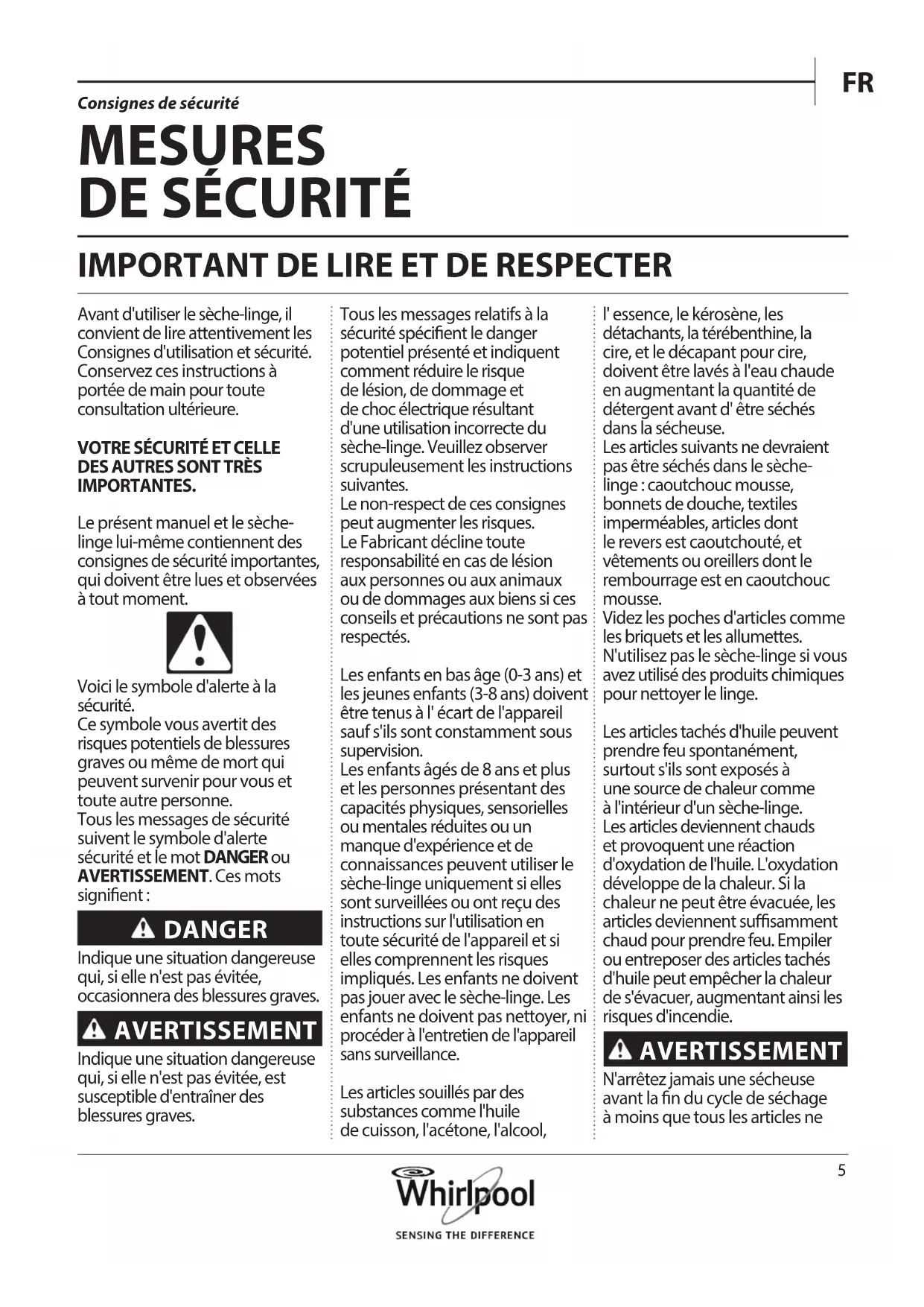 Tous les messages relatifs à la sécurité spécifique le danger potentiel représenté et indiquent comment réduire le risque de lésion, de dommage et de chic électrique résultat d'une utilisation incorrecte du seche-linge. Veuillez observer scrupuleusement les instructions suivantes.
