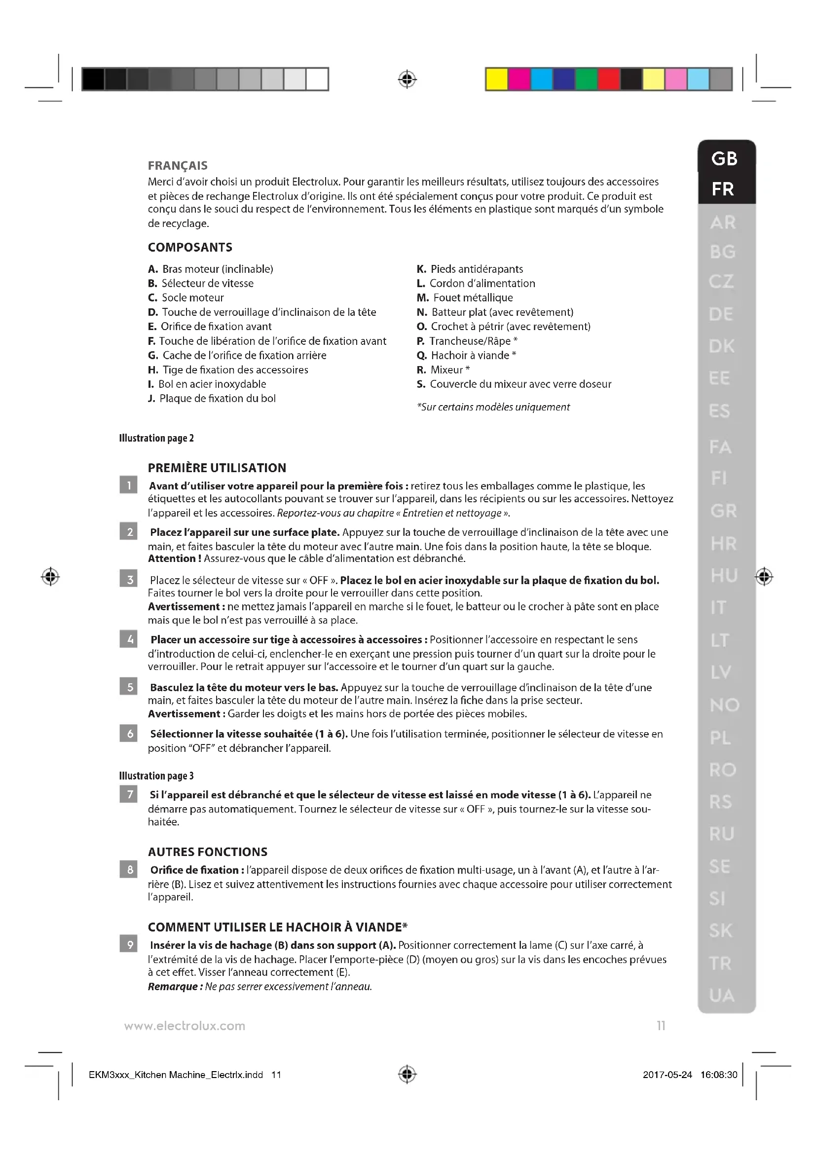 *Ne dépassez pas la vitesse2 lorsque vous préparez une pâte levée. Cela pourrait endommager le robot. EKM3xxx_Kitchen Machine_Electrlx.indd 15 2017-05-24 16:08:3116 www.electrolux.com