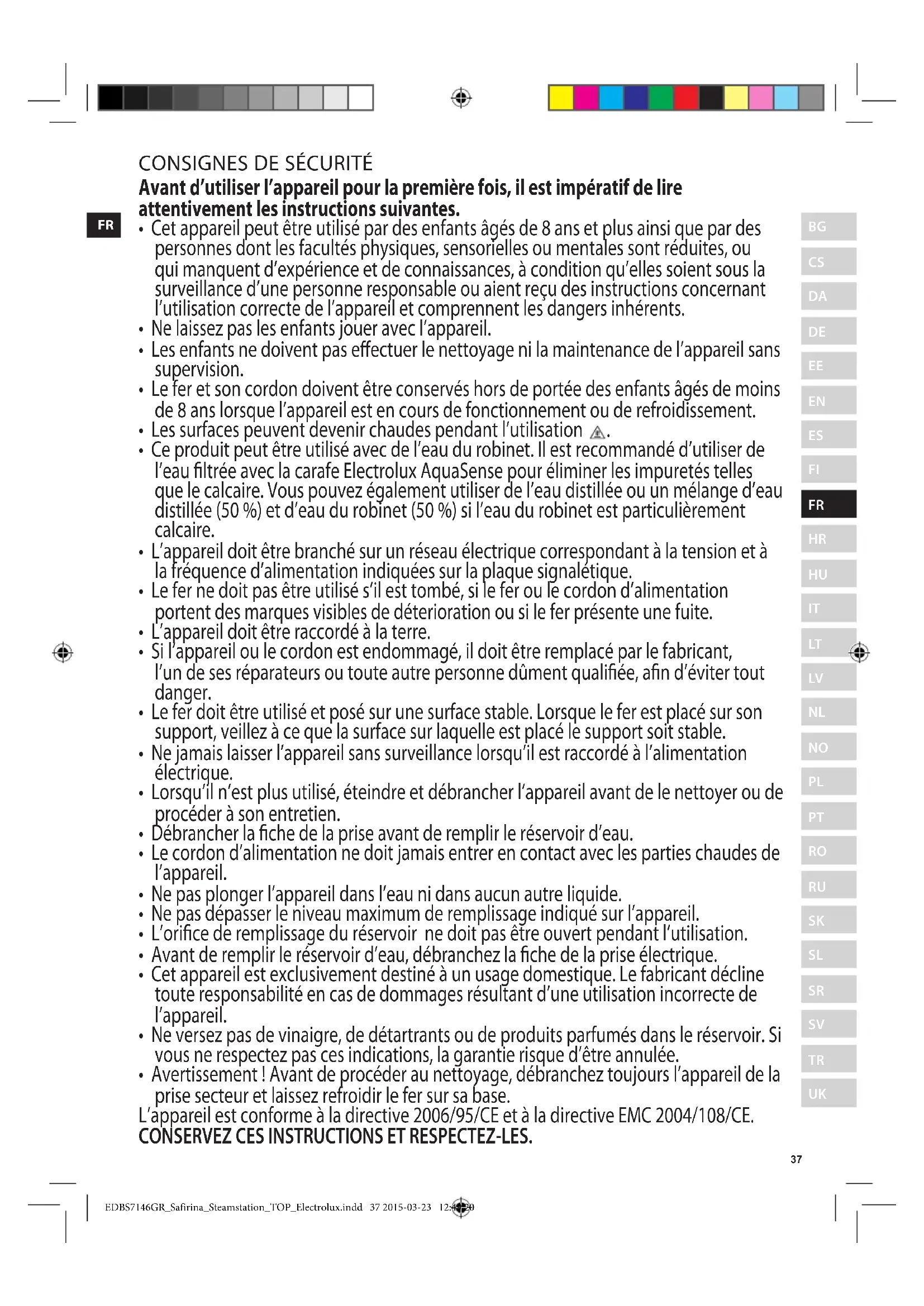 EDBS7146GR_Safirina_Steamstation_TOP_Electrolux.indd 37 2015-03-23 12:49:20FRFR ÉLÉMENTS A. Touche Vapeur B. Poignée ergonomique C. Repère de température D. Sélecteur de température E. Voyant indicateur de température F. Tuyau Cordon vapeur G. Cordon d’alimentation H. Rangement du cordon d’alimentation