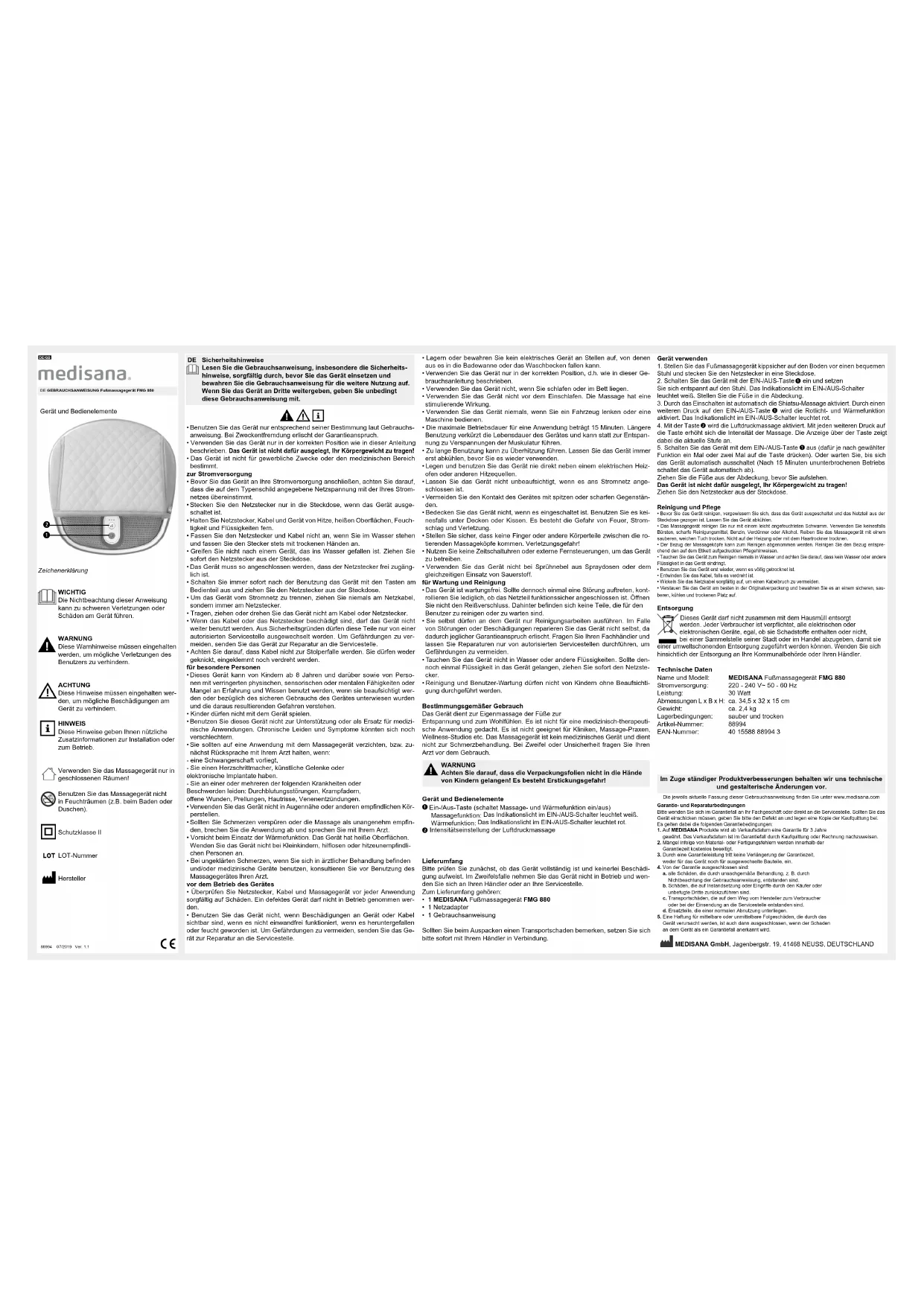 1NL/FR 88994 07/2019 Ver. 1.1 FR MODE D’EMPLOI Appareil de massage pour les pieds FM 880 Légende des symboles IMPORTANT Le non-respect de ces instructions peut entraîner des blessures graves ou risque d’endommager l’appareil. AVERTISSEMENT Ces avertissements doivent être respec- tés pour éviter d'éventuelles blessures à l'utilisateur. ATTENTION Ces avertissements doivent être respec- tés pour éviter d'éventuels dommages à l’appareil. REMARQUE Ces instructions vous procurent des infor- mations supplémentaires utiles sur l'ins- tallation ou le fonctionnement. Utilisez l’appareil de massage uniquement dans des locaux fermés ! N'utilisez pas l’appareil de massage dans des pièces humides (par ex. en prenant un bain ou une douche). Classe de protection II Numéro de LOT Fabricant Appareil et éléments de commande Lisez attentivement le mode d’emploi, en particulier les consignes de sécurité avant d’utiliser l’appareil et conservez le mode d'emploi pour une prochaine utilisation. Si vous conez l'appareil à un tiers, veuillez impérativement joindre ce mode d'emploi. FR Consignes de sécurité