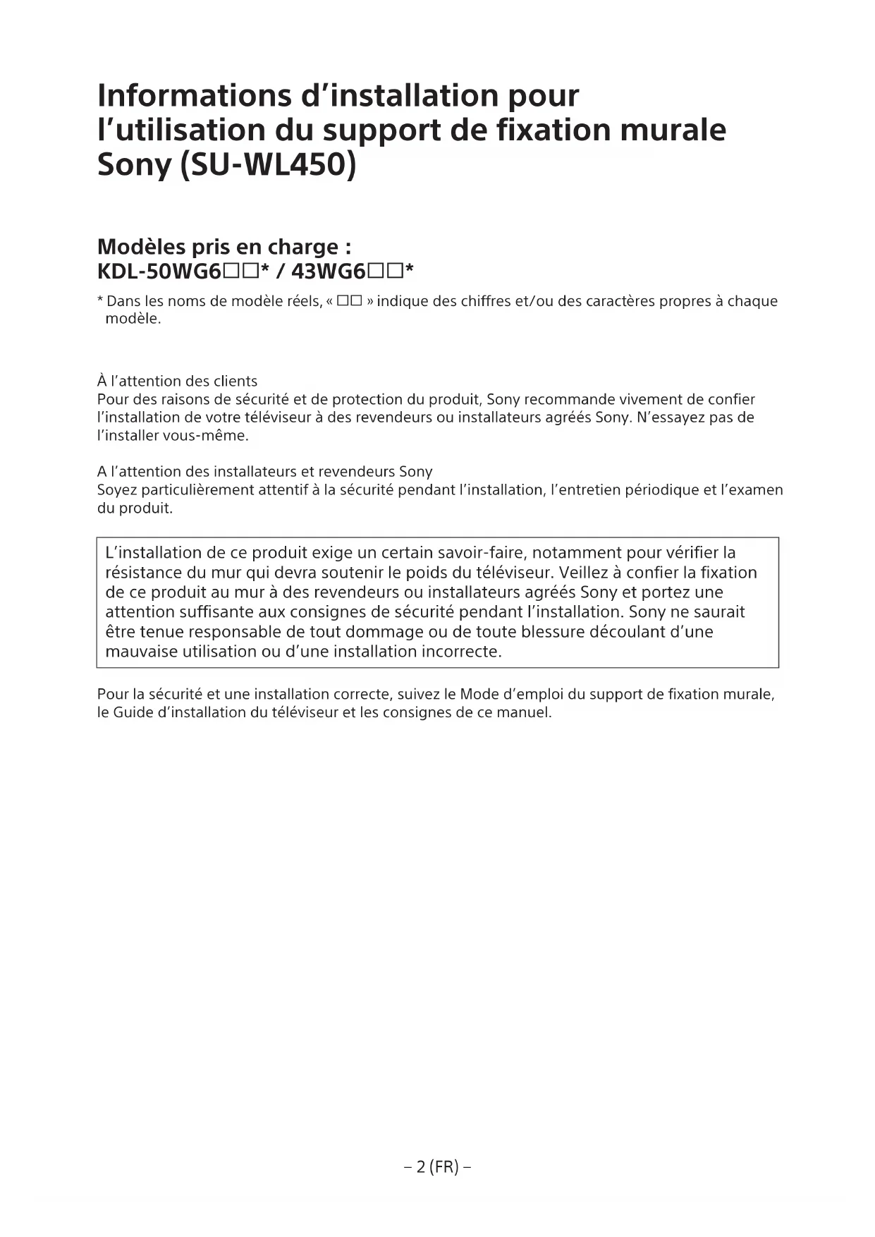 - Dans les noms de modèle réels, « » indique des chiffres et/ou des caractères propres à chaque modèle. À l’attention des clients Pour des raisons de sécurité et de protection du produit, Sony recommande vivement de confier l’installation de votre téléviseur à des revendeurs ou installateurs agréés Sony. N’essayez pas de l’installer vous-même. A l’attention des installateurs et revendeurs Sony Soyez particulièrement attentif à la sécurité pendant l’installation, l’entretien périodique et l’examen du produit. L’installation de ce produit exige un certain savoir-faire, notamment pour vérifier la résistance du mur qui devra soutenir le poids du téléviseur. Veillez à confier la fixation de ce produit au mur à des revendeurs ou installateurs agréés Sony et portez une attention suffisante aux consignes de sécurité pendant l’installation. Sony ne saurait être tenue responsable de tout dommage ou de toute blessure découlant d’une mauvaise utilisation ou d’une installation incorrecte. Pour la sécurité et une installation correcte, suivez le Mode d’emploi du support de fixation murale, le Guide d’installation du téléviseur et les consignes de ce manuel.− 3 (FR) − Sécurité Nous vous remercions d’avoir fait l’acquisition de ce produit. À l’attention des clients L’installation de ce produit exige un certain savoir-faire. Veillez à confier l’installation à des revendeurs Sony ou à des installateurs agréés et portez une attention particulière aux consignes de sécurité pendant l’installation. Sony ne saurait être tenue responsable de tout dommage ou de toute blessure découlant d’une mauvaise utilisation ou d’une installation incorrecte, ou encore de l’installation d’un produit autre que celui spécifié. Vos droits légaux (éventuels) ne sont pas affectés. À l’attention des détaillants Sony L’installation de ce produit exige un certain savoir-faire. Lisez ce mode d’emploi attentivement afin de procéder à l’installation en toute sécurité. Sony ne saurait être tenue responsable de tout dommage ou de toute blessure découlant d’une mauvaise utilisation ou d’une installation incorrecte. Une fois l’installation terminée, veuillez remettre ce manuel d’installation au client. Ce mode d’emploi indique comment manipuler le produit correctement et contient des précautions essentielles à prendre pour éviter tout accident. Lisez attentivement ce mode d’emploi et veillez à utiliser le produit correctement. Conservez ce mode d’emploi pour toute référence ultérieure. Les produits Sony sont conçus pour vous offrir le maximum de sécurité. Toutefois, si les produits sont utilisés de façon incorrecte, ils peuvent entraîner des blessures graves en provoquant un incendie ou l’électrocution, ou encore la chute de l’appareil hors de son support. Veillez à observer les consignes de sécurité préconisées pour éviter de tels accidents. ATTENTION Produits spécifiés Ce support de fixation murale est conçu pour être utilisé avec les téléviseurs spécifiés. Pour plus d’informations sur les téléviseurs, reportez-vous à leur Guide de référence pour vous assurer que vous pouvez bien utiliser le support de fixation murale. À l’attention des clients AVERTISSEMENT Le non-respect des consignes suivantes peut être fatal ou entraîner des blessures graves en provoquant un incendie, l’électrocution ou la chute de l’appareil. Veillez à confier l’installation à du personnel agréé en tenant les petits enfants à l’écart pendant l’installation. Si le support de fixation murale ou le téléviseur n’est pas installé correctement, les accidents suivants peuvent se produire. Veillez à confier l’installation à des installateurs agréés.