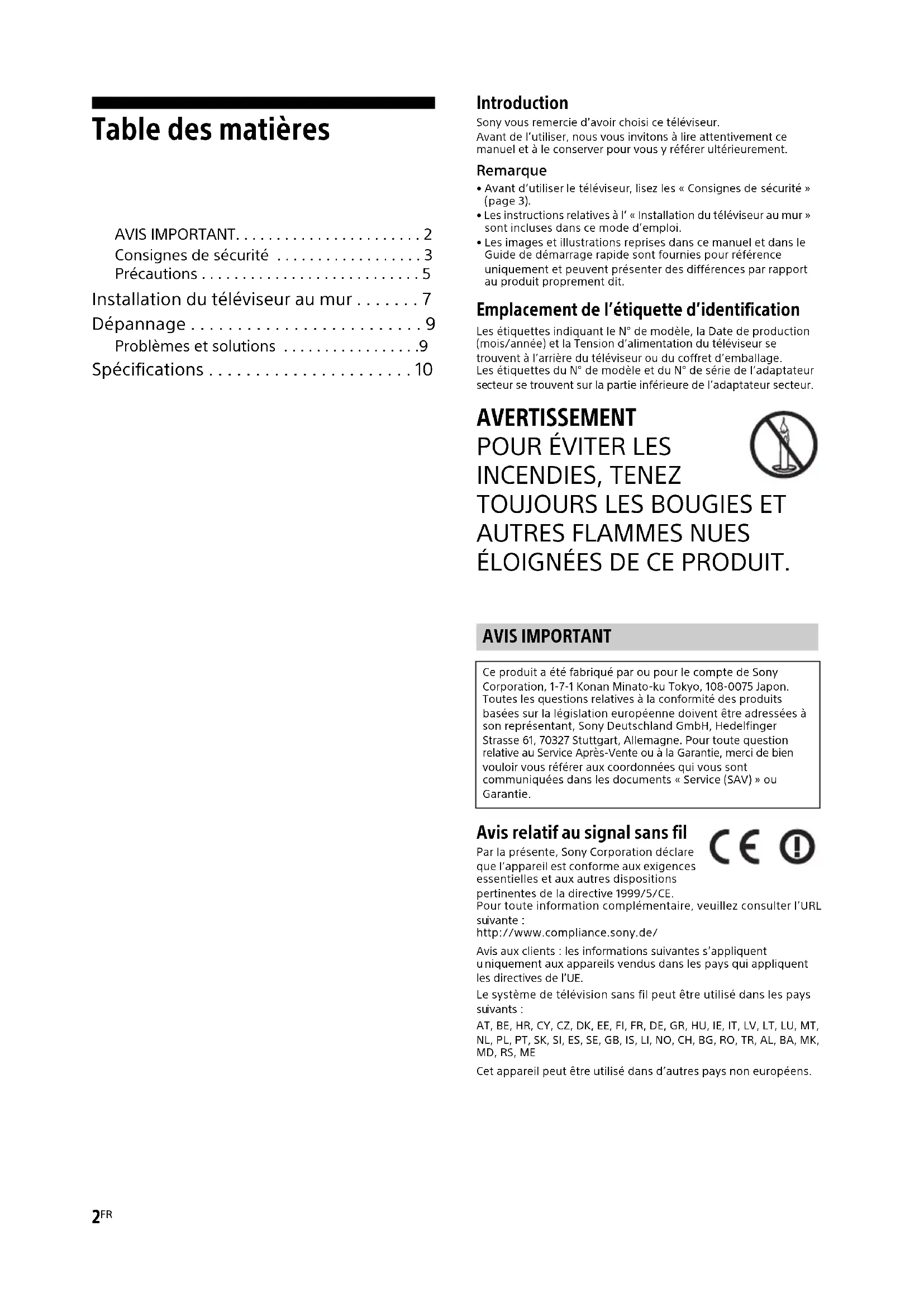 ÉLOIGNÉES DE CE PRODUIT. Avis relatif au signal sans fil Par la présente, Sony Corporation déclare que l’appareil est conforme aux exigences essentielles et aux autres dispositions pertinentes de la directive 1999/5/CE.Pour toute information complémentaire, veuillez consulter l’URL ivante :http://www.compliance.sony.de/Avis aux clients : les informations suivantes s’appliquent niquement aux appareils vendus dans les pays qui appliquent les directives de l’UE.Le système de télévision sans fil peut être utilisé dans les pays ivants :AT, BE, HR, CY, CZ, DK, EE, FI, FR, DE, GR, HU, IE, IT, LV, LT, LU, MT, NL, PL, PT, SK, SI, ES, SE, GB, IS, LI, NO, CH, BG, RO, TR, AL, BA, MK, MD, RS, MECet appareil peut être utilisé dans d’autres pays non européens. AVIS IMPORTANT Ce produit a été fabriqué par ou pour le compte de Sony Corporation, 1-7-1 Konan Minato-ku Tokyo, 108-0075 Japon. Toutes les questions relatives à la conformité des produits basées sur la législation européenne doivent être adressées à son représentant, Sony Deutschland GmbH, Hedelfinger Strasse 61, 70327 Stuttgart, Allemagne. Pour toute question relative au Service Après-Vente ou à la Garantie, merci de bien vouloir vous référer aux coordonnées qui vous sont communiquées dans les documents «Service (SAV)» ou Garantie.3