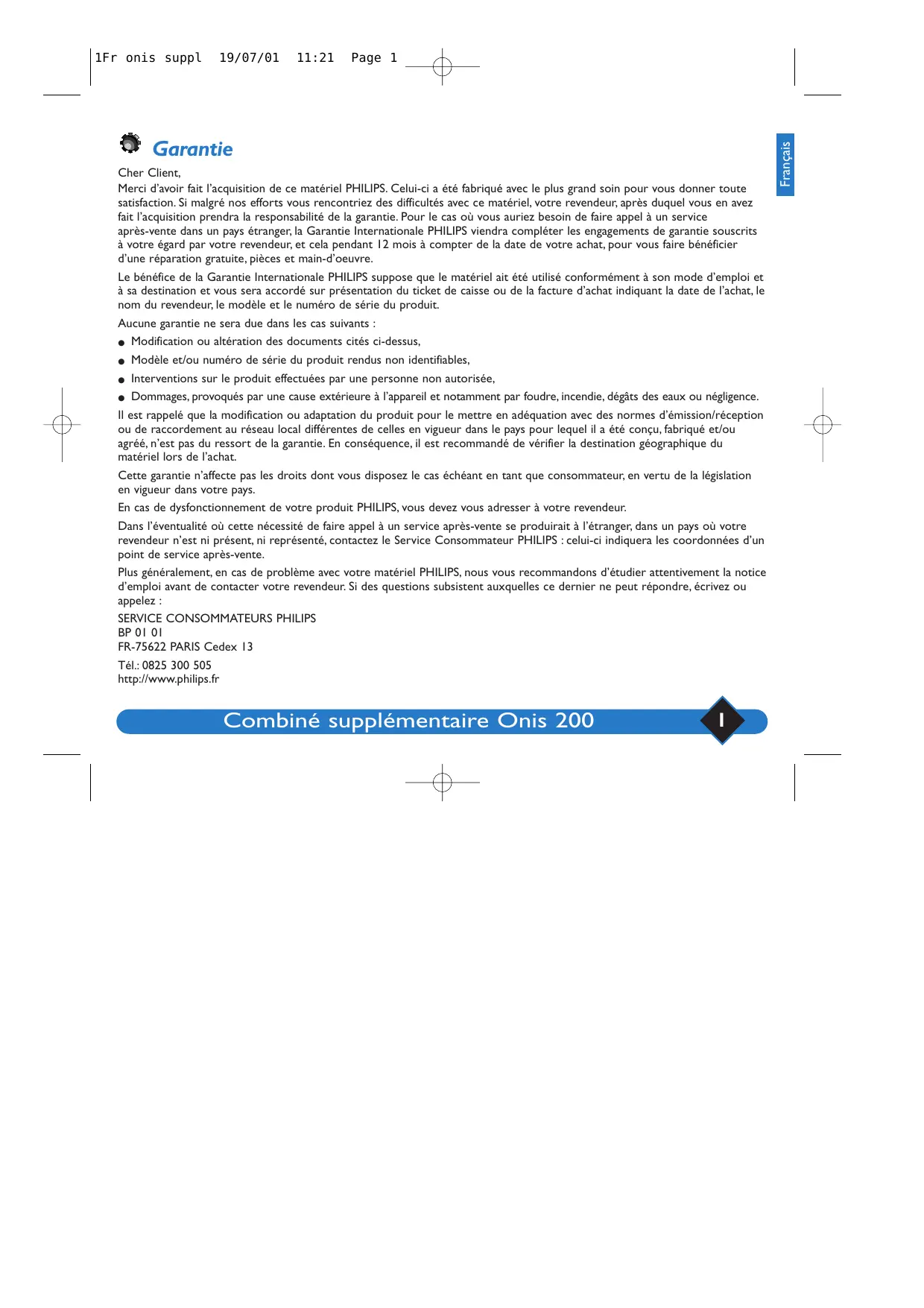 Le bénéfice de la Garantie Internationale PHILIPS suppose que le matériel ait eté utilisé conformément à son mode d'emploi et à sa destination et vous sera accordé sur presentation du ticket de caisse ou de la facture d'achat indiquant la date de l'achat, le nom du revendeur, le modele et le numero de série du produit.