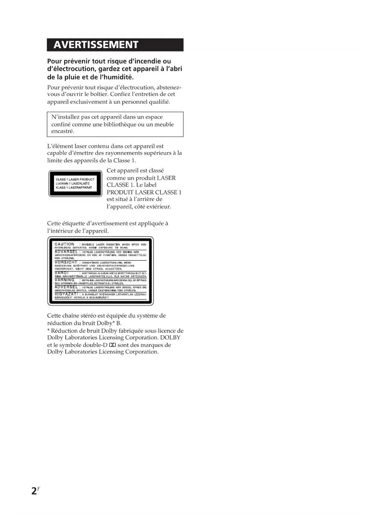 AVERTISSEMENT Pour prévenir tout risque d’incendie ou d’électrocution, gardez cet appareil à l’abri de la pluie et de l’humidité. Pour prévenir tout risque d’électrocution, abstenez- vous d’ouvrir le boîtier. Confiez l’entretien de cet appareil exclusivement à un personnel qualifié. N’installez pas cet appareil dans un espace confiné comme une bibliothèque ou un meuble encastré. L’élément laser contenu dans cet appareil est capable d’émettre des rayonnements supérieurs à la limite des appareils de la Classe 1. Cette étiquette d’avertissement est appliquée à l’intérieur de l’appareil. Cette chaîne stéréo est équipée du système de réduction du bruit Dolby* B.