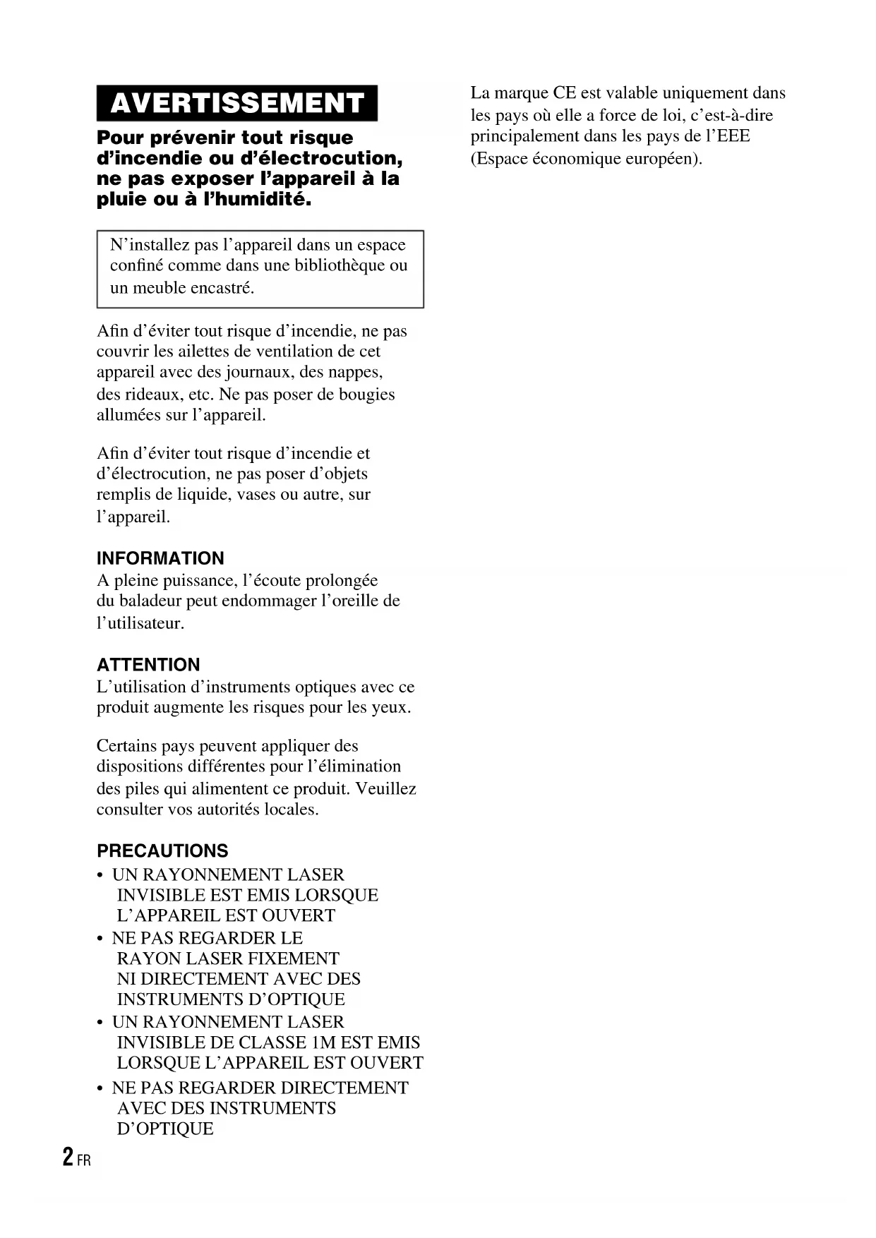 A pleine puissance, l'écoute prolongée du baladeur peut endommager l'oreille de l'utilisateur.