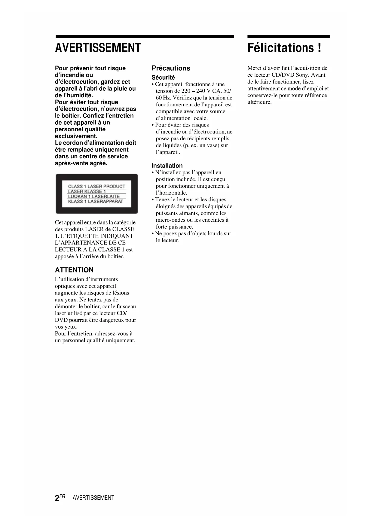 - Ne posez pas d’objets lourds sur le lecteur. Félicitations ! Merci d’avoir fait l’acquisition de ce lecteur CD/DVD Sony. Avant de le faire fonctionner, lisez attentivement ce mode d’emploi et conservez-le pour toute référence ultérieure.3