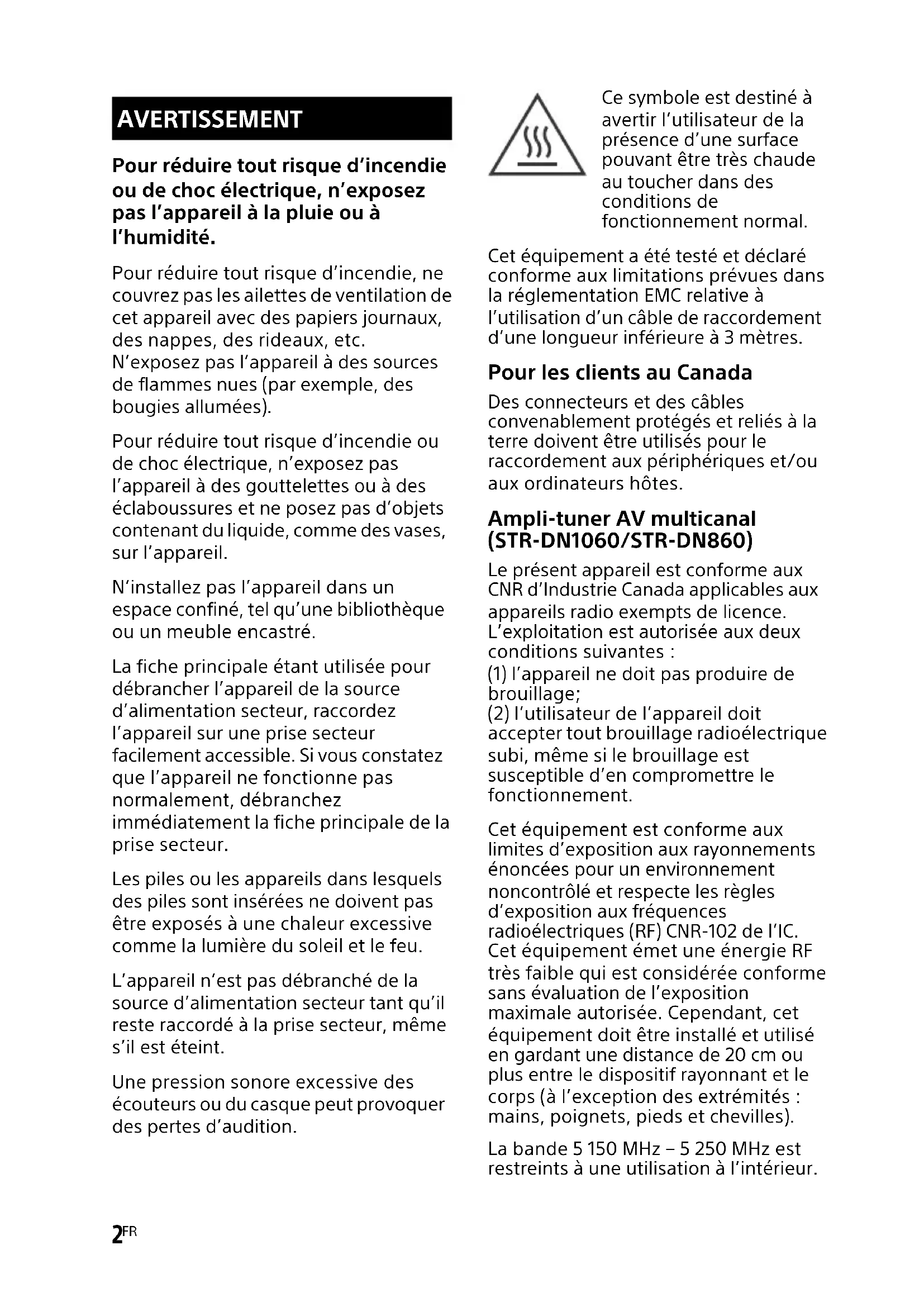 STR-DN1060/STR-DN860 4-549-564-13(1) D:\NORM'S JOB\SONY HA\SO150020\STR-DN1060_DN860_RG (PMRF 03)\4549564131_GB_UC\FR01REF_STR-DN1060-860-UC2.fm masterpage: Gauche Pour réduire tout risque d’incendie ou de choc électrique, n’exposez pas l’appareil à la pluie ou à l’humidité. Pour réduire tout risque d’incendie, ne couvrez pas les ailettes de ventilation de cet appareil avec des papiers journaux, des nappes, des rideaux, etc. N’exposez pas l’appareil à des sources de flammes nues (par exemple, des bougies allumées). Pour réduire tout risque d’incendie ou de choc électrique, n’exposez pas l’appareil à des gouttelettes ou à des éclaboussures et ne posez pas d’objets contenant du liquide, comme des vases, sur l’appareil. N’installez pas l’appareil dans un espace confiné, tel qu’une bibliothèque ou un meuble encastré. La fiche principale étant utilisée pour débrancher l’appareil de la source d’alimentation secteur, raccordez l’appareil sur une prise secteur facilement accessible. Si vous constatez que l’appareil ne fonctionne pas normalement, débranchez immédiatement la fiche principale de la prise secteur. Les piles ou les appareils dans lesquels des piles sont insérées ne doivent pas être exposés à une chaleur excessive comme la lumière du soleil et le feu. L’appareil n’est pas débranché de la source d’alimentation secteur tant qu’il reste raccordé à la prise secteur, même s’il est éteint. Une pression sonore excessive des écouteurs ou du casque peut provoquer des pertes d’audition. Ce symbole est destiné à avertir l’utilisateur de la présence d’une surface pouvant être très chaude au toucher dans des conditions de fonctionnement normal. Cet équipement a été testé et déclaré conforme aux limitations prévues dans la réglementation EMC relative à l’utilisation d’un câble de raccordement d’une longueur inférieure à 3 mètres. Pour les clients au Canada Des connecteurs et des câbles convenablement protégés et reliés à la terre doivent être utilisés pour le raccordement aux périphériques et/ou aux ordinateurs hôtes. Ampli-tuner AV multicanal (STR-DN1060/STR-DN860) Le présent appareil est conforme aux CNR d’Industrie Canada applicables aux appareils radio exempts de licence. L’exploitation est autorisée aux deux conditions suivantes : (1) l’appareil ne doit pas produire de brouillage; (2) l’utilisateur de l’appareil doit accepter tout brouillage radioélectrique subi, même si le brouillage est susceptible d’en compromettre le fonctionnement. Cet équipement est conforme aux limites d’exposition aux rayonnements énoncées pour un environnement noncontrôlé et respecte les règles d’exposition aux fréquences radioélectriques (RF) CNR-102 de l’IC. Cet équipement émet une énergie RF très faible qui est considérée conforme sans évaluation de l’exposition maximale autorisée. Cependant, cet équipement doit être installé et utilisé en gardant une distance de 20 cm ou plus entre le dispositif rayonnant et le corps (à l’exception des extrémités : mains, poignets, pieds et chevilles). La bande 5 150 MHz – 5 250 MHz est restreints à une utilisation à l’intérieur. AVERTISSEMENTD:\NORM'S JOB\SONY HA\SO150020\STR-DN1060_DN860_RG (PMRF 03)\4549564131_GB_UC\FR01REF_STR-DN1060-860-UC2.fm masterpage: Droite