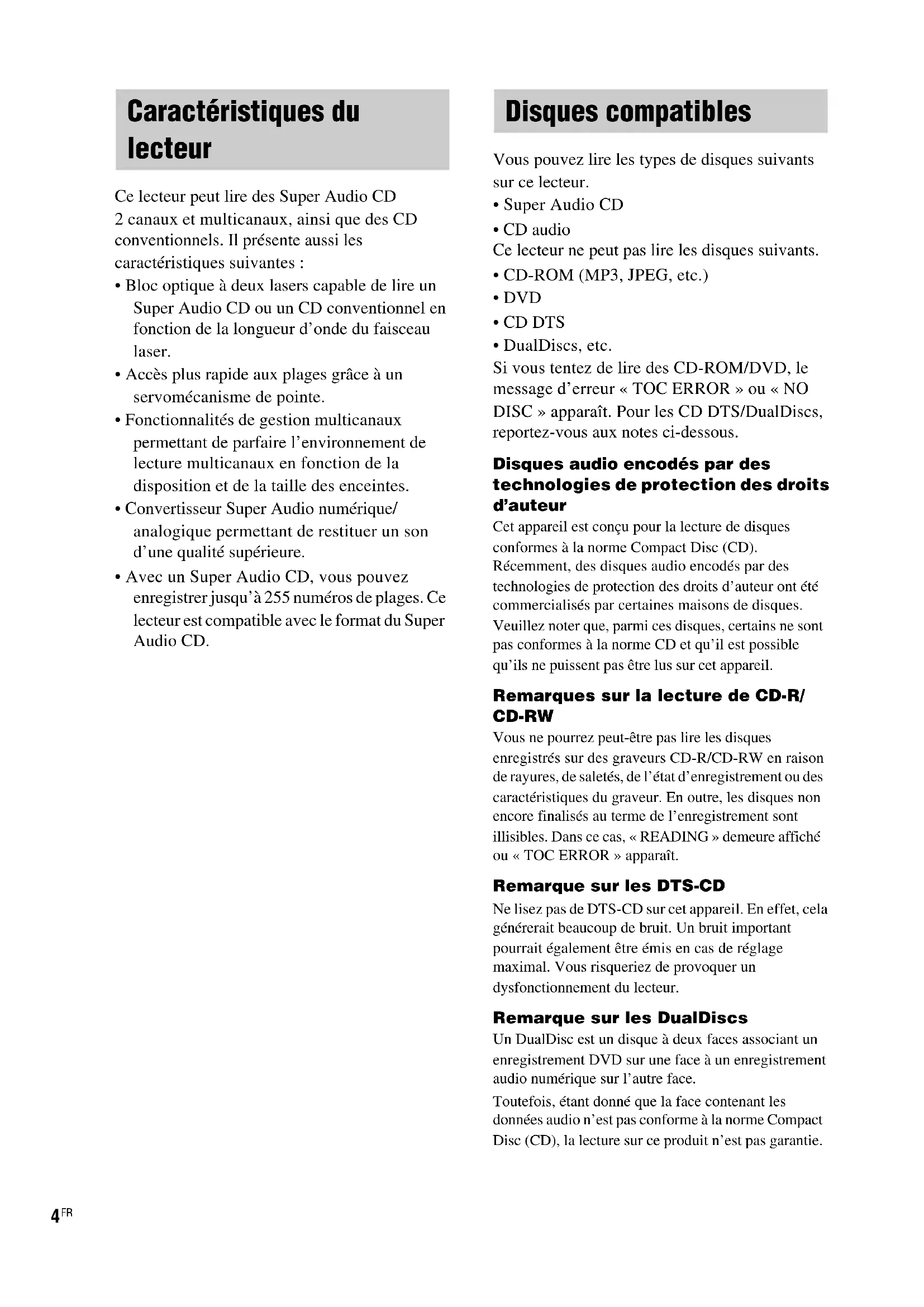 - DualDiscs, etc. Si vous tentez de lire des CD-ROM/DVD, le message d’erreur « TOC ERROR » ou « NO DISC » apparaît. Pour les CD DTS/DualDiscs, reportez-vous aux notes ci-dessous. Disques audio encodés par des technologies de protection des droits d’auteur Cet appareil est conçu pour la lecture de disques conformes à la norme Compact Disc (CD). Récemment, des disques audio encodés par des technologies de protection des droits d’auteur ont été commercialisés par certaines maisons de disques. Veuillez noter que, parmi ces disques, certains ne sont pas conformes à la norme CD et qu’il est possible qu’ils ne puissent pas être lus sur cet appareil. Remarques sur la lecture de CD-R/ CD-RW Vous ne pourrez peut-être pas lire les disques enregistrés sur des graveurs CD-R/CD-RW en raison de rayures, de saletés, de l’état d’enregistrement ou des caractéristiques du graveur. En outre, les disques non encore finalisés au terme de l’enregistrement sont illisibles. Dans ce cas, « READING » demeure affiché ou « TOC ERROR » apparaît. Remarque sur les DTS-CD Ne lisez pas de DTS-CD sur cet appareil. En effet, cela générerait beaucoup de bruit. Un bruit important pourrait également être émis en cas de réglage maximal. Vous risqueriez de provoquer un dysfonctionnement du lecteur. Remarque sur les DualDiscs Un DualDisc est un disque à deux faces associant un enregistrement DVD sur une face à un enregistrement audio numérique sur l’autre face. Toutefois, étant donné que la face contenant les données audio n’est pas conforme à la norme Compact Disc (CD), la lecture sur ce produit n’est pas garantie. Caractéristiques du lecteur Disques compatibles5