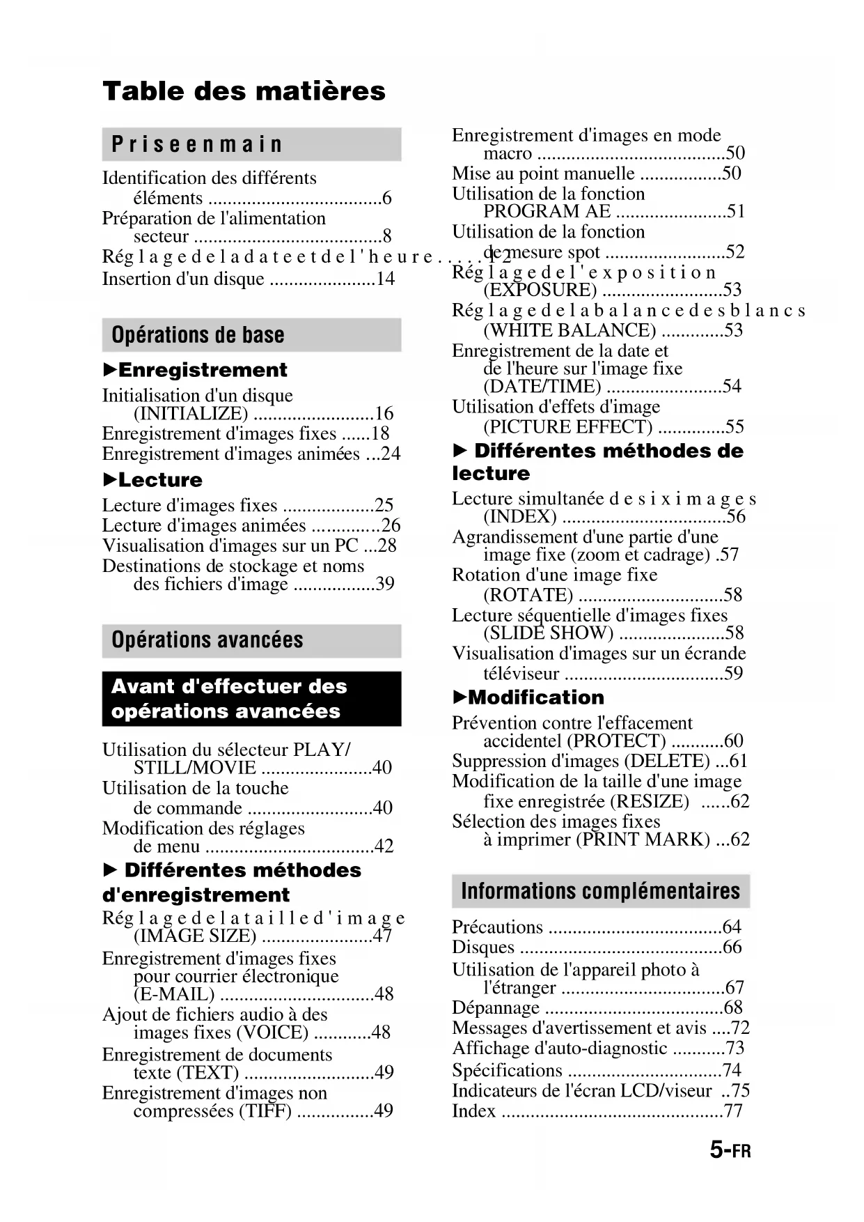 - Faites preuve de prudence lors de l'installation de l'appareil photo à proximité d'une fenêtre ou à l'extérieur. L'exposition de l'écran LCD, du viseur ou de l'objectif à la lumière directe du soleil pendant de longues périodes peut engendrer des dysfonctionnements. N'exposez pas l'appareil photo à l'humidité Lors de la prise de photos à l'extérieur, sous la pluie ou dans des conditions similaires, veillez à ne pas mouiller l'appareil photo. En présence de condensation d'humidité, reportez-vous en page 64 et respectez les instructions relatives à son élimination avant d'utiliser l'appareil photo. Recommandation de sauvegarde Pour éviter tout risque de perte de données, copiez toujours (sauvegarde) les donnéessur un disque. 01cov.book Page 3 Monday, July 24, 2000 1:01 PM4-FR masterpage:Left filename[G:\MVC kaihan\3062473221\3062473221MVCCD1000CA2\02FR- MVCCD1000CA2\02war.fm] model name1[MVC-CD1000] [3-062-473-22(1)] 01cov.book Page 4 Monday, July 24, 2000 1:01 PMmasterpage:Right filename[G:\MVC kaihan\3062473221\3062473221MVCCD1000CA2\02FR- MVCCD1000CA2\01covTOC.fm] 5-FR model name1[MVC-CD1000] [3-062-473-22(1)] Table des matières Identification des différents éléments ....................................6 Préparation de l'alimentation secteur .......................................8 Réglagedeladateetdel'heure.....12 Insertion d'un disque ......................14 B Enregistrement Initialisation d'un disque (INITIALIZE) .........................16 Enregistrement d'images fixes ......18 Enregistrement d'images animées ...24 B Lecture Lecture d'images fixes ...................25 Lecture d'images animées ..............26 Visualisation d'images sur un PC ...28 Destinations de stockage et noms des fichiers d'image .................39 Utilisation du sélecteur PLAY/ STILL/MOVIE .......................40 Utilisation de la touche de commande ..........................40 Modification des réglages de menu ...................................42 B Différentes méthodes d'enregistrement Réglagedelatailled'image (IMAGE SIZE) .......................47 Enregistrement d'images fixes pour courrier électronique (E-MAIL) ................................48 Ajout de fichiers audio à des images fixes (VOICE) ............48 Enregistrement de documents texte (TEXT) ...........................49 Enregistrement d'images non compressées (TIFF) ................49 Enregistrement d'images en mode macro .......................................50 Mise au point manuelle .................50 Utilisation de la fonction PROGRAM AE .......................51 Utilisation de la fonction de mesure spot .........................52 Réglagedel'exposition (EXPOSURE) .........................53 Réglagedelabalancedesblancs (WHITE BALANCE) .............53 Enregistrement de la date et de l'heure sur l'image fixe (DATE/TIME) ........................54 Utilisation d'effets d'image (PICTURE EFFECT) ..............55 B Différentes méthodes de lecture Lecture simultanéedesiximages (INDEX) ..................................56 Agrandissement d'une partie d'une image fixe (zoom et cadrage) .57 Rotation d'une image fixe (ROTATE) ..............................58 Lecture séquentielle d'images fixes (SLIDE SHOW) ......................58 Visualisation d'images sur un écrande téléviseur .................................59 B Modification Prévention contre l'effacement accidentel (PROTECT) ...........60 Suppression d'images (DELETE) ...61 Modification de la taille d'une image fixe enregistrée (RESIZE) ......62 Sélection des images fixes à imprimer (PRINT MARK) ...62 Précautions ....................................64 Disques ..........................................66 Utilisation de l'appareil photo à l'étranger ..................................67 Dépannage .....................................68 Messages d'avertissement et avis ....72 Affichage d'auto-diagnostic ...........73 Spécifications ................................74 Indicateurs de l'écran LCD/viseur ..75 Index ..............................................77 Priseenmain Opérations de base Opérations avancées Avant d'effectuer des opérations avancées Informations complémentaires 01cov.book Page 5 Monday, July 24, 2000 1:01 PMfilename[G:\MVC kaihan\3062473221\3062473221MVCCD1000CA2\02FR- MVCCD1000CA2\03PRE.fm] masterpage:Left 6-FR model name1[MVC-CD1000] [3-062-473-22(1)] Priseenmain Identification des différents éléments Reportez-vous aux pages indiquées entre parenthèses pour plus d'informations. A Flash (22) B Microphone intégré Ne le touchez pas pendant l'enregistrement. C Témoin du retardateur/témoin d'enregistrement (22, 24)D Déclencheur d'obturateur(18, 24)E Levier de zoom (20)F Fenêtredelacellule photoélectrique pour le flash Ne l'obstruez pas en cours d'enregistrement. G Baguedemiseaupoint(50)H Objectif I Prise DIGITAL I/O (34) J Bouton PROGRAM AE (51) K Bouton WHITE BALANCE (53)L Griffe porte-accessoiresM Bouton OPEN (FLASH) (22)N Bouton (balance desblancs manuelle) (53)O Prise (flash externe)P Levier d'ouverture OPEN du couvercle du compartiment à disque (15)Q Capuchon d'objectif (fourni)R Commutateur STEADY SHOTON/OFF (21)S Commutateur FOCUS AUTO/MANUAL (50)T Prise A/V OUT (MONO) (59) La sortie audio est de type monaural. U Boutons PROGRAM AE +/– (51)
