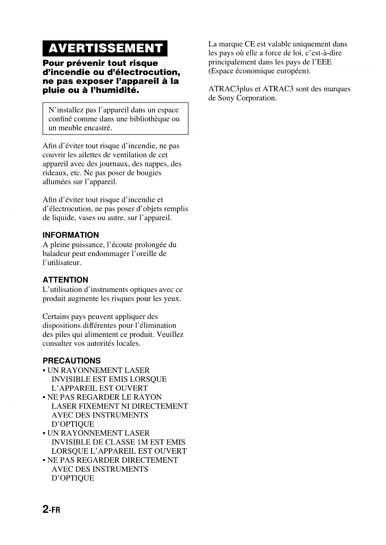syntonisation (29) 10 kHz Annulation de toutes les stations OPTION TUNER PRESET Clear? programmées (28) *1 Vous pouvez effectuer ces réglages lorsque la lecture est arrêtée. *2 Réglage par défaut. Si vous avez modifié le réglage, le las de temps déjà défini apparaît. *3 Pour CD ATRAC uniquement *4 Les réglages par défaut varient selon le lieu d’achat du lecteur CD.34-FR Précautions Sécurité