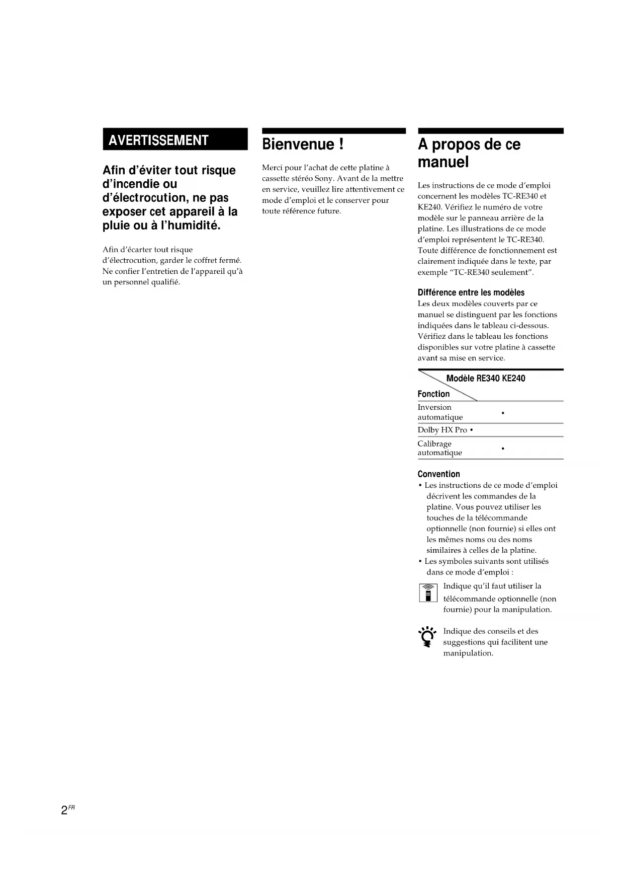 Merci pour l'achat de cette platine à cassette stéreo Sony. Avant de la mesure en service, veuilles lire attentivement ce mode d'emploi et le conserver pour toute reférence future.