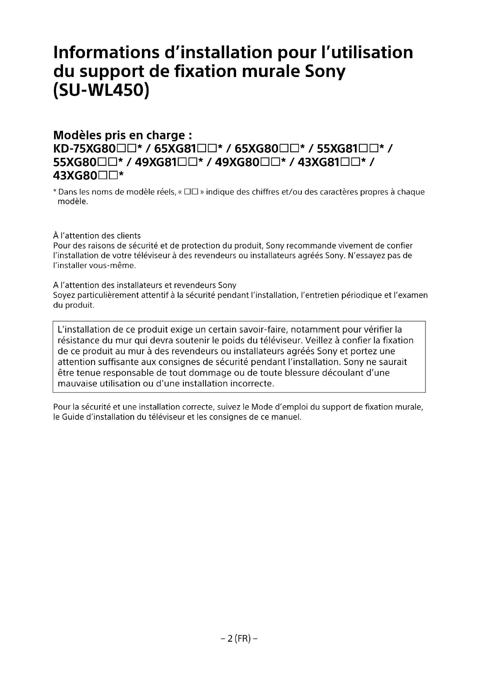 L'installation de ce produit exige un certain savoir-faire. Lisez ce mode d'emploi attentivement afin de proceeder à l'installation en toute sécurité. Sony ne saurait être tenue responsable de tout dommage ou de toute blessure découulant d'une mauvaise utilisation ou d'une installation incorrecte. Une fois l'installation terminée, veuillez remetre ce manuel d'installation au client.