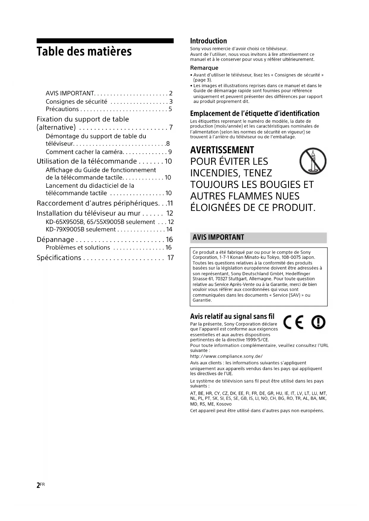 ÉLOIGNÉES DE CE PRODUIT. Avis relatif au signal sans fil Par la présente, Sony Corporation déclare que l’appareil est conforme aux exigences essentielles et aux autres dispositions pertinentes de la directive 1999/5/CE.Pour toute information complémentaire, veuillez consultez l’URL suivante :http://www.compliance.sony.de/Avis aux clients : les informations suivantes s’appliquent uniquement aux appareils vendus dans les pays qui appliquent les directives de l’UE.Le système de télévision sans fil peut être utilisé dans les pays sui vants :AT, BE, HR, CY, CZ, DK, EE, FI, FR, DE, GR, HU, IE, IT, LV, LT, LU, MT, NL, PL, PT, SK, SI, ES, SE, GB, IS, LI, NO, CH, BG, RO, TR, AL, BA, MK, MD, RS, ME, KosovoCet appareil peut être utilisé dans d’autres pays non européens. AVIS IMPORTANT Ce produit a été fabriqué par ou pour le compte de Sony Corporation, 1-7-1 Konan Minato-ku Tokyo, 108-0075 Japon. Toutes les questions relatives à la conformité des produits basées sur la législation européenne doivent être adressées à son représentant, Sony Deutschland GmbH, Hedelfinger Strasse 61, 70327 Stuttgart, Allemagne. Pour toute question relative au Service Après-Vente ou à la Garantie, merci de bien vouloir vous référer aux coordonnées qui vous sont communiquées dans les documents «Service (SAV)» ou Garantie.3