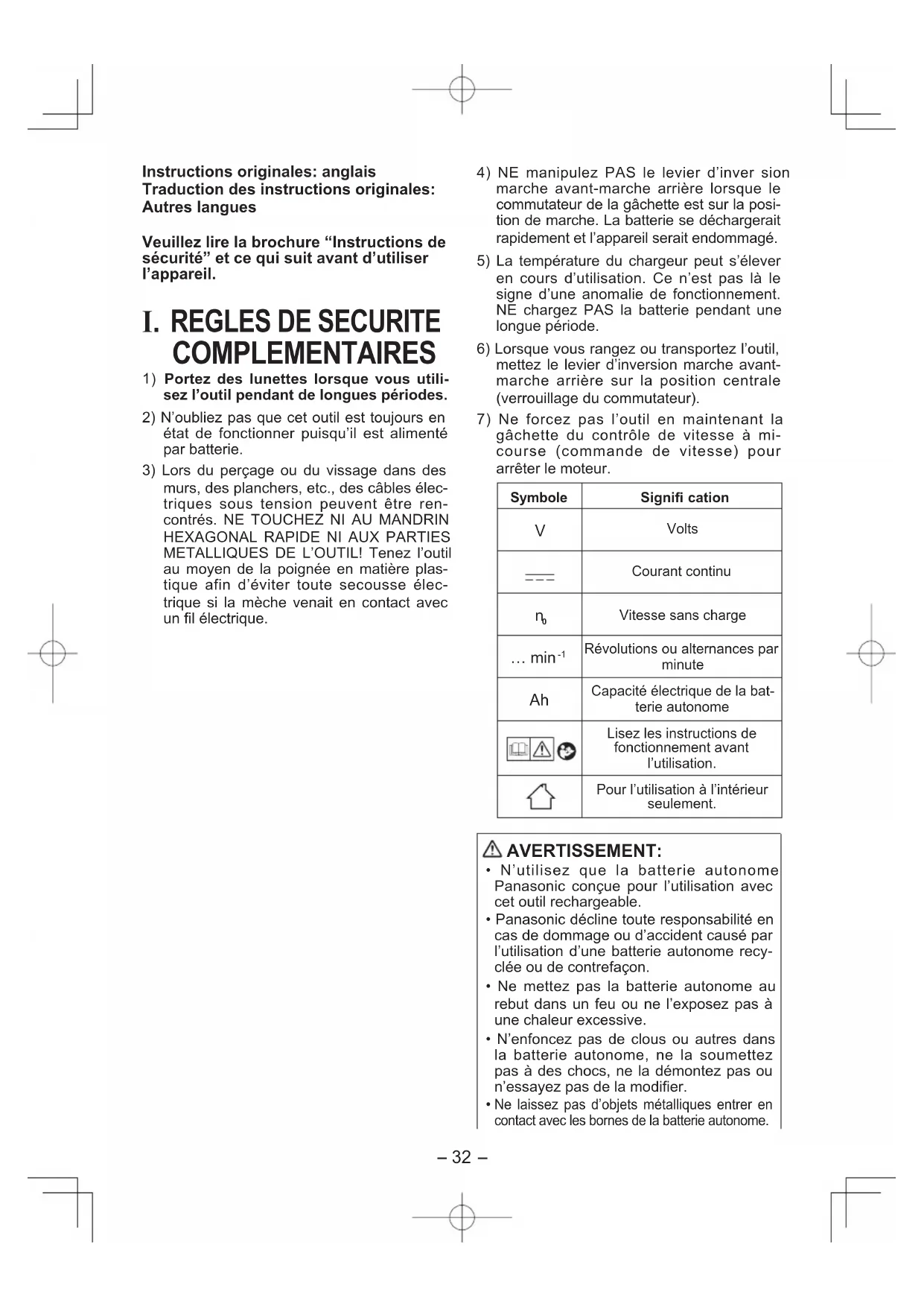- N'utilisez que la batterie autonome Panasonic conçue pour l'utilisation avec cet outil rechargeable.