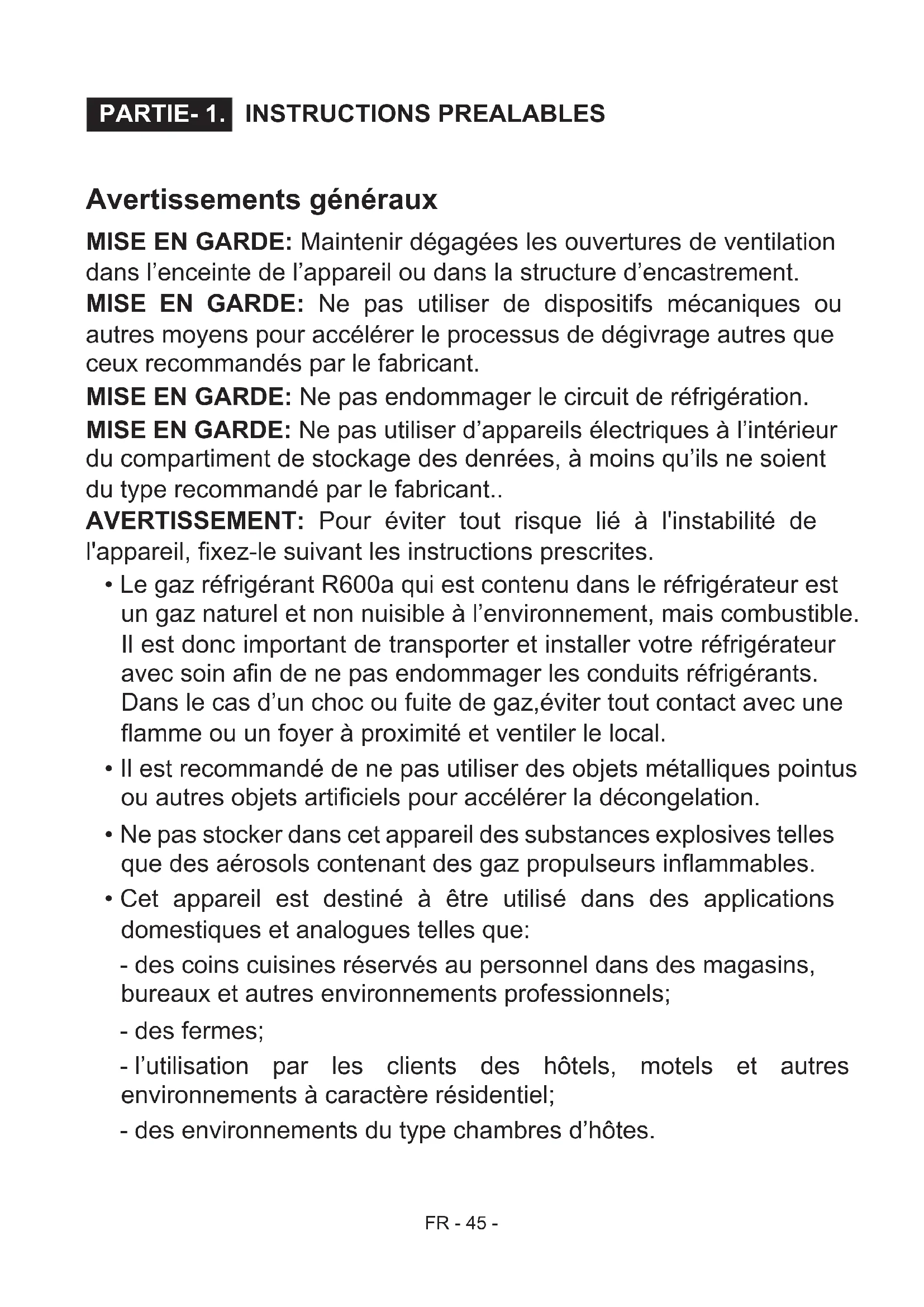 MISE EN GARDE: Ne pas utiliser de dispositifs mécaniques ou autres moyens pour accélérer le processus de dégivrage autres que ceux recommendés par le fabricant.
