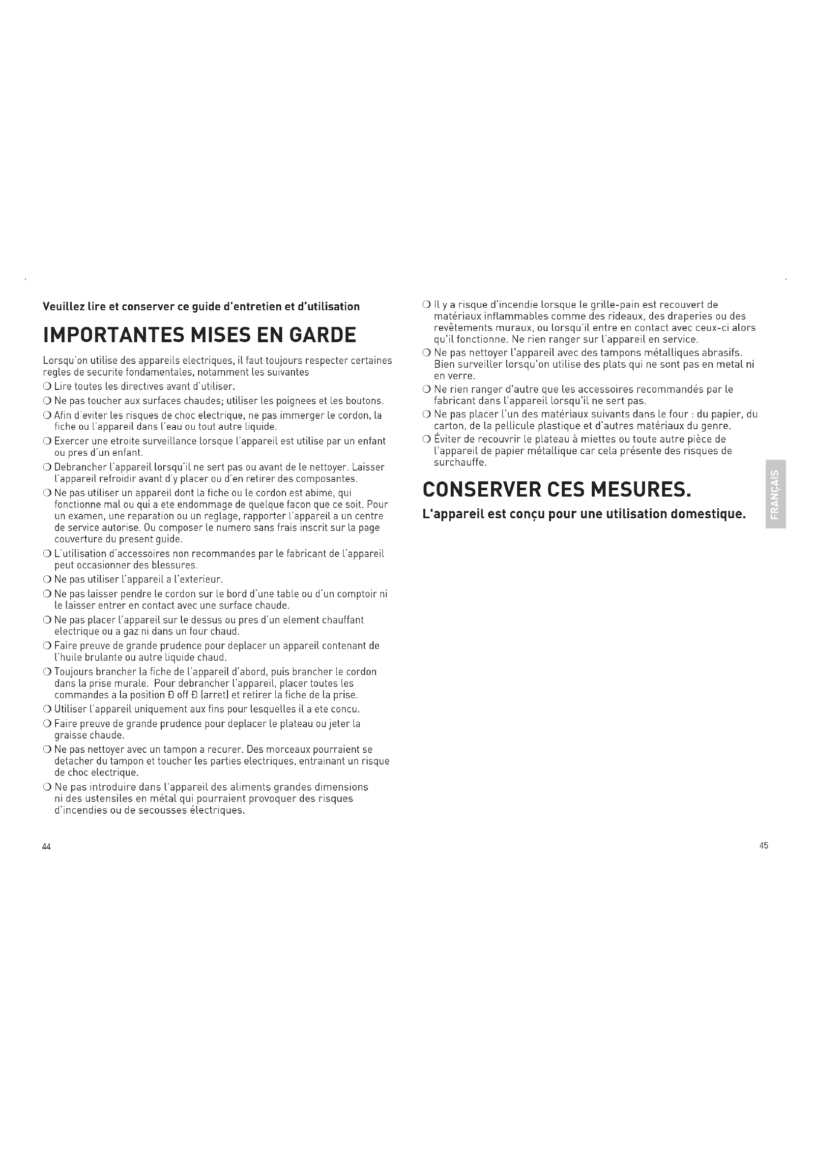 Il y a risque d'incendie lorsque le grille-pain est recouvert de matériaux inflammables comme des rideaux, des draperies ou des revêtements muraux, ou lorsqu'il entre en contact avec ceux-ci alors qu'il fonctionne. Ne rien ranger sur l'appareil en service.