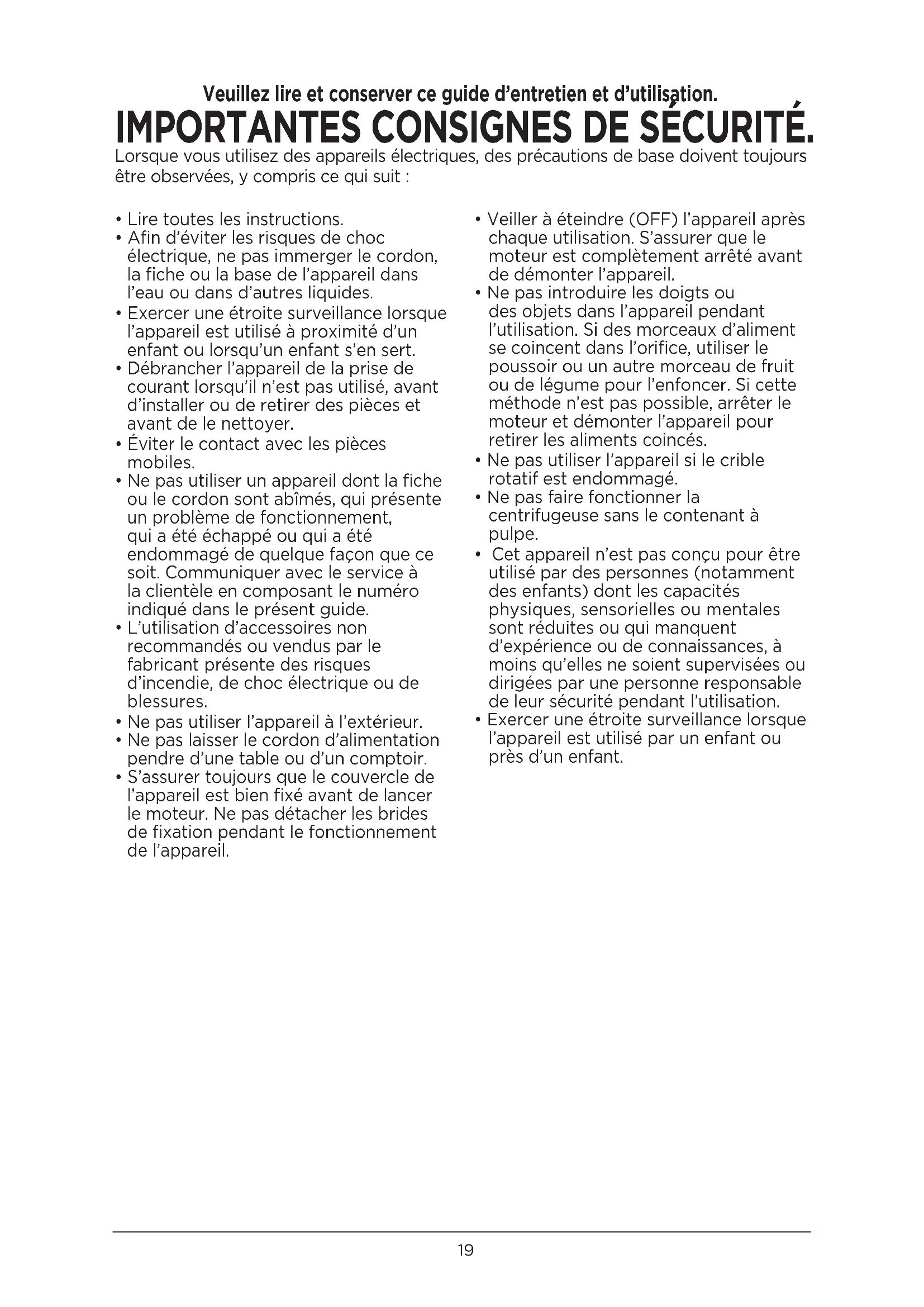 IMPORTANTES CONSIGNES DE SECURITÉ.