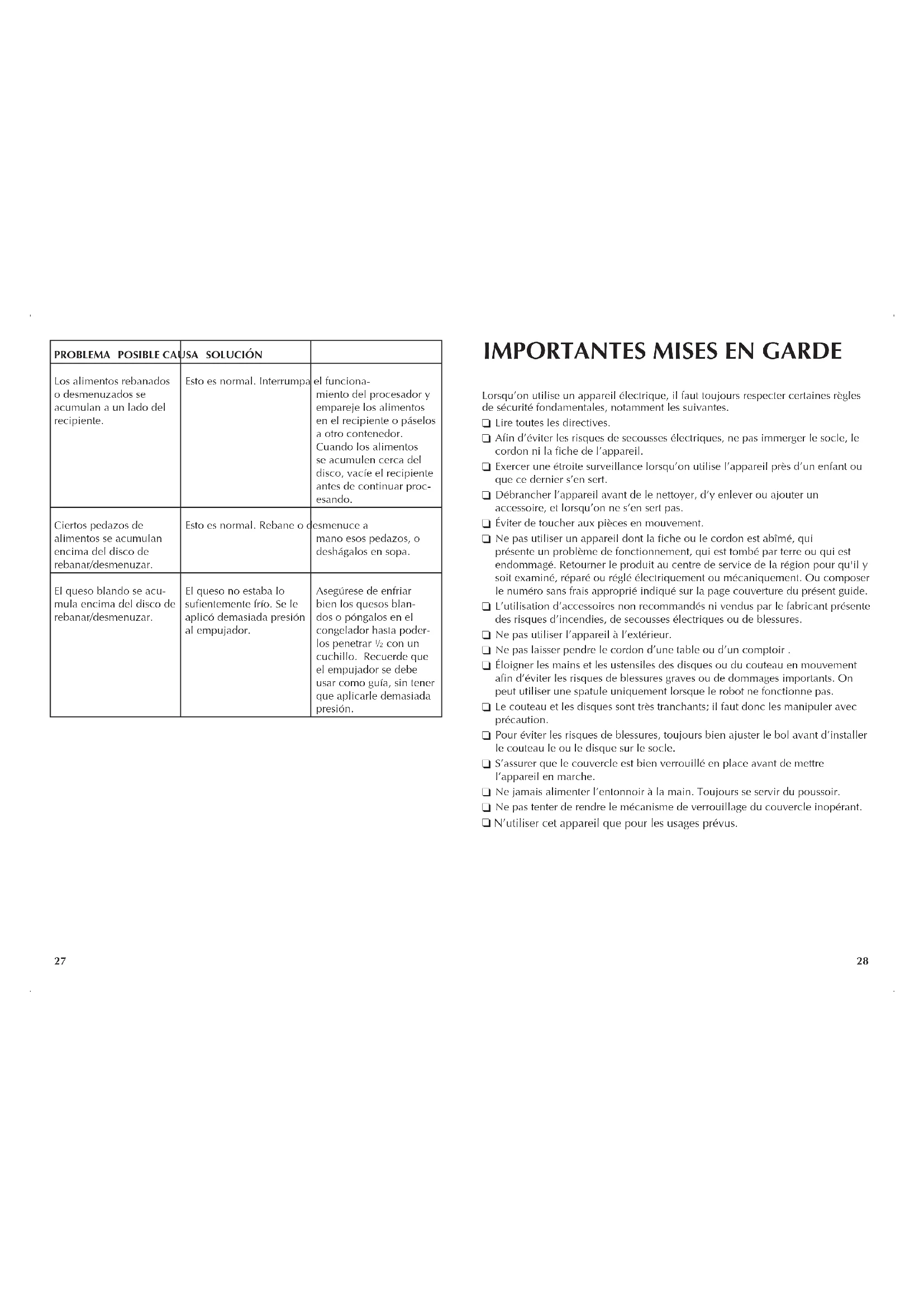 - Éloigner les mains et les ustensiles des disques ou du couteau en mouvement afin d'éviter les risques de blessures graves ou de dommages importants. On peut utiliser une spatule uniquement lorsque le robot ne fonctionne pas.