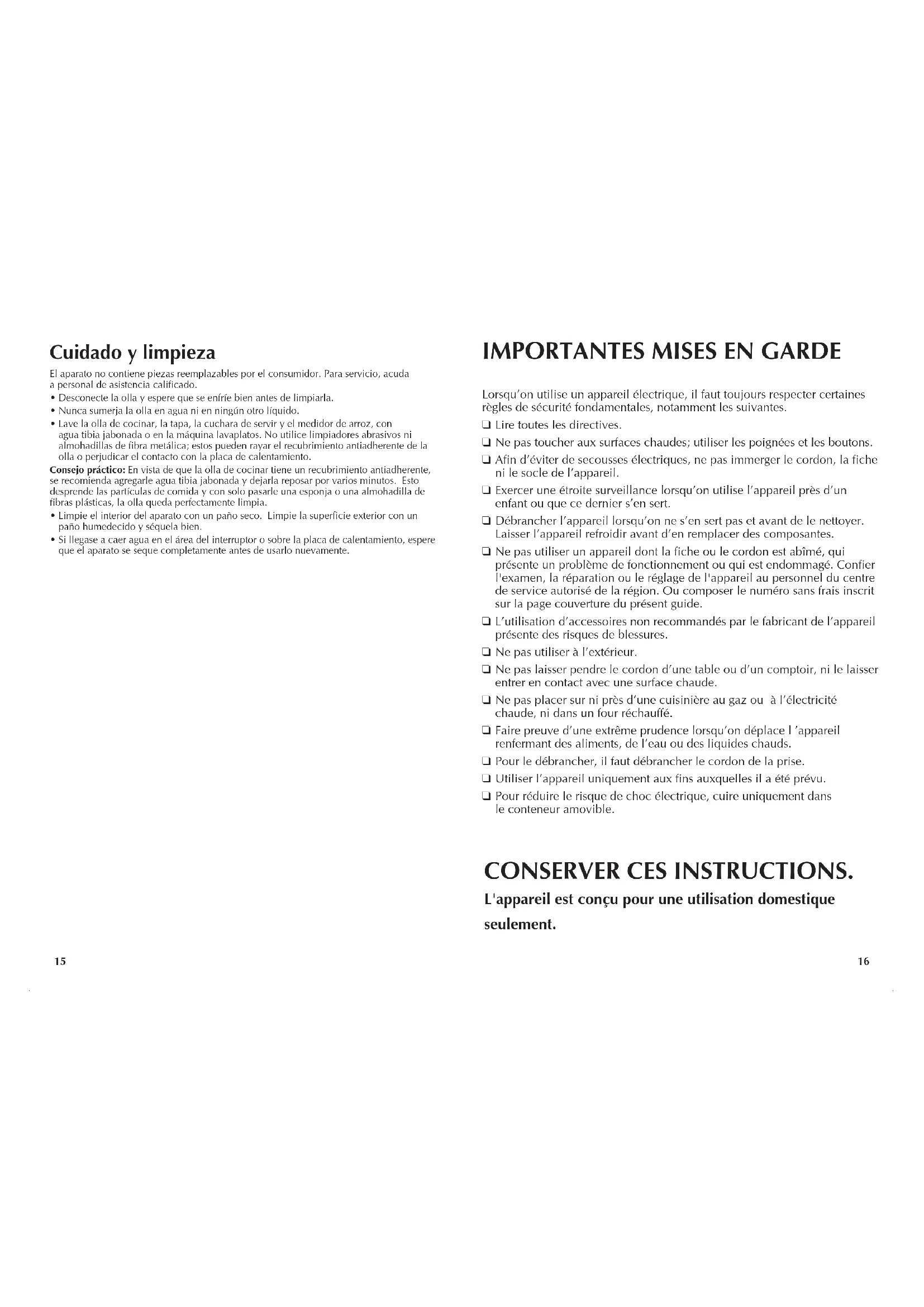 Laver le bol de cuisson, le couvercle, la cuillerde service et la tasse a mesurer dans I'eau tiéde savonneuse ou dans le lave-vaiselle. Ne pas utiliser de nettoyants abrasifs ni de tampon a récurer metallique puisque certains risquenc d'égratigner la surface antiadhésive ou d'entraîner un mauvais contact avec la plaque chauffante.
