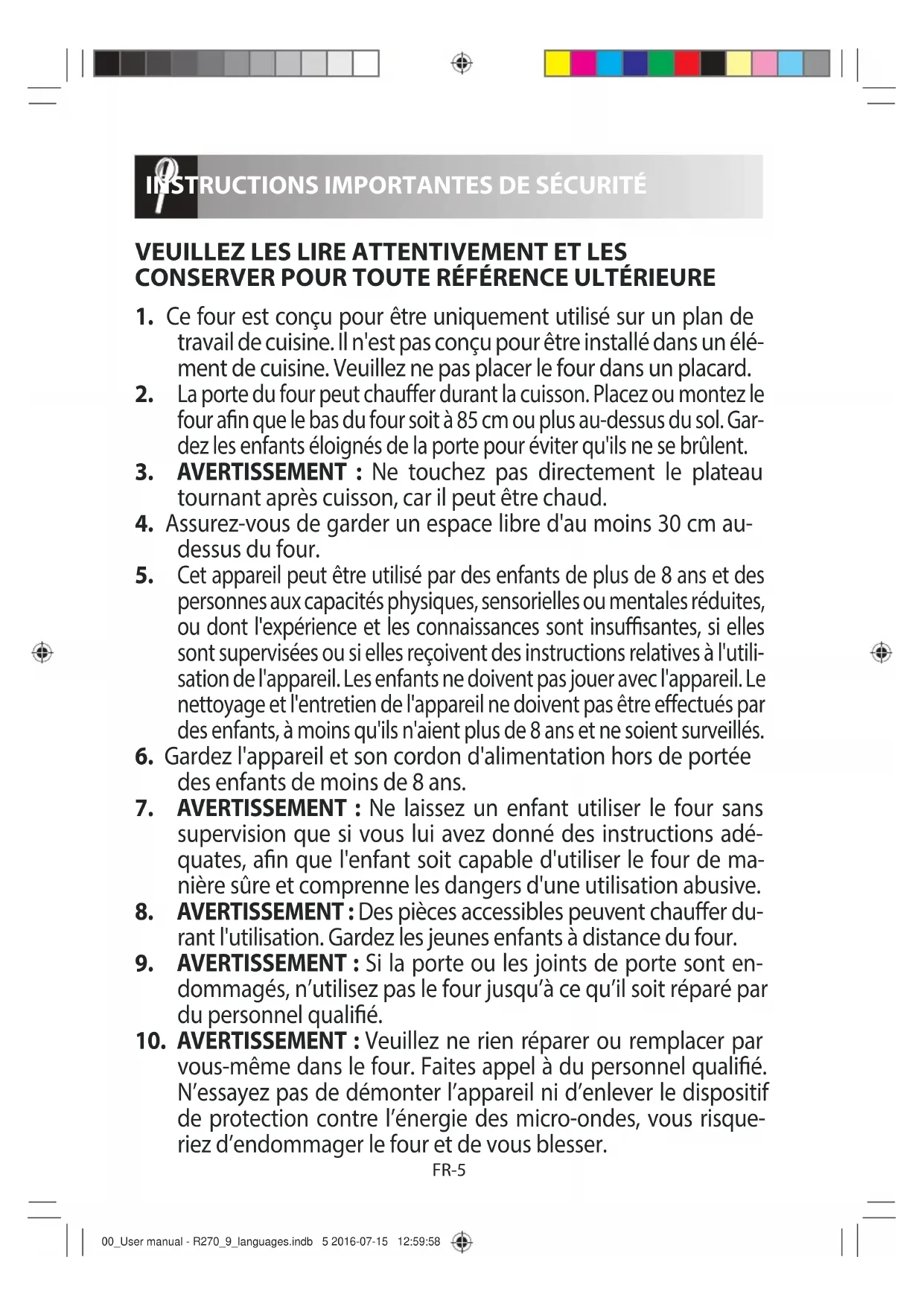 La porte, le boîtier extérieur, la cavité du four et le plateau tournant peuvent devenir très chauds durant le fonctionnement. Pour éviter de vous brûler, utilisez toujours d'épais gants de cuisine anti-chaleur pour four. 00_User manual - R270_9_languages.indb 3 2016-07-15 12:59:58FR-4
