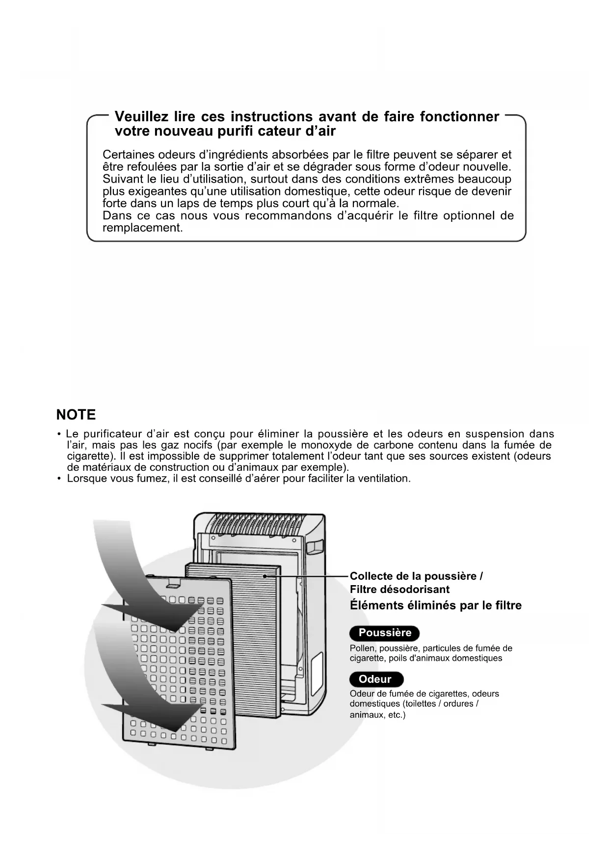 - Lorsque vous fumez, il est conseillé d’aérer pour faciliter la ventilation. Pollen, poussière, particules de fumée de cigarette, poils d'animaux domestiques Collecte de la poussière / Filtre désodorisant Éléments éliminés par le filtre Odeur de fumée de cigarettes, odeurs domestiques (toilettes / ordures / animaux, etc.) Odeur Poussière KC-930EUfre.indd2KC-930EUfre.indd2 2009/09/1111:12:062009/09/1111:12:06FRANÇAIS F-1 FRANÇAIS Nous vous remercions pour l’achat du Purificateur d’Air SHARP. Veuillez lire ce manuel intégralement pour vous assurer d’un usage correct de l’appareil. Avant d’utiliser le produit, assurez-vous d’avoir lu la section : « Instructions de sécurité importantes » Après avoir lu le manuel, gardez-le à portée de main pour future référence.