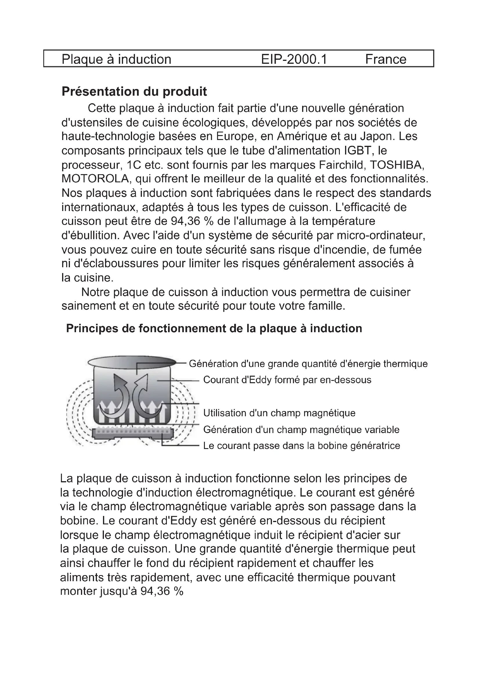 Principes de fonctionnement de la plaque à induction Génération d'une grande quantité d'énergie thermique Courant d'Eddy formé par en-dessous Utilisation d'un champ magnétique Génération d'un champ magnétique variable Le courant passe dans la bobine génératrice La plaque de cuisson à induction fonctionne selon les principes de la technologie d'induction électromagnétique. Le courant est généré via le champ électromagnétique variable après son passage dans la bobine. Le courant d'Eddy est généré en-dessous du récipient lorsque le champ électromagnétique induit le récipient d'acier sur la plaque de cuisson. Une grande quantité d'énergie thermique peut ainsi chauffer le fond du récipient rapidement et chauffer les aliments très rapidement, avec une efficacité thermique pouvant Air vent Fiche technique Numéro de modèle : EIP-2000.1 Alimentation : Plage d'alimentation : 2000W Plage du thermostat : 80°C-270°C Minuteur/programmateur : 3/|? heures Noms des composants Cordon d'alimentation et prise Bouche d'aspiration de l'air Plaque de cristal Panneau de contrôle 230V~ 50Hz Schéma des fonctionsMode d'emploi