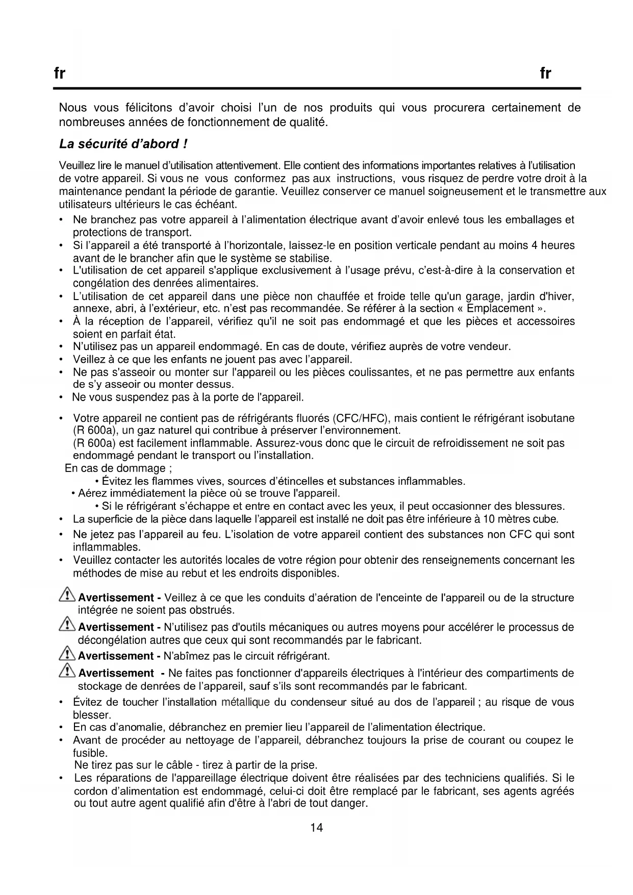 - Veuillez contacter les autorités locales de votre région pour obtenir des renseignements concernant les méthodes de mise au rebut et les endroits disponibles. Avertissement - Veillez à ce que les conduits d’aération de l'enceinte de l'appareil ou de la structure intégrée ne soient pas obstrués. Avertissement - N’utilisez pas d'outils mécaniques ou autres moyens pour accélérer le processus de décongélation autres que ceux qui sont recommandés par le fabricant. Avertissement - N’abîmez pas le circuit réfrigérant. Avertissement - Ne faites pas fonctionner d'appareils électriques à l'intérieur des compartiments de stockage de denrées de l’appareil, sauf s’ils sont recommandés par le fabricant.