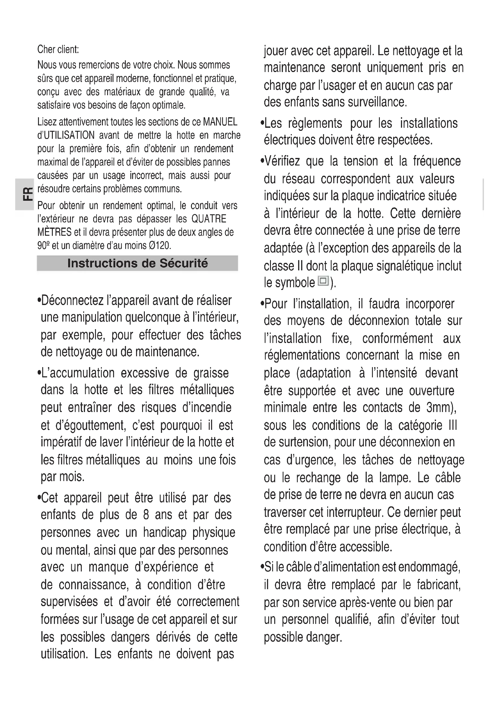Problem solving Proceed with the following checks before calling the Technical Service: Problem Possible cause Solution The kitchen hood does not work. The mains cable is not connected to the network. There is no current in the network. Connect the mains cable to the network. Provide current to the network. The kitchen hood does not extract sufficiently or vibrates. Filters are saturated with fat. Obstruction in the air outlet. Change or clean the active charcoal and/or metal filters. Remove the obstruction.FR Cher client: Nous vous remercions de votre choix. Nous sommes sûrs que cet appareil moderne, fonctionnel et pratique, conçu avec des matériaux de grande qualité, va satisfaire vos besoins de façon optimale. Lisez attentivement toutes les sections de ce MANUEL d’UTILISATION avant de mettre la hotte en marche pour la première fois, afin d’obtenir un rendement maximal de l’appareil et d’éviter de possibles pannes causées par un usage incorrect, mais aussi pour résoudre certains problèmes communs. Pour obtenir un rendement optimal, le conduit vers l’extérieur ne devra pas dépasser les QUATRE MÈTRES et il devra présenter plus de deux angles de 90º et un diamètre d’au moins Ø120.