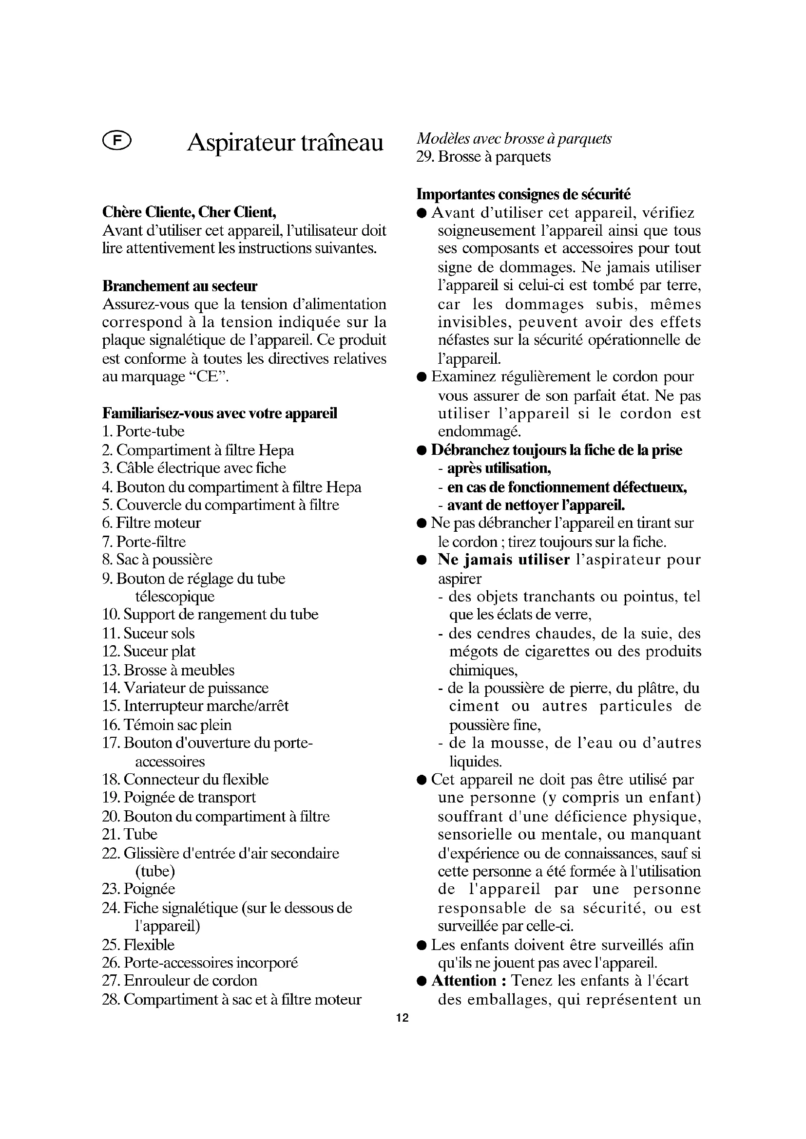 Aspirateur traîneau risque potentiel, par exemple, de suffocation. ● Avant de brancher l’aspirateur sur la prise murale, vérifiez que le sac à poussière n’est pas endommagé. Ne faites pas fonctionner l’aspirateur - sans sac, ou si le sac est endommagé, - si le témoin sac plein poussière indique que le sac est plein, - si le filtre moteur n'est pas installé. ● Ne pas utiliser un aspirateur sur des personnes ou animaux car il y a risque de blessure, particulièrement au niveau des oreilles et des yeux. Tenez toujours les suceurs éloignés de la tête. ● Nous déclinons toute responsabilité pour les dommages éventuels subis par cet appareil résultant d’une utilisation incorrecte ou du non-respect de ce mode d’emploi. ● Cet appareil est destiné à un usage domestique uniquement et non pas à un usage professionnel. ● Afin de se conformer aux normes de sécurité en vigueur et d’éviter tout risque, la réparation d’appareils électriques, y compris le remplacement d’un cordon d’alimentation, doit être effectuée par un agent qualifié. En cas de panne, envoyez votre appareil à un de nos centres de service après-vente agréés dont vous trouverez la liste en annexe de ce mode d’emploi. Avant de l’utiliser pour la première fois
