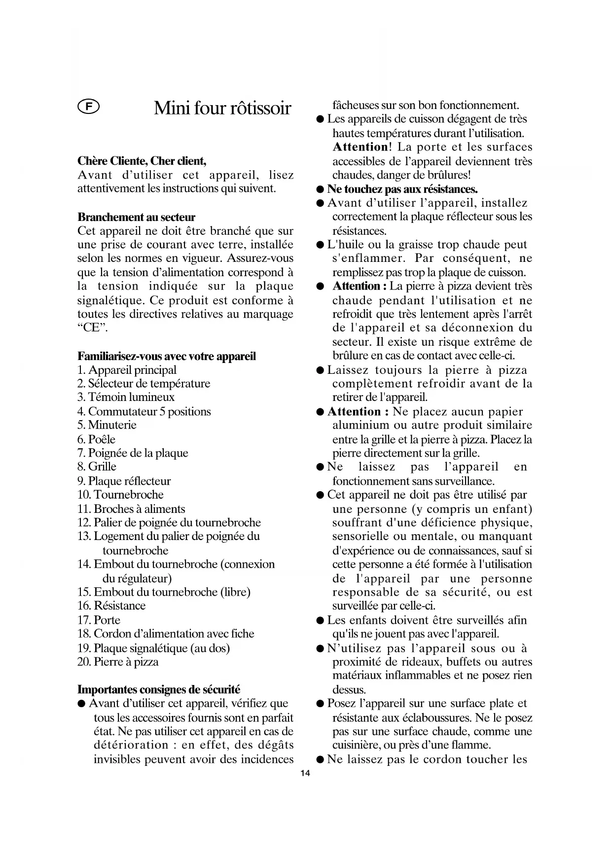 Mini four rôtissoir surfaces chaudes de l’appareil. ● Ne laissez pas pendre le cordon. ● Eteignez l’appareil et débranchez-le de la prise secteur après utilisation et aussi dans les cas suivants : - mauvais fonctionnement - pendant le nettoyage. ● Pour débrancher le cordon de la prise murale, ne tirez jamais sur le câble mais servez-vous de la fiche. ● L'appareil n'est pas destiné à être utilisé avec un programmateur externe ou une télécommande indépendante. ● Le fabricant décline toute responsabilité en cas de dégâts dus à une mauvaise utilisation ou au non-respect des consignes de sécurité. ● Cet appareil est destiné uniquement à un usage domestique et ne doit pas servir à un usage professionnel. ● En conformité avec les règlements et par mesure de sécurité, faites effectuer les réparations d’appareils électriques, y compris le remplacement du cordon électrique, par un technicien qualifié. En cas de panne, envoyez l’appareil à un de nos services après-vente. Vous trouverez les adresses dans l’annexe de ce manuel. Sélecteur de température Le sélecteur de température sera utilisé pour choisir le niveau de cuisson souhaité. Le témoin lumineux s’allume quand la minuterie est activée. Il s’éteint dès que la température a atteint le niveau requis. Les 5 positions de réglage du commutateur Les deux résistances et le tournebroche sont hors tension Résistance supérieure Résistance supérieure avec tournebroche Résistance supérieure et chaleur inférieure Résistance inférieure Les résistances ne se mettent en marche qu’une fois la minuterie activée. Minuterie Le temps de cuisson (max. 60 minutes) peut être présélectionné à l'aide de la minuterie. Le voyant lumineux reste allumé aussi longtemps qu'une résistance est sous tension. Dès que le temps de cuisson présélectionné est écoulé, un signal sonore retentit et les résistances s'éteignent. Pour éteindre complètement l'appareil, vous devez mettre le commutateur hors tension. Fonction d’air chaud Le ventilateur d’air chaud est activé automatiquement quand les résistances sont mises sous tension. Tournebroche Seule la fonction résistance supérieure est utilisée avec le tournebroche.
