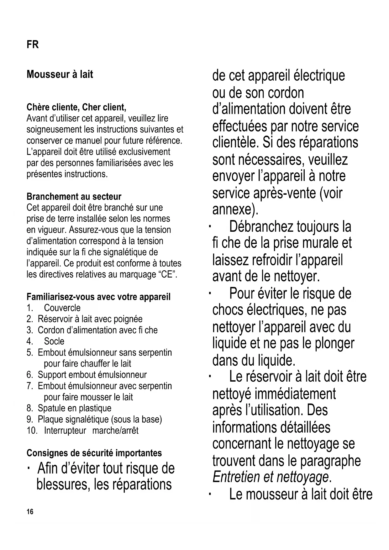 Consignes de sécurité importantes ∙ A fi n d’éviter tout risque de blessures, les réparations de cet appareil électrique ou de son cordon d’alimentation doivent être effectuées par notre service clientèle. Si des réparations sont nécessaires, veuillez envoyer l’appareil à notre service après-vente (voir annexe). ∙ Débranchez toujours la fi che de la prise murale et laissez refroidir l’appareil avant de le nettoyer. ∙ Pour éviter le risque de chocs électriques, ne pas nettoyer l’appareil avec du liquide et ne pas le plonger dans du liquide. ∙ Le réservoir à lait doit être nettoyé immédiatement après l’utilisation. Des informations détaillées concernant le nettoyage se trouvent dans le paragraphe Entretien et nettoyage. ∙ Le mousseur à lait doit être FR17 uniquement utilisé avec le socle désigné fourni. ∙ Les connexions électriques dans le socle doivent être protégées en permanence contre tout contact éventuel avec l’eau. ∙ Servez-vous toujours de la poignée du réservoir à lait car la surface peut être chaude pendant et après l’utilisation. ∙ Attention : Une mauvaise utilisation peut provoquer des blessures corporelles graves. ∙ Cet appareil est destiné à une utilisation domestique ou similaire, telle que - dans les cuisines pour personnel, dans des bureaux et autres locaux commerciaux, - dans des organisations agricoles, - par la clientèle dans les hôtels, motels et hébergements similaires, - et dans des maisons d’hôtes. ∙ Cet appareil peut être utilisé par des enfants (à partir de 8 ans) et par des personnes souffrant de défi ciences physiques, sensorielles ou mentales, ou manquant d’expérience ou de connaissances, s’ils ont été formés à l’utilisation de l’appareil et ont été supervisés, et s’ils en comprennent les dangers et les précautions de sécurité à prendre. ∙ Les enfants ne sont pas autorisés à jouer avec l’appareil. ∙ Les enfants ne doivent pas être autorisés à nettoyer ou entretenir l’appareil à moins d’être supervisés et d’avoir plus de 8 ans.18 ∙ L’appareil et son cordon d’alimentation doivent être, à tout moment, tenus hors de portée des enfants de moins de 8 ans. ∙ Attention : Tenez les enfants à l’écart des emballages, qui représentent un risque potentiel, par exemple, de suffocation. ∙ Avant toute utilisation, vérifi ez soigneusement que l’appareil, son cordon d’alimentation et ses accessoires ne présentent aucun signe de détérioration qui pourrait avoir un effet néfaste sur la sécurité de fonctionnement de l’appareil. Au cas où l’appareil, par exemple, serait tombé sur une surface dure, ou si une force excessive aurait été employée pour tirer sur le cordon d’alimentation, il ne doit plus être utilisé. ∙ Cet appareil est conçu pour réchauffer et faire mousser le lait uniquement. Ne mettre aucun autre liquide ou aliment solide dans le réservoir. ∙ Ne pas laisser le mousseur à lait sans surveillance lorsqu’il est en marche. ∙ Respectez les niveaux maximum à l’intérieur du réservoir à chaque utilisation. ∙ Pour éviter une telle surchauffe, l’appareil s’éteindra automatiquement s’il est mis en marche à vide. Si tel est le cas, le témoin lumineux s’éteint. Débranchez la fi che et laissez refroidir l’appareil. ∙ Attention : Un remplissage excessif du réservoir peut se révéler dangereux car la mousse de lait risque de déborder du réservoir pendant la préparation. ∙ Attention : Le couvercle doit être en place à chaque utilisation; il ne doit être enlevé que pour ajouter la poudre de cacao ou autres ingrédients. ∙ L’appareil doit être utilisé uniquement avec les accessoires d’origine fournis par le fabricant. ∙ L’appareil doit toujours être posé sur une surface solide et stable. ∙ Ne laissez jamais le boîtier ou le cordon d’alimentation entrer en contact avec une fl amme ou une surface chaude telle qu’une plaque chauffante. ∙ Ne laissez pas le cordon d’alimentation pendre librement ; le cordon devra toujours être tenu à l’écart des surfaces brûlantes de l’appareil. ∙ Débranchez toujours la fi che de la prise murale - en cas de fonctionnement défectueux, - après l’emploi, - avant de nettoyer l’appareil. ∙ Ne débranchez pas l’appareil en tirant sur le cordon ; tirez toujours sur la fi che. ∙ Nous déclinons toute responsabilité en cas de dommages éventuels subis par cet appareil, résultant d’une utilisation incorrecte ou du non-respect de ce mode d’emploi. Avant la première utilisation Retirez tous les emballages et assurez-vous que tous les éléments de l’appareil sont présents. Avant la première utilisation, et après toute période prolongée de non utilisation, l’appareil doit être soigneusement19 nettoyé en suivant la méthode décrite au paragraphe Entretien et nettoyage. Opération ∙ Nous vous recommandons l’utilisation d’un lait à haute contenance protéinique. Pour de meilleurs résultats, le lait doit sortir du réfrigérateur juste avant l’opération. ∙ Assurez-vous toujours que la surface de contact entre la base et le réservoir à lait est propre et sèche. Choix de l’embout émulsionneur ∙ Pour faire mousser le lait, installez l’embout émulsionneur avec le serpentin sur le support embout émulsionneur, son côté plat vers le bas. ∙ Pour faire simplement chauffer le lait, installez l’embout émulsionneur sans le serpentin sur le support embout émulsionneur, son côté plat vers le bas. ∙ L’anneau en caoutchouc doit être monté sur le support embout émulsionneur pendant le fonctionnement. Ne PAS utiliser l’appareil sans cet anneau en caoutchouc. Quantités de remplissage ∙ Pour faire mousser le lait, remplissez le réservoir de 150 ml maximum (repère de remplissage max inférieur). ∙ Pour réchauffer du lait, remplissez le réservoir de 300 ml maximum (