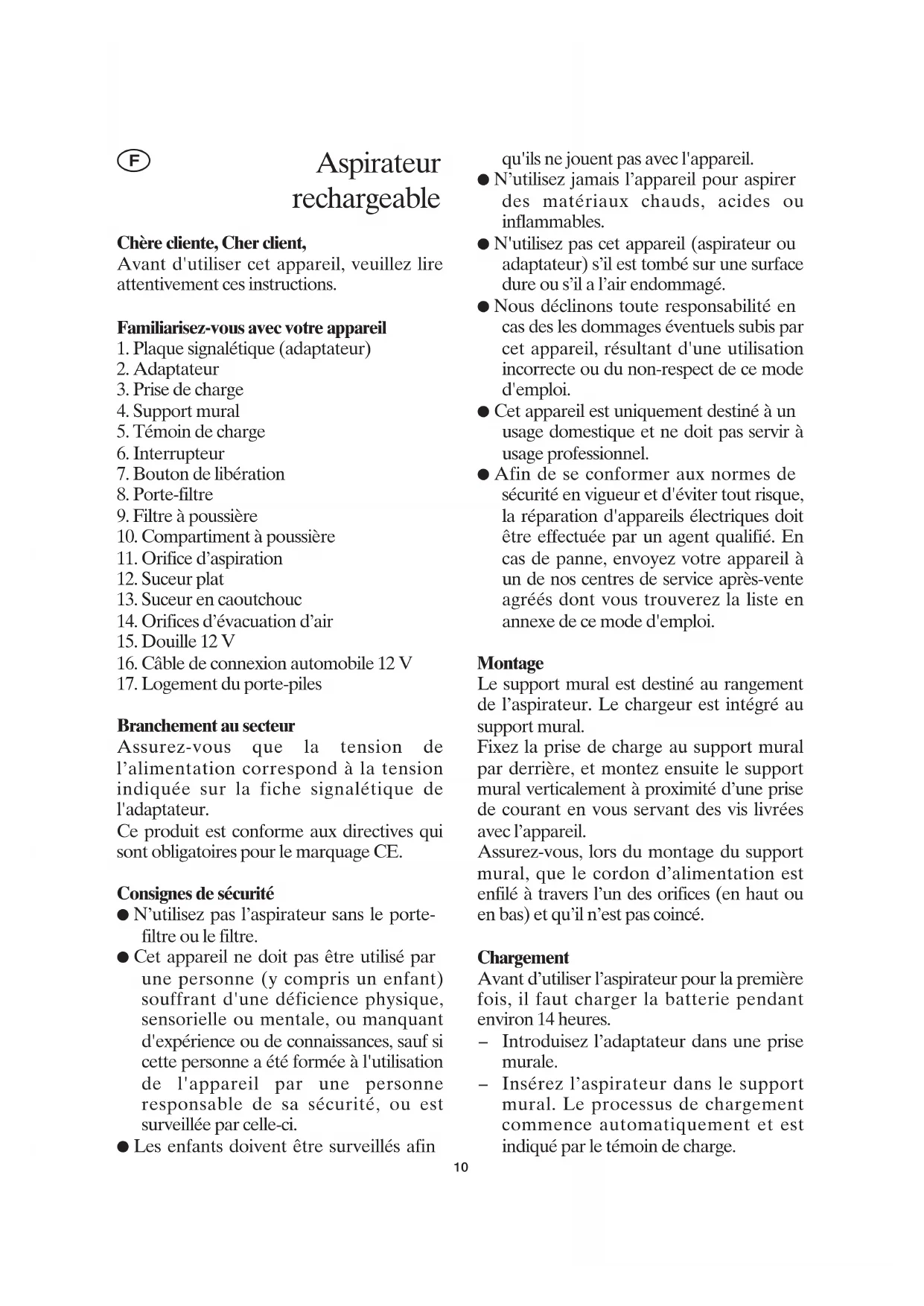 Branchement au secteur Assurez-vous que la tension de l’alimentation correspond à la tension indiquée sur la fiche signalétique de l'adaptateur. Ce produit est conforme aux directives qui sont obligatoires pour le marquage CE. Consignes de sécurité ● N’utilisez pas l’aspirateur sans le porte- filtre ou le filtre. ● Cet appareil ne doit pas être utilisé par une personne (y compris un enfant) souffrant d'une déficience physique, sensorielle ou mentale, ou manquant d'expérience ou de connaissances, sauf si cette personne a été formée à l'utilisation de l'appareil par une personne responsable de sa sécurité, ou est surveillée par celle-ci. ● Les enfants doivent être surveillés afin qu'ils ne jouent pas avec l'appareil. ● N’utilisez jamais l’appareil pour aspirer des matériaux chauds, acides ou inflammables. ● N'utilisez pas cet appareil (aspirateur ou adaptateur) s’il est tombé sur une surface dure ou s’il a l’air endommagé. ● Nous déclinons toute responsabilité en cas des les dommages éventuels subis par cet appareil, résultant d'une utilisation incorrecte ou du non-respect de ce mode d'emploi. ● Cet appareil est uniquement destiné à un usage domestique et ne doit pas servir à usage professionnel. ● Afin de se conformer aux normes de sécurité en vigueur et d'éviter tout risque, la réparation d'appareils électriques doit être effectuée par un agent qualifié. En cas de panne, envoyez votre appareil à un de nos centres de service après-vente agréés dont vous trouverez la liste en annexe de ce mode d'emploi. Montage Le support mural est destiné au rangement de l’aspirateur. Le chargeur est intégré au support mural. Fixez la prise de charge au support mural par derrière, et montez ensuite le support mural verticalement à proximité d’une prise de courant en vous servant des vis livrées avec l’appareil. Assurez-vous, lors du montage du support mural, que le cordon d’alimentation est enfilé à travers l’un des orifices (en haut ou en bas) et qu’il n’est pas coincé. Chargement Avant d’utiliser l’aspirateur pour la première fois, il faut charger la batterie pendant environ 14 heures.