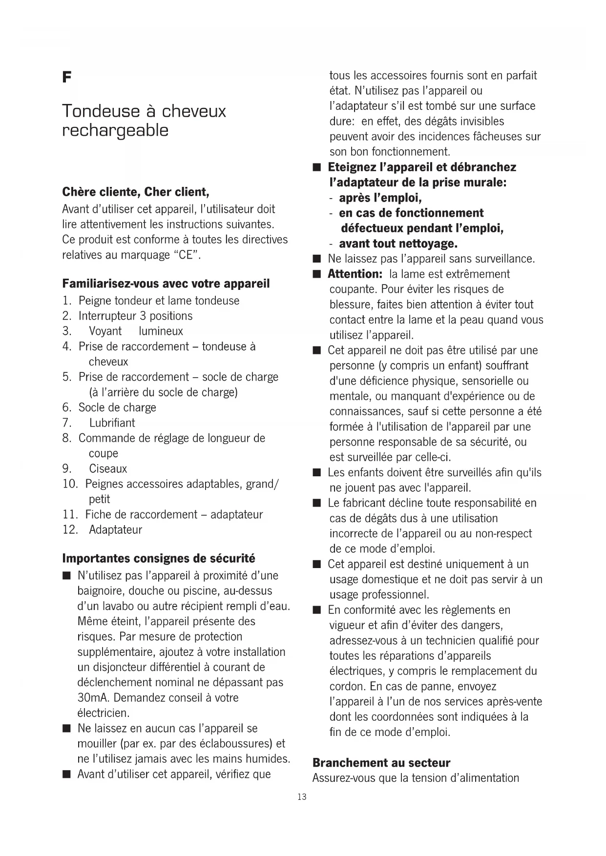 Importantes consignes de sécurité ■ N’utilisez pas l’appareil à proximité d’une baignoire, douche ou piscine, au-dessus d’un lavabo ou autre récipient rempli d’eau. Même éteint, l’appareil présente des risques. Par mesure de protection supplémentaire, ajoutez à votre installation un disjoncteur différentiel à courant de déclenchement nominal ne dépassant pas 30mA. Demandez conseil à votre électricien. ■ Ne laissez en aucun cas l’appareil se mouiller (par ex. par des éclaboussures) et ne l’utilisez jamais avec les mains humides. ■ Avant d’utiliser cet appareil, vérifiez que tous les accessoires fournis sont en parfait état. N’utilisez pas l’appareil ou l’adaptateur s’il est tombé sur une surface dure: en effet, des dégâts invisibles peuvent avoir des incidences fâcheuses sur son bon fonctionnement. ■ Eteignez l’appareil et débranchez l’adaptateur de la prise murale: - après l’emploi, - en cas de fonctionnement défectueux pendant l’emploi, - avant tout nettoyage. ■ Ne laissez pas l’appareil sans surveillance. ■ Attention: la lame est extrêmement coupante. Pour éviter les risques de blessure, faites bien attention à éviter tout contact entre la lame et la peau quand vous utilisez l’appareil. ■ Cet appareil ne doit pas être utilisé par une personne (y compris un enfant) souffrant d'une déficience physique, sensorielle ou mentale, ou manquant d'expérience ou de connaissances, sauf si cette personne a été formée à l'utilisation de l'appareil par une personne responsable de sa sécurité, ou est surveillée par celle-ci. ■ Les enfants doivent être surveillés afin qu'ils ne jouent pas avec l'appareil. ■ Le fabricant décline toute responsabilité en cas de dégâts dus à une utilisation incorrecte de l’appareil ou au non-respect de ce mode d’emploi. ■ Cet appareil est destiné uniquement à un usage domestique et ne doit pas servir à un usage professionnel. ■ En conformité avec les règlements en vigueur et afin d’éviter des dangers, adressez-vous à un technicien qualifié pour toutes les réparations d’appareils électriques, y compris le remplacement du cordon. En cas de panne, envoyez l’appareil à l’un de nos services après-vente dont les coordonnées sont indiquées à la fin de ce mode d’emploi. Branchement au secteur Assurez-vous que la tension d’alimentation 13correspond à la tension indiquée sur la fiche signalétique de l'adaptateur. Le processus de charge Avant d’utiliser la tondeuse, rechargez totalement la pile pendant 10 heures environ. Toutefois, l’appareil peut rester sous charge pendant un délai plus long sans danger. Si vous constatez une baisse considérable de la performance de coupe, ou si le témoin de charge commence à clignoter rouge, éteignez l’appareil et rechargez la pile. Vous pouvez utiliser la tondeuse à cheveux avec l’adaptateur. Cependant, dans ce cas, vous devez charger la pile brièvement pendant 10 minutes environ. Le processus de charge ne commence que lorsque l’appareil est éteint, ce qui est indiqué par le témoin de charge.