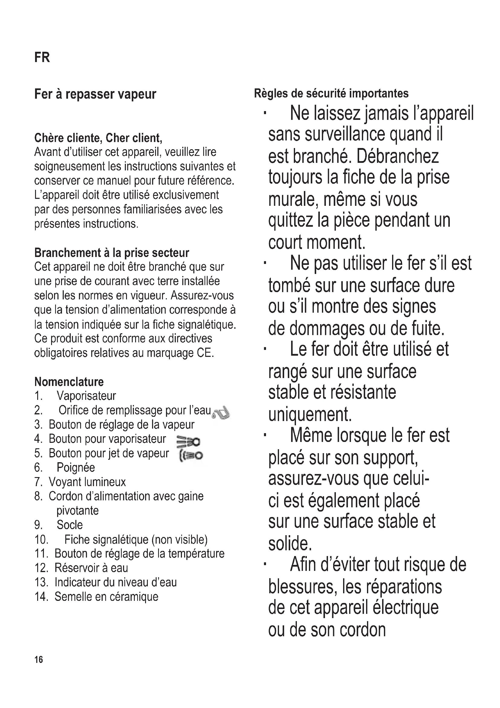d’alimentation doivent être effectuées par notre service clientèle. Si des réparations sont nécessaires, veuillez envoyer l’appareil à notre serviceaprès-vente(voir appendice). ∙ Débranchez toujours la chedelaprisemuraleet laissez refroidir avant de nettoyer l’appareil. ∙ Pour éviter le risque de chocs électriques, ne pas nettoyer l’appareil à l’eau et ne pas le plonger dans l’eau. ∙ Avant de remplir ou de vider le réservoir d’eau, débranchez votre appareil. ∙ Cet appareil peut être utilisépardesenfants(à partirde8ans)etpardes personnes souffrant de déciencesphysiques, sensorielles ou mentales, ou manquant d’expérience ou de connaissances, s’ils ont été formés à l’utilisation de l’appareil et ont été supervisés, et s’ils en comprennent les dangers et les précautions de sécurité à prendre. ∙ Les enfants ne sont pas autorisés à jouer avec l’appareil. ∙ Ne laissez pas les enfants nettoyer ou procéder à des travaux d’entretien ou de maintenance sur l’appareil à moins d’être supervisés. ∙ Lors de sa mise en marche ou de son refroidissement après utilisation, le fer et son cordon doivent être tenus hors de portée des enfants de moins de 8 ans. ∙ Attention : Tenez les enfants à l’écart des emballages, qui représentent un risque potentiel, par exemple, de suffocation. ∙ Ne pas faire fonctionner si une force excessive a été utilisée pour tirer sur le cordon électrique. Les dégâts ne peuvent pas toujours être détectés de18 104 x 142 mm l’extérieur; l’appareil en entier doit donc êtrevériéparuntechnicienqualié avant d’être utilisé de nouveau. ∙ Il y a risque de brûlure si on touche les parties chaudes du boîtier ou de la semelle ou encore l’eau chaude ou la vapeur. Ne dirigez pas la vapeur vers de personnes. ∙ En cours d’utilisation, ne tenez le fer que par sa poignée. ∙ Le fer doit être posé uniquement sur des surfaces résistantes à la chaleur, et jamais sur des surfaces chaudes (parex.desplaquesdecuisson)ouà proximitédeammesdegazàl’airlibre. ∙ Ne laissez pas le cordon toucher des surfaces chaudes. Déroulez-le entièrement avant utilisation. ∙ Débranchez toujours la che de la prise murale - après l’emploi, - en cas de fonctionnement défectueux, - avant de nettoyer l’appareil. ∙ Ne tirez jamais le cordon quand vous enlevezlachedelaprisemurale, prenezlacheenmain. ∙ Aucune responsabilité n’est acceptée en cas de dégâts dus à une mauvaise utilisation ou si on ne se conforme pas à ces consignes. ∙ Cet appareil est destiné à être utilisé dans des applications domestiques et analogues telles que : - des coins cuisines réservés au personnel dans des magasins, bureaux et autres environnements professionnels ; - des fermes ; - l’utilisation par les clients des hôtels, motels et autres environnements à caractère résidentiel ; - des environnements de type chambres d’hôtes. Remplissage du réservoir ∙ Remplissez le réservoir d’eau avant d’utiliser le fer à repasser à vapeur ou avant d’actionner le vaporisateur. ∙ Débranchez l’appareil avant de remplir le réservoir. ∙ Ce fer résiste, dans une large mesure, à l’eau calcaire. Cependant, bien que de l’eau de robinet normale allant jusqu’à 15dH puisse être utilisée, il est recommandé d’utiliser plutôt de l’eau distillée,déminéraliséeoudécalciée. Si vous n’êtes pas sûr de la qualité de l’eau de votre région, veuillez vous renseigner auprès des autorités locales. ∙ Tournez le bouton de réglage de la vapeur sur sa position ‘repassage à sec’. ∙ Ouvrezlecouvercledel’oricede remplissage du réservoir à eau. ∙ Remplissez le réservoir d’eau avec le gobelet livré. Veillez à ne pas dépasser l’indication “Max”. ∙ Fermezl’oricederemplissage. Fonction anti-goutte Si la température de la semelle est insufsantepourlaproductionde vapeur, l’arrivée d’eau est interrompue automatiquementand’éviterlesgouttes.104 x 142 mm