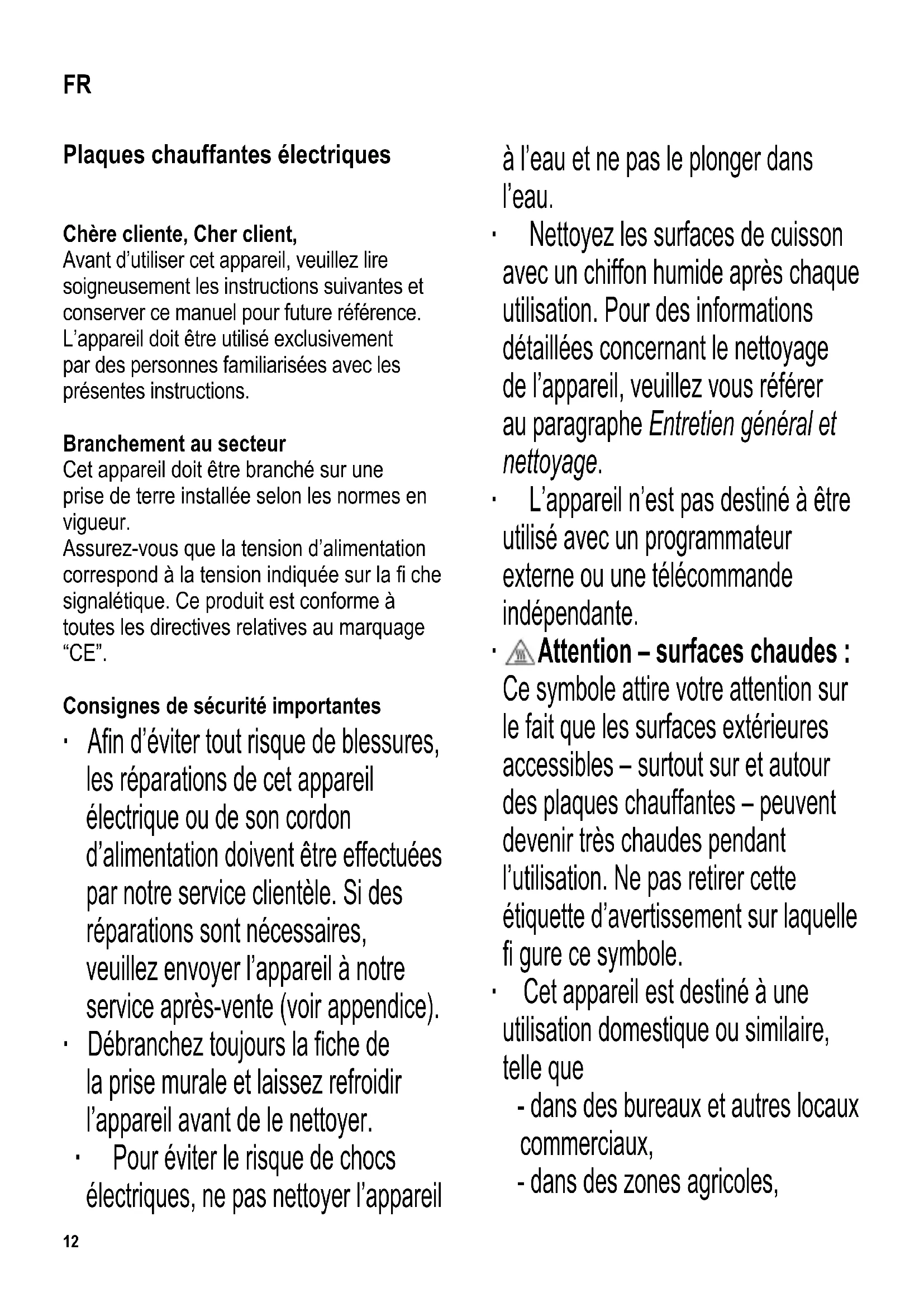 Attention – surfaces chaudes : Ce symbole attire votre attention sur le fait que les surfaces extérieures accessibles – surtout sur et autour des plaques chauffantes – peuvent devenir très chaudes pendant l’utilisation. Ne pas retirer cette étiquette d’avertissement sur laquelle fi gure ce symbole. ∙ Cet appareil est destiné à une utilisation domestique ou similaire, telle que - dans des bureaux et autres locaux commerciaux, - dans des zones agricoles, FR13 - par la clientèle dans les hôtels, motels et établissements similaires, - et dans des maisons d’hôtes. ∙ Cet appareil peut être utilisé par des enfants (à partir de 8 ans) et par des personnes souffrant de défi ciences physiques, sensorielles ou mentales, ou manquant d’expérience ou de connaissances, s’ils ont été formés à l’utilisation de l’appareil et ont été supervisés, et s’ils en comprennent les dangers et les précautions de sécurité à prendre. ∙ Les enfants ne sont pas autorisés à jouer avec l’appareil. ∙ Les enfants ne doivent pas être autorisés à nettoyer ou entretenir l’appareil à moins d’être supervisés et d’avoir plus de 8 ans. ∙ L’appareil et son cordon d’alimentation doivent être, à tout moment, tenus hors de portée des enfants de moins de 8 ans. ∙ Attention : Tenez les enfants à l’écart des emballages, qui représentent un risque potentiel, par exemple, de suffocation. ∙ Avant toute utilisation, vérifi ez soigneusement que l’appareil, son cordon d’alimentation et ses accessoires ne présentent aucun signe de détérioration qui pourrait avoir un effet néfaste sur la sécurité de fonctionnement de l’appareil. Au cas où l’appareil, par exemple, serait tombé sur une surface dure, ou si une force excessive aurait été employée pour tirer sur le cordon d’alimentation, il ne doit plus être utilisé. ∙ Ne jamais faire fonctionner l’appareil sans surveillance. ∙ Attention : Des aliments surchauffés peuvent s’enfl ammer. Mais ce risque augmente considérablement avec des aliments très gras ou cuits dans beaucoup d’huile. ∙ N’utilisez pas l’appareil sous ou à proximité de rideaux, buffets ou autres matériaux infl ammables. ∙ Posez l’appareil sur une surface résistante à la chaleur, aux éclaboussures, taches et vapeur brûlante. Assurez-vous toujours que l’air peut circuler librement sous l’appareil. Une distance minimum de 10 cm par rapport aux murs doit être également respectée. ∙ Les orifi ces de ventilation sous l’appareil ne doivent pas être recouverts pendant l’utilisation. ∙ Débranchez toujours la fi che de la prise murale - en cas de fonctionnement défectueux, - après l’emploi, - avant de nettoyer l’appareil. ∙ Pour retirer le cordon de la prise murale, ne tirez jamais sur le fi l mais servez-vous de la fi che. ∙ Ne laissez pas pendre le cordon. ∙ Assurez-vous que le cordon ne touche aucune partie chaude de l’appareil. ∙ Le fabricant décline toute responsabilité en cas de dégâts dus à une mauvaise14 utilisation ou à la non-conformité aux présentes consignes de sécurité. Mise en marche Avant d’utiliser l’appareil pour la première fois, faites-le chauffer pendant 3 minutes environ à la puissance maximale (mais sans y poser de récipient ni de casserole) tout en assurant une ventilation suffi sante. Durant ce processus, l’appareil émet une légère odeur et un peu de fumée. Ceci est normal et ne dure qu’un petit moment. Assurez une ventilation suffi sante en ouvrant les fenêtres ou les porte-fenêtres. Nettoyez ensuite l’appareil de la façon décrite dans la section Entretien général et nettoyage ci-dessous. Fonctionnement ∙ Posez toujours la casserole sur la plaque chauffante avant de mettre l’appareil en marche. ∙ Assurez-vous que la casserole est propre et sèche à l’extérieur. N’utilisez pas de casseroles encrassées. ∙ Pour ne pas abîmer la plaque, n’utilisez que des casseroles à fond plat. Les casseroles conçues spécifi quement pour les plaques chauffantes sont recommandées (voir illustration. I). ∙ Assurez-vous que la casserole fait au moins le diamètre de la plaque. Ceci minimise la perte de chaleur et protège la plaque contre les dommages résultant d’une distribution inégale de la chaleur. Réglage du thermostat MAX : Pré-cuisson et rôtissage rapide 4-5 : Cuisson régulière, rôtissage 3-4 : Mijotage 1-2 : Maintien au chaud Réglez le thermostat sur ‘MIN’ après utilisation. Débranchez ensuite la fi che de la prise murale pour vous assurer que l’appareil est bien isolé du secteur. Témoin lumineux Le témoin lumineux reste allumé pendant que la plaque chauffe. Il s’éteint lorsque la température pré-sélectionnée est atteinte. Entretien général et nettoyage ∙ Avant de nettoyer l’appareil, débranchez toujours la fi che de la prise de courant et laissez l’appareil refroidir suffi samment. ∙ Pour éviter le risque de décharge électrique, ne nettoyez pas l’appareil à l’eau et ne le plongez pas dans l’eau. ∙ N’utilisez pas de produits abrasifs ni de détergents très puissants. ∙ Après utilisation, essuyez les éclaboussures sur la plaque avec un chiffon mouillé. ∙ Utilisez un produit nettoyant adapté pour entretenir la plaque de temps en temps. Mise au rebut Les appareils qui portent ce symbole doivent être collectés et traités séparément de vos déchets ménagers, car ils contiennent des matériaux précieux qui peuvent être recyclés. En vous débarrassant correctement de ces appareils, vous contribuez à la prévention de potentiels effets négatifs sur la santé humaine et l'environnement. Votre mairie ou le magasin auprès duquel vous avez acquis l’appareil peuvent vous donner des informations à ce sujet.15 Garantie Cet appareil est garanti par le fabricant pendant une durée de deux ans à partir de la date d‘achat, contre tous défauts 