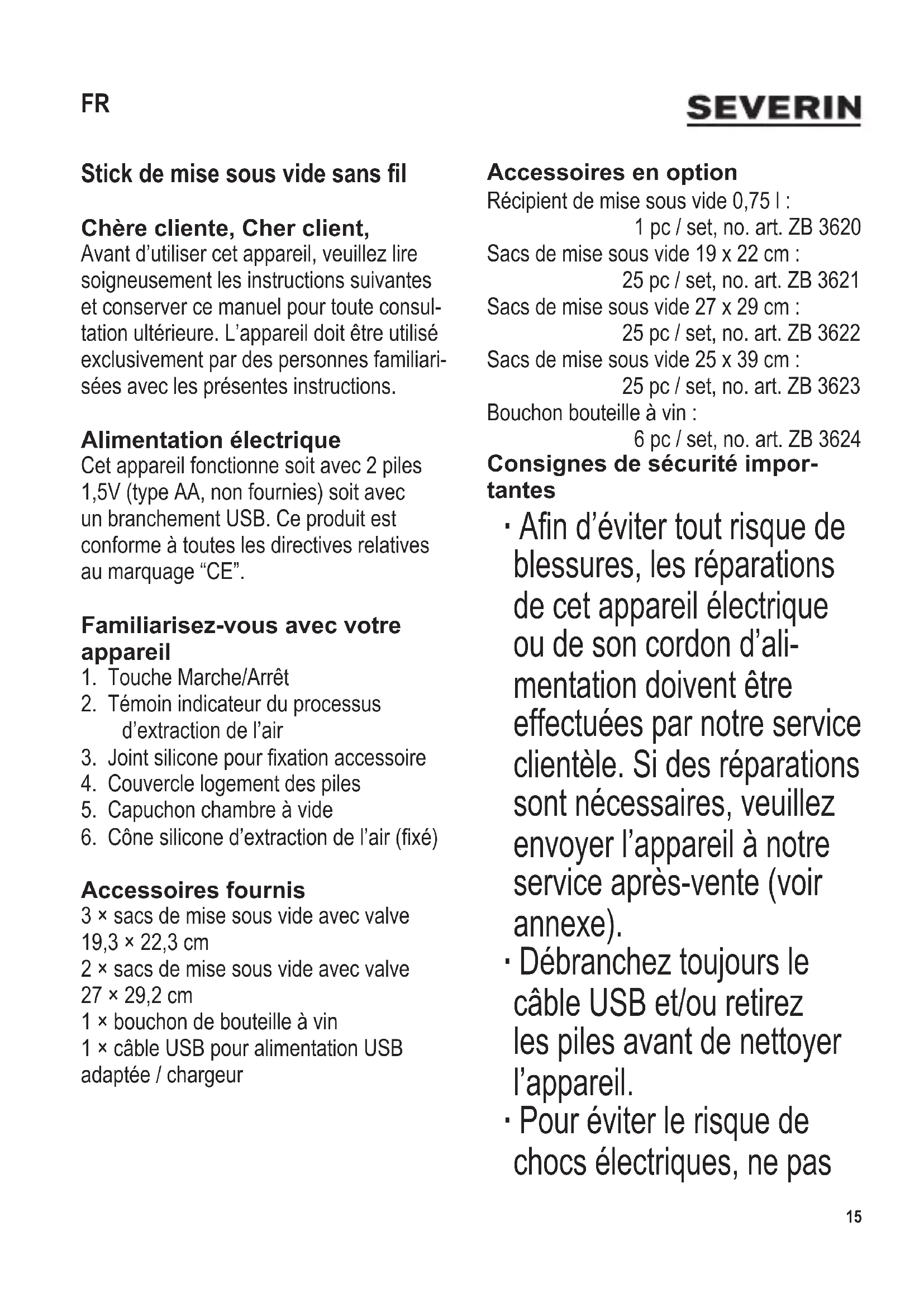 Accessoires fournis 3 × sacs de mise sous vide avec valve 19,3 × 22,3 cm 2 × sacs de mise sous vide avec valve 27 × 29,2 cm 1 × bouchon de bouteille à vin 1 × câble USB pour alimentation USB adaptée / chargeur Accessoires en option Récipient de mise sous vide 0,75 l : 1 pc / set, no. art. ZB 3620 Sacs de mise sous vide 19 x 22 cm : 25 pc / set, no. art. ZB 3621 Sacs de mise sous vide 27 x 29 cm : 25 pc / set, no. art. ZB 3622 Sacs de mise sous vide 25 x 39 cm : 25 pc / set, no. art. ZB 3623 Bouchon bouteille à vin : 6 pc / set, no. art. ZB 3624 Consignes de sécurité impor- tantes ∙ An d’éviter tout risque de blessures, les réparations de cet appareil électrique ou de son cordon d’ali- mentation doivent être effectuées par notre service clientèle. Si des réparations sont nécessaires, veuillez envoyer l’appareil à notre service après-vente (voir annexe). ∙ Débranchez toujours le câble USB et/ou retirez les piles avant de nettoyer l’appareil. ∙ Pour éviter le risque de chocs électriques, ne pas FR16 104 x 142 mm nettoyer l’appareil avec du liquide et ne pas le plonger dans du liquide. ∙ Cet appareil peut être utilisé par des enfants (à partir de 8 ans) et par des personnes souffrant de déciences physiques, sensorielles ou mentales, ou manquant d’expérience ou de connaissances, s’ils ont été formés à l’utilisation de l’appareil et ont été supervisés, et s’ils en com- prennent les dangers et les précautions de sécurité à prendre. ∙ Les enfants ne sont pas autorisés à jouer avec l’appareil. ∙ Ne laissez pas les enfants nettoyer ou procéder à des travaux d’entretien ou de maintenance sur l’appareil à moins d’être supervisés. ∙ L’appareil et son cordon d’alimentation doivent être, à tout moment, tenus hors de portée des enfants de moins de 8 ans. ∙ Attention : Tenez les enfants à l’écart des emballages, qui représentent un risque potentiel, par exemple, de suffocation. ∙ Avant toute utilisation, vériez soi- gneusement que l’appareil, son câble USB et ses accessoires ne présentent aucun signe de détérioration qui pourrait avoir un effet néfaste sur la sécurité de fonctionnement de l’appareil. Au cas où l’appareil, par exemple, serait tombé sur une surface dure, il ne doit plus être utilisé. ∙ Ne pas utiliser la fonction extraction de l’air pour évacuer des liquides quel- conques. Si cela se produisait, relâchez immédiatement la touche marche/arrêt, dévissez le capuchon de la chambre à vide, nettoyez cette dernière, séchez-la puis replacez le capuchon. ∙ Ne tirez jamais sur le câble USB pour débrancher l’appareil ; Tenez toujours le connecteur USB. ∙ Ne laissez jamais l’appareil ou le câble USB entrer en contact avec une surface chaude ou une source de chaleur quelconque. ∙ Nous déclinons toute responsabilité en cas de dommages éventuels subis par cet appareil, résultant d’une utilisation incorrecte ou du non-respect de ce mode d’emploi.104 x 142 mm