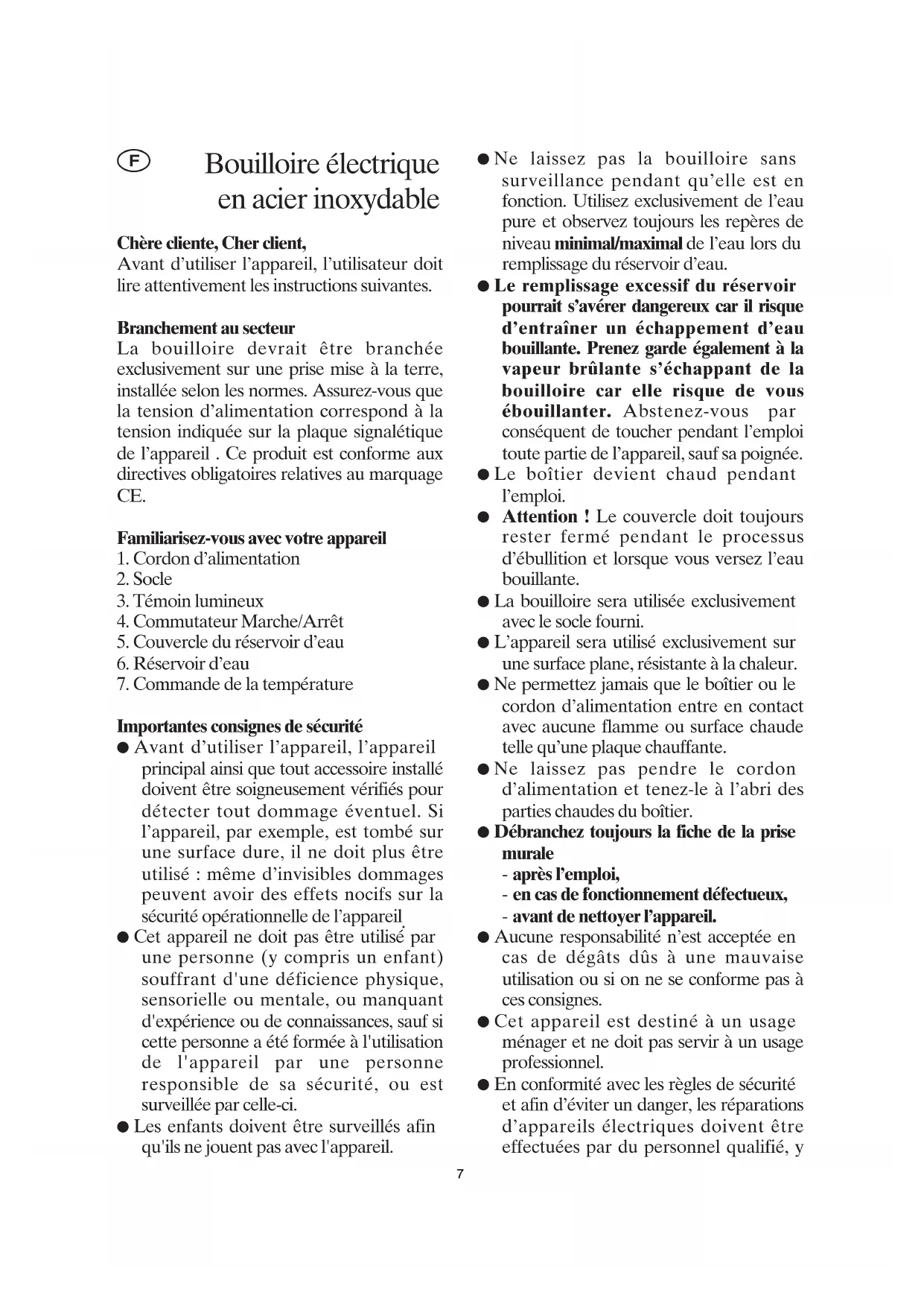 Ne laisssez pas la bouilloire sans surveillance pendant qu'elle est en fonction. Utilisez exclusivement de l'eau pure et observez toujours les repères de niveau minimal/maximal de l'eau lors du replissage du réservoir d'eau.