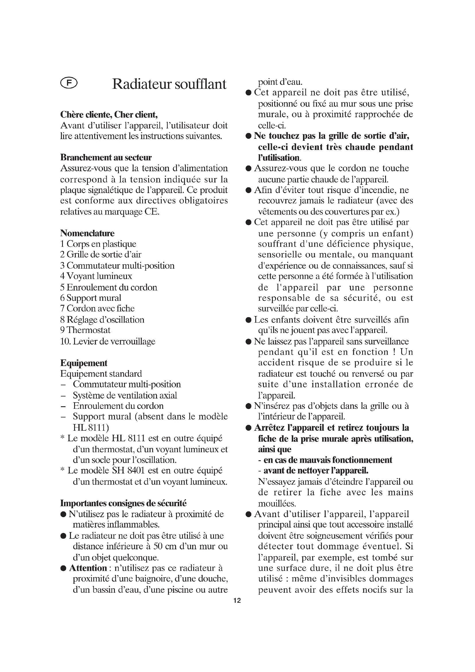 - Le modele HL 8111 est en outre équipé d'un thermostat, d'un voyant lumineux et d'un socle pour l'oscillation.
