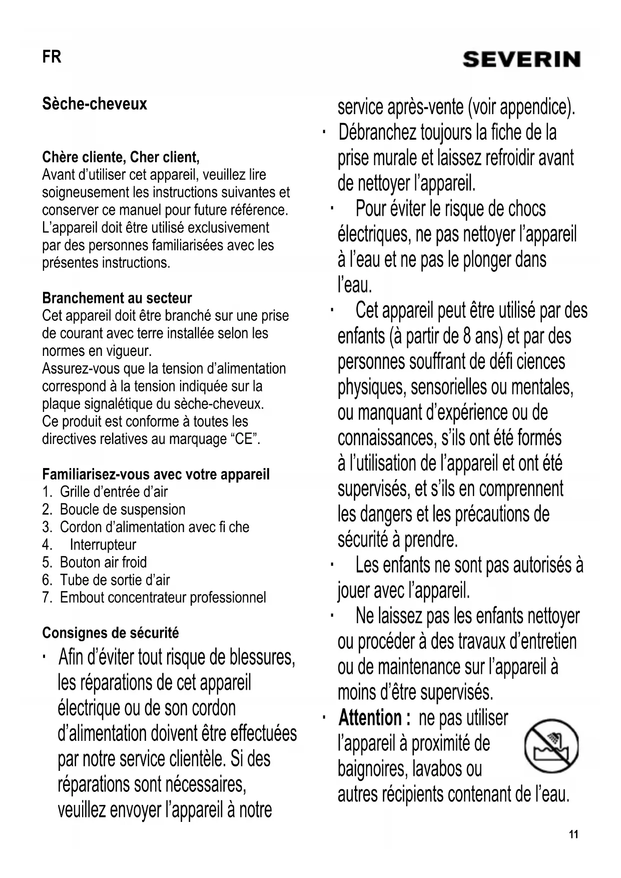 Consignes de sécurité ∙ A fi n d’éviter tout risque de blessures, les réparations de cet appareil électrique ou de son cordon d’alimentation doivent être effectuées par notre service clientèle. Si des réparations sont nécessaires, veuillez envoyer l’appareil à notre service après-vente (voir appendice). ∙ Débranchez toujours la fi che de la prise murale et laissez refroidir avant de nettoyer l’appareil. ∙ Pour éviter le risque de chocs électriques, ne pas nettoyer l’appareil à l’eau et ne pas le plonger dans l’eau. ∙ Cet appareil peut être utilisé par des enfants (à partir de 8 ans) et par des personnes souffrant de défi ciences physiques, sensorielles ou mentales, ou manquant d’expérience ou de connaissances, s’ils ont été formés à l’utilisation de l’appareil et ont été supervisés, et s’ils en comprennent les dangers et les précautions de sécurité à prendre. ∙ Les enfants ne sont pas autorisés à jouer avec l’appareil. ∙ Ne laissez pas les enfants nettoyer ou procéder à des travaux d’entretien ou de maintenance sur l’appareil à moins d’être supervisés. ∙ Attention : ne pas utiliser l’appareil à proximité de baignoires, lavabos ou autres récipients contenant de l’eau. FR12 ∙ A proximité de l’eau, le risque existe même lorsque l’appareil est éteint. Par conséquent, retirez toujours la fi che de la prise murale après utilisation, si l’appareil est utilisé dans une salle de bain. ∙ Pour une protection supplémentaire, faites installer un disjoncteur de perte à la terre (RCD) ayant un courant de déclenchement nominal ne dépassant 30mA dans votre installation. Veuillez consulter un électricien qualifi é. ∙ Attention : Tenez les enfants à l’écart des emballages, qui représentent un risque potentiel, par exemple, de suffocation. ∙ Ne mouillez jamais l’appareil (par exemple, par des éclaboussures d’eau) et ne l’utilisez jamais avec des mains humides. ∙ Les appareils électriques chauffants fonctionnent à de très hautes températures. Ne touchez aucune partie de l’appareil à l’exception de la poignée. Toucher les parties chaudes peut entraîner des brûlures. Lorsque vous faites fonctionner le sèche-cheveux, tenez-le par la poignée uniquement. ∙ N’utilisez pas l’appareil sur des postiches ou perruques synthétiques. La chaleur émise pourrait abîmer les fi bres synthétiques. ∙ Assurez-vous que les orifi ces d’entrée et de sortie d’air ne sont pas obstrués par les doigts ou les cheveux et que les particules pelucheuses ne s’y accumulent pas. ∙ Une obstruction du système de fl ux d’air peut entraîner l’arrêt de l’appareil par le dispositif de sécurité thermique. Dans ce cas, débranchez immédiatement l’appareil de la prise murale et attendez son refroidissement avant de dégager l’obstruction et de le remettre en marche. ∙ Avant toute utilisation, vérifi ez soigneusement que l’appareil, son cordon d’alimentation et ses accessoires ne présentent aucun signe de détérioration qui pourrait avoir un effet néfaste sur la sécurité de fonctionnement de l’appareil. Au cas où l’appareil, par exemple, serait tombé sur une surface dure, ou si une force excessive aurait été employée pour tirer sur le cordon d’alimentation, il ne doit plus être utilisé. ∙ Pour éviter d’endommager le cordon d’alimentation, - ne pliez et vrillez pas le cordon, surtout à l’endroit où il émerge du boîtier, - ne tirez pas sur le cordon, - n’enroulez pas le cordon autour de l’appareil. ∙ Ne faites jamais fonctionner l’appareil sans surveillance. ∙ Eteignez toujours l’appareil et débranchez la fi che de la prise murale après utilisation ainsi qu’en cas de mauvais fonctionnement. ∙ Ne débranchez pas l’appareil en tirant sur le cordon ; tirez toujours sur la fi che. ∙ Ne mettez pas l’appareil chaud sur des surfaces quelconques sensibles à la chaleur. ∙ Nous déclinons toute responsabilité pour les dommages éventuels subis par cet appareil, résultant d’une utilisation incorrecte ou du non-respect de ce mode d’emploi.13 ∙ Cet appareil est destiné à une utilisation domestique ou similaire, telle que - dans des bureaux et autres locaux commerciaux, - dans des organisations agricoles, - par la clientèle dans les hôtels, motels et établissements similaires, - et dans des maisons d’hôtes. Embout concentrateur L’embout concentrateur peut être attaché à la sortie d’air afi n de faciliter le coiffage pendant le séchage des cheveux. Fonction air froid La fonction air froid peut être utilisé à tout moment au cours du séchage. Cette fonction apporte un air plus frais, ce qui favorise le raffermissement de la coiffure. Fonctionnement Branchez le sèche-cheveux sur une prise murale adaptée, puis sélectionnez la puissance en mettant l’interrupteur sur la position correspondante. Entretien et nettoyage ∙ Avant de nettoyer le sèche-cheveux, retirez la fi che de la prise murale et laissez refroidir l’appareil complètement. ∙ Pour éviter tout risque d’électrisation, ne pas nettoyer l’appareil à l’eau et ne pas l’immerger dans l’eau. ∙ Si nécessaire, le boîtier du sèche- cheveux peut être essuyé avec un chiffon sec non-pelucheux ∙ Vérifi ez régulièrement la grille d’entrée d’air et retirez toute accumulation de cheveux ou de particules pelucheuses. Mise au rebut Les appareils qui portent ce symbole doivent être collectés et traités séparément de vos déchets ménagers, car ils contiennent des matériaux précieux qui peuvent être recyclés. En vous débarrassant correctement de ces appareils, vous contribuez à la prévention de potentiels effets négatifs sur la santé humaine et l'environnement. Votre mairie ou le magasin auprès duquel vous avez acquis l’appareil peuvent vous donner des informations à ce sujet. Garantie Cet appareil est g