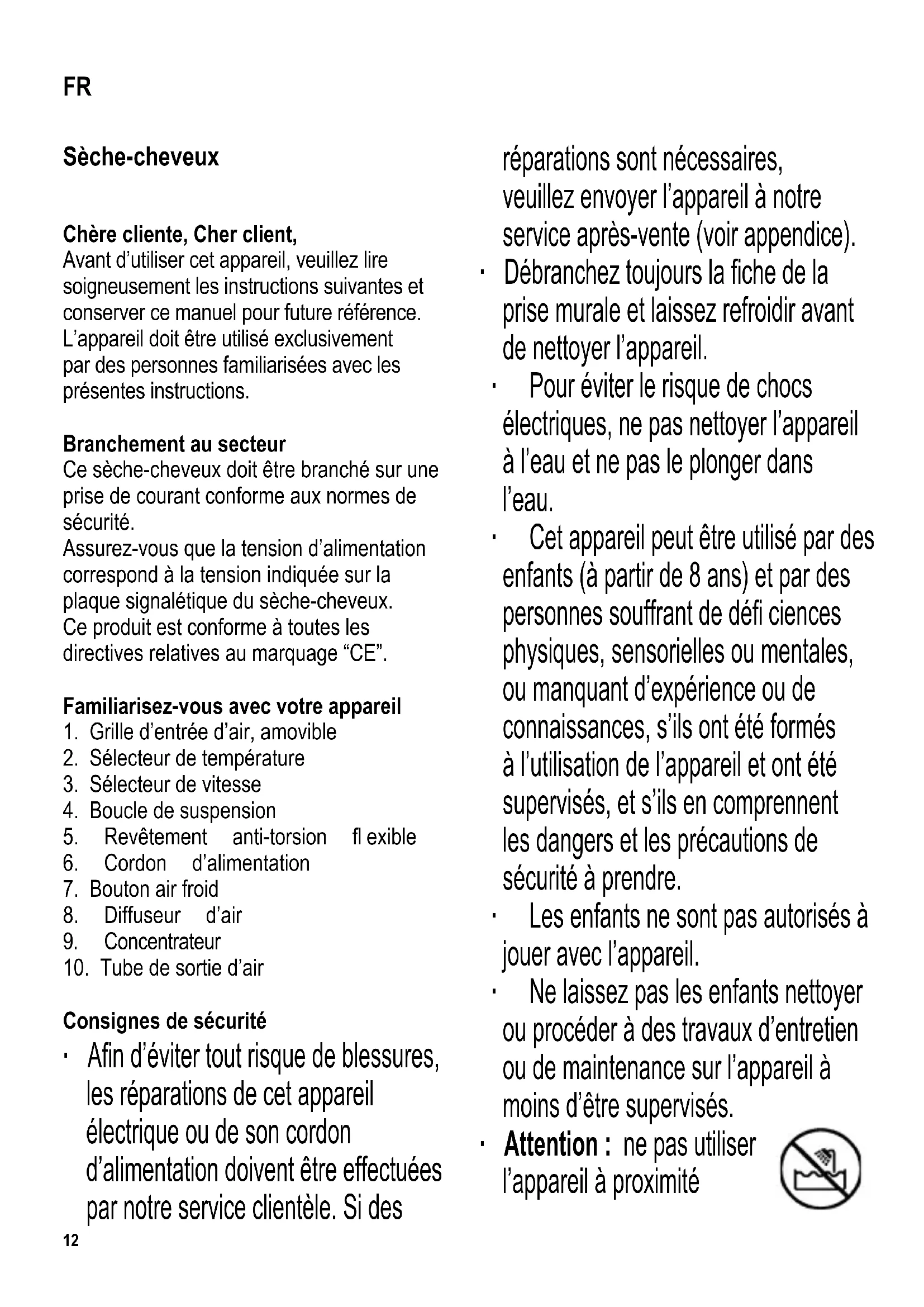 Consignes de sécurité ∙ A fi n d’éviter tout risque de blessures, les réparations de cet appareil électrique ou de son cordon d’alimentation doivent être effectuées par notre service clientèle. Si des réparations sont nécessaires, veuillez envoyer l’appareil à notre service après-vente (voir appendice). ∙ Débranchez toujours la fi che de la prise murale et laissez refroidir avant de nettoyer l’appareil. ∙ Pour éviter le risque de chocs électriques, ne pas nettoyer l’appareil à l’eau et ne pas le plonger dans l’eau. ∙ Cet appareil peut être utilisé par des enfants (à partir de 8 ans) et par des personnes souffrant de défi ciences physiques, sensorielles ou mentales, ou manquant d’expérience ou de connaissances, s’ils ont été formés à l’utilisation de l’appareil et ont été supervisés, et s’ils en comprennent les dangers et les précautions de sécurité à prendre. ∙ Les enfants ne sont pas autorisés à jouer avec l’appareil. ∙ Ne laissez pas les enfants nettoyer ou procéder à des travaux d’entretien ou de maintenance sur l’appareil à moins d’être supervisés. ∙ Attention : ne pas utiliser l’appareil à proximité FR13 de baignoires, lavabos ou autres récipients contenant de l’eau. ∙ A proximité de l’eau, le risque existe même lorsque l’appareil est éteint. Par conséquent, retirez toujours la fi che de la prise murale après utilisation, si l’appareil est utilisé dans une salle de bain. ∙ Pour une protection supplémentaire, faites installer un disjoncteur de perte à la terre (RCD) ayant un courant de déclenchement nominal ne dépassant 30mA dans votre installation. Veuillez consulter un électricien qualifi é. ∙ Attention : Tenez les enfants à l’écart des emballages, qui représentent un risque potentiel, par exemple, de suffocation. ∙ Ne mouillez jamais l’appareil (par exemple, par des éclaboussures d’eau) et ne l’utilisez jamais avec des mains humides. ∙ Les appareils électriques chauffants fonctionnent à de très hautes températures. Ne touchez aucune partie de l’appareil à l’exception de la poignée. Toucher les parties chaudes peut entraîner des brûlures. Lorsque vous faites fonctionner le sèche-cheveux, tenez-le par la poignée uniquement. ∙ N’utilisez pas l’appareil sur des postiches ou perruques synthétiques. La chaleur émise pourrait abîmer les fi bres synthétiques. ∙ Assurez-vous que les orifi ces d’entrée et de sortie d’air ne sont pas obstrués par les doigts ou les cheveux et que les particules pelucheuses ne s’y accumulent pas. ∙ Une obstruction du système de fl ux d’air peut entraîner l’arrêt de l’appareil par le dispositif de sécurité thermique. Dans ce cas, débranchez immédiatement l’appareil de la prise murale et attendez son refroidissement avant de dégager l’obstruction et de le remettre en marche. ∙ Avant toute utilisation, vérifi ez soigneusement que l’appareil, son cordon d’alimentation et ses accessoires ne présentent aucun signe de détérioration qui pourrait avoir un effet néfaste sur la sécurité de fonctionnement de l’appareil. Au cas où l’appareil, par exemple, serait tombé sur une surface dure, ou si une force excessive aurait été employée pour tirer sur le cordon d’alimentation, il ne doit plus être utilisé. ∙ Pour éviter d’endommager le cordon d’alimentation, - ne pliez et vrillez pas le cordon, surtout à l’endroit où il émerge du boîtier, - ne tirez pas sur le cordon, - n’enroulez pas le cordon autour de l’appareil. ∙ Ne faites jamais fonctionner l’appareil sans surveillance. ∙ Eteignez toujours l’appareil et débranchez la fi che de la prise murale après utilisation ainsi qu’en cas de mauvais fonctionnement. ∙ Ne débranchez pas l’appareil en tirant sur le cordon ; tirez toujours sur la fi che. ∙ Ne mettez pas l’appareil chaud sur des surfaces quelconques sensibles à la chaleur.14 ∙ Nous déclinons toute responsabilité pour les dommages éventuels subis par cet appareil, résultant d’une utilisation incorrecte ou du non-respect de ce mode d’emploi. ∙ Cet appareil est destiné à une utilisation domestique ou similaire, telle que - dans des bureaux et autres locaux commerciaux, - dans des organisations agricoles, - par la clientèle dans les hôtels, motels et établissements similaires, - et dans des maisons d’hôtes. Fonction IONIC La fonction IONIC permet un coiffage facile et en douceur en éliminant la charge statique dans les cheveux. Elle utilise un ‘nuage’ d’ions négatifs pour éviter l’électricité statique due à une charge positive des cheveux. La fonction IONIC est activée automatiquement; son effet est renforcé par la grille de sortie d’air revêtement céramique. Embout concentrateur L’embout concentrateur peut être attaché à la sortie d’air afi n de faciliter le coiffage pendant le séchage des cheveux. Diffuseur d’air Le diffuseur également peut être attaché à la sortie d’air. Le diffuseur de volume est utile pour respecter le volume et l’aspect naturel d’une chevelure bouclée. Déplacez le diffuseur sur les cheveux en mouvements circulaires. Sélecteurs de température te de vitesse Différentes combinaisons de vitesse et de température sont possibles pour le séchage, en modifi ant les positions des sélecteurs. Le sélecteur de vitesse règle l’intensité du fl ux d’air et le sélecteur de température la chaleur diffusée. Lorsque le sélecteur de vitesse est sur la position ‘0’, le sèche-cheveux est éteint. Fonction air froid La fonction air froid peut être utilisée à tout moment au cours du séchage. Cette fonction apporte un air plus frais, ce qui favorise le raffermissement de la coiffure. Fonctionnement Branchez le sèche-cheveux sur une prise secteur appropriée, puis réglez le fl ux d’air à l’aide des sélecteurs intégrés à la poignée. 