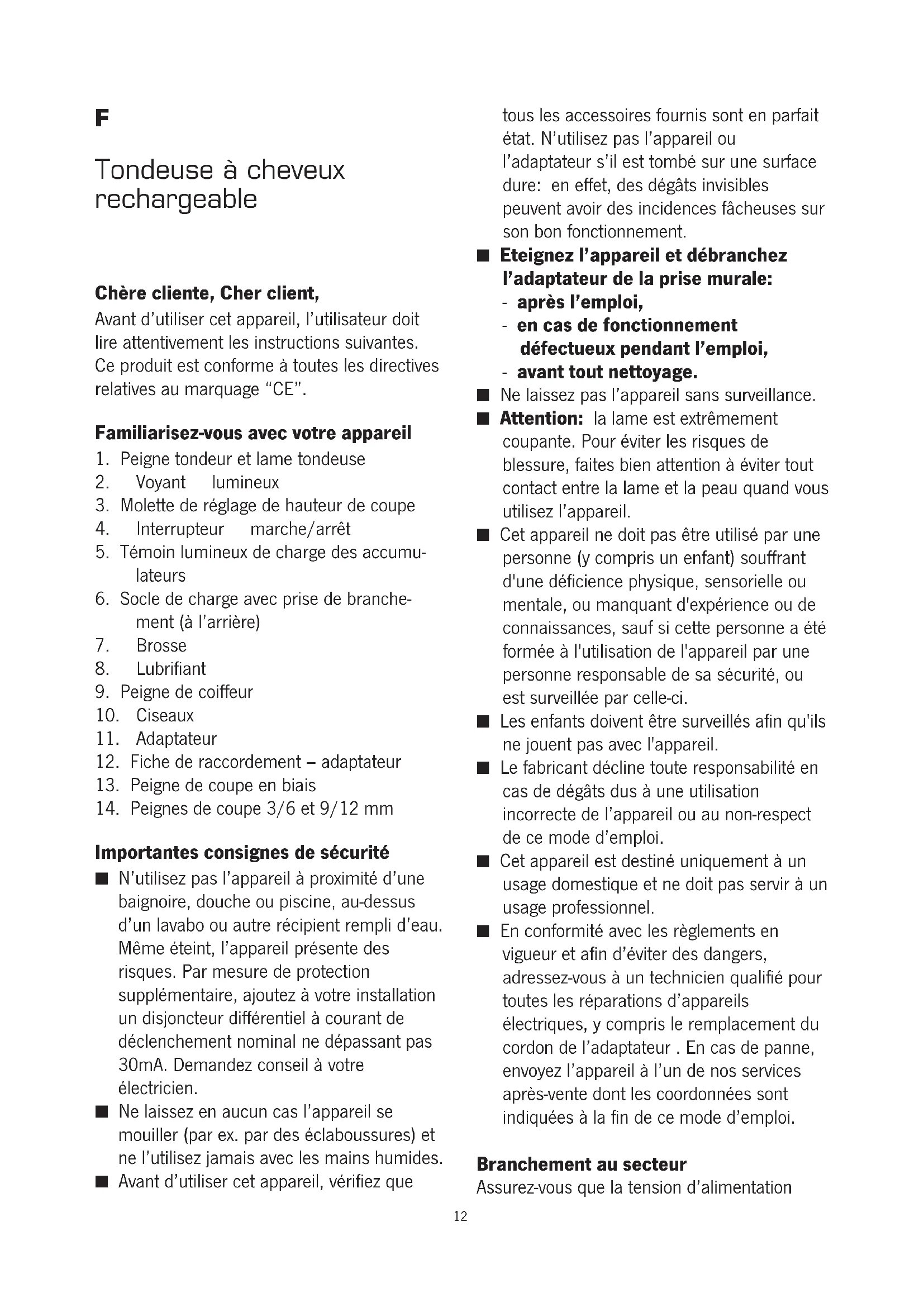 Importantes consignes de sécurité ■ N’utilisez pas l’appareil à proximité d’une baignoire, douche ou piscine, au-dessus d’un lavabo ou autre récipient rempli d’eau. Même éteint, l’appareil présente des risques. Par mesure de protection supplémentaire, ajoutez à votre installation un disjoncteur différentiel à courant de déclenchement nominal ne dépassant pas 30mA. Demandez conseil à votre électricien. ■ Ne laissez en aucun cas l’appareil se mouiller (par ex. par des éclaboussures) et ne l’utilisez jamais avec les mains humides. ■ Avant d’utiliser cet appareil, vérifiez que tous les accessoires fournis sont en parfait état. N’utilisez pas l’appareil ou l’adaptateur s’il est tombé sur une surface dure: en effet, des dégâts invisibles peuvent avoir des incidences fâcheuses sur son bon fonctionnement. ■ Eteignez l’appareil et débranchez l’adaptateur de la prise murale: - après l’emploi, - en cas de fonctionnement défectueux pendant l’emploi, - avant tout nettoyage. ■ Ne laissez pas l’appareil sans surveillance. ■ Attention: la lame est extrêmement coupante. Pour éviter les risques de blessure, faites bien attention à éviter tout contact entre la lame et la peau quand vous utilisez l’appareil. ■ Cet appareil ne doit pas être utilisé par une personne (y compris un enfant) souffrant d'une déficience physique, sensorielle ou mentale, ou manquant d'expérience ou de connaissances, sauf si cette personne a été formée à l'utilisation de l'appareil par une personne responsable de sa sécurité, ou est surveillée par celle-ci. ■ Les enfants doivent être surveillés afin qu'ils ne jouent pas avec l'appareil. ■ Le fabricant décline toute responsabilité en cas de dégâts dus à une utilisation incorrecte de l’appareil ou au non-respect de ce mode d’emploi. ■ Cet appareil est destiné uniquement à un usage domestique et ne doit pas servir à un usage professionnel. ■ En conformité avec les règlements en vigueur et afin d’éviter des dangers, adressez-vous à un technicien qualifié pour toutes les réparations d’appareils électriques, y compris le remplacement du cordon de l’adaptateur . En cas de panne, envoyez l’appareil à l’un de nos services après-vente dont les coordonnées sont indiquées à la fin de ce mode d’emploi. Branchement au secteur Assurez-vous que la tension d’alimentation 12correspond à la tension indiquée sur la fiche signalétique de l'adaptateur. Le processus de charge Avant d’utiliser la tondeuse, rechargez totalement la pile pendant environ 1 heure. Toutefois, l’appareil peut rester sous charge pendant un délai plus long sans danger. Si vous constatez une nette baisse de puissance de l’appareil ou si le témoin lumineux de recharge des accumulateurs est rouge, éteignez l’appareil et rechargez les accumulateurs.
