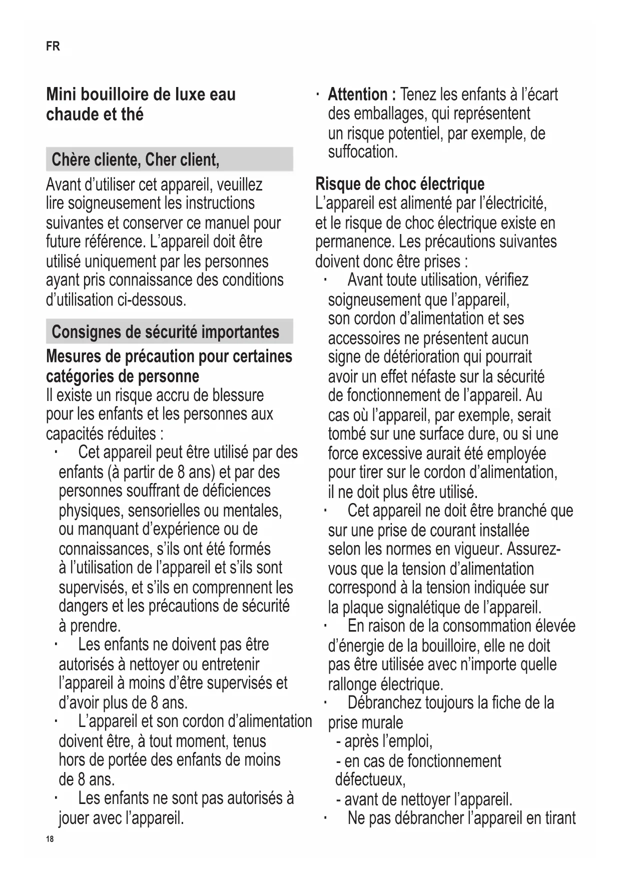 Voltage 220-240 V~, 50/60 Hz Output 1850-2200 W Dimensions (W x H x D) 16.5 x 21 x 22 cm Weight 1.3 kg Special markings Do not dispose of in domestic garbage This product complies with all binding CE labelling directives. UNLOCK Lid insert release LOCK Lid insert lock18 142 x 208 mm Mini bouilloire de luxe eau chaude et thé Chère cliente, Cher client, Avant d’utiliser cet appareil, veuillez lire soigneusement les instructions suivantes et conserver ce manuel pour future référence. L’appareil doit être utilisé uniquement par les personnes ayant pris connaissance des conditions d’utilisation ci-dessous. Consignes de sécurité importantes Mesures de précaution pour certaines catégories de personne Il existe un risque accru de blessure pour les enfants et les personnes aux capacités réduites : ∙ Cet appareil peut être utilisé par des enfants (à partir de 8 ans) et par des personnes souffrant de déciences physiques, sensorielles ou mentales, ou manquant d’expérience ou de connaissances, s’ils ont été formés à l’utilisation de l’appareil et s’ils sont supervisés, et s’ils en comprennent les dangers et les précautions de sécurité à prendre. ∙ Les enfants ne doivent pas être autorisés à nettoyer ou entretenir l’appareil à moins d’être supervisés et d’avoir plus de 8 ans. ∙ L’appareil et son cordon d’alimentation doivent être, à tout moment, tenus hors de portée des enfants de moins de 8 ans. ∙ Les enfants ne sont pas autorisés à jouer avec l’appareil. ∙ Attention : Tenez les enfants à l’écart des emballages, qui représentent un risque potentiel, par exemple, de suffocation. Risque de choc électrique L’appareil est alimenté par l’électricité, et le risque de choc électrique existe en permanence. Les précautions suivantes doivent donc être prises : ∙ Avant toute utilisation, vériez soigneusement que l’appareil, son cordon d’alimentation et ses accessoires ne présentent aucun signe de détérioration qui pourrait avoir un effet néfaste sur la sécurité de fonctionnement de l’appareil. Au cas où l’appareil, par exemple, serait tombé sur une surface dure, ou si une force excessive aurait été employée pour tirer sur le cordon d’alimentation, il ne doit plus être utilisé. ∙ Cet appareil ne doit être branché que sur une prise de courant installée selon les normes en vigueur. Assurez- vous que la tension d’alimentation correspond à la tension indiquée sur la plaque signalétique de l’appareil. ∙ En raison de la consommation élevée d’énergie de la bouilloire, elle ne doit pas être utilisée avec n’importe quelle rallonge électrique. ∙ Débranchez toujours la che de la prise murale - après l’emploi, - en cas de fonctionnement défectueux, - avant de nettoyer l’appareil. ∙ Ne pas débrancher l’appareil en tirant FR19 142 x 208 mm sur le cordon ; tirez toujours sur la che. ∙ Ne touchez pas la che avec des mains mouillées. ∙ Les connexions électriques dans le socle doivent être protégées en permanence contre tout contact éventuel avec l’eau. ∙ Ne pas nettoyer le réservoir d’eau et le socle avec des liquides et ne pas les immerger ; abstenez-vous de laver ceux-ci à l’eau courante. ∙ La bouilloire sera utilisée exclusivement avec le socle fourni. ∙ N’enlevez jamais de son socle (ou remettez en place) le réservoir d’eau quand l’appareil est branché. Risque de brûlure ou d’ébouillantage ∙ Les surfaces extérieures deviennent chaudes pendant l’utilisation et le restent quelque temps après. ∙ Ne laissez pas la bouilloire sans surveillance pendant qu’elle est en fonction. Utilisez exclusivement de l’eau pure et observez toujours les repères de niveau minimal (0,5 l) / maximal (uniquement 0,75 l pour le thé ou 1,0 l pour l’eau) de l’eau lors du remplissage du réservoir d’eau. Le remplissage excessif du réservoir pourrait s’avérer dangereux car il risque d’entraîner un échappement d’eau bouillante. ∙ Pour uniquement faire bouillir de l’eau, retirez toujours le ltre à thé. ∙ Ne pas dépasser 70 °C en réchauffant le thé. Attention : Ne pas faire bouillir, le liquide en ébullition pourrait déborder. ∙ Prenez garde également à la vapeur brûlante s’échappant de la bouilloire car elle risque de vous ébouillanter. Abstenez-vous par conséquent de toucher pendant l’emploi toute partie de l’appareil, sauf sa poignée. ∙ Le couvercle doit toujours rester fermé pendant le processus d’ébullition et lorsque vous versez l’eau bouillante. ∙ Attention : Pour éviter que la paroi vitrée ne se ssure, ne pas remplir le réservoir chaud d’eau froide. Manque d’hygiène Le manque d’hygiène peut entraîner la formation de bactéries à l’intérieur de l’appareil :