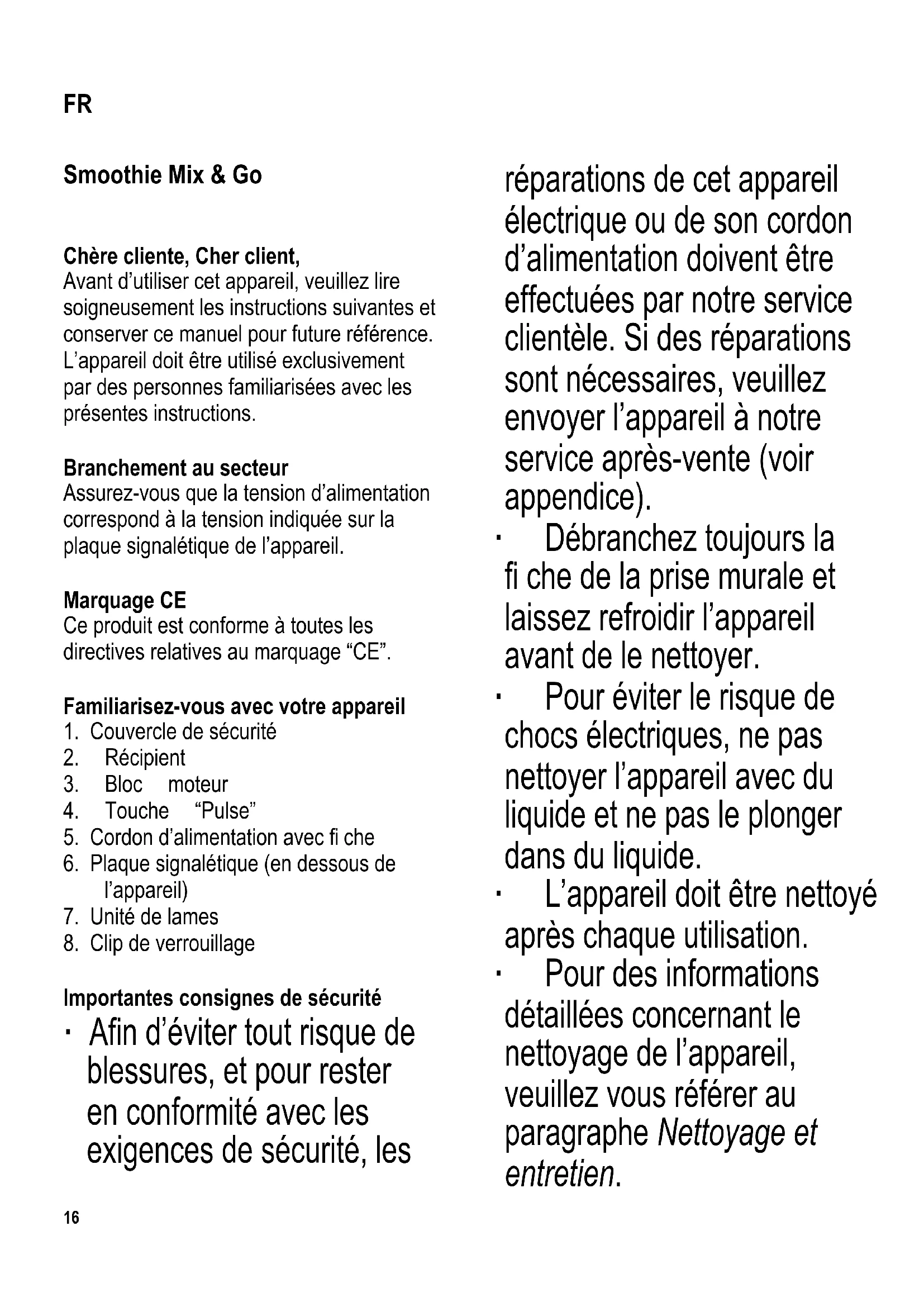 Importantes consignes de sécurité ∙ Afi n d’éviter tout risque de blessures, et pour rester en conformité avec les exigences de sécurité, les réparations de cet appareil électrique ou de son cordon d’alimentation doivent être effectuées par notre service clientèle. Si des réparations sont nécessaires, veuillez envoyer l’appareil à notre service après-vente (voir appendice). ∙ Débranchez toujours la fi che de la prise murale et laissez refroidir l’appareil avant de le nettoyer. ∙ Pour éviter le risque de chocs électriques, ne pas nettoyer l’appareil avec du liquide et ne pas le plonger dans du liquide. ∙ L’appareil doit être nettoyé après chaque utilisation. ∙ Pour des informations détaillées concernant le nettoyage de l’appareil, veuillez vous référer au paragraphe Nettoyage et entretien. FR17 ∙ Attention : Les lames sont extrêmement tranchantes. Pour éviter tout risque de blessures, prenez toutes les précautions en vidant le récipient mixeur ou en nettoyant l’appareil. ∙ Attention : Ne pas remplir le récipient mixeur d’ingrédients chauds. ∙ Versez avec précaution les liquides chauds car des jets de vapeur peuvent s’échapper de l’appareil. ∙ Attention : Une mauvaise utilisation peut provoquer des blessures corporelles graves. ∙ Débranchez toujours la fi che de la prise murale - avant le montage ou le démontage de l’appareil, - en cas de fonctionnement défectueux, - lorsque l’appareil fonctionne sans surveillance, - avant de nettoyer l’appareil, - après l’emploi. ∙ Cet appareil est destiné à être utilisé dans des applications domestiques et analogues telles que : - des coins cuisines réservés au personnel dans des magasins, bureaux et autres environnements professionnels ; - des fermes ; - l’utilisation par les clients des hôtels, motels et autres environnements à caractère résidentiel ; - des environnements de type chambres d’hôtes. ∙ L’appareil ne peut être utilisé par des personnes souffrant de défi ciences physiques, sensorielles ou mentales ou manquant18 d’expérience ou de connaissances, sauf si celles-ci ont été formées à l’utilisation de l’appareil et ont été supervisées, et si elles en comprennent les dangers et les précautions de sécurité à prendre. ∙ Les enfants ne doivent pas être autorisés à se servir de l’appareil. L’appareil et son cordon d’alimentation doivent être tenus à l’écart des enfants. ∙ Les enfants ne sont pas autorisés à jouer avec l’appareil. ∙ Attention : Tenez les enfants à l’écart des emballages, qui représentent un risque potentiel, par exemple, de suffocation. ∙ Avant toute utilisation, vérifi ez soigneusement que l’appareil, son cordon d’alimentation et ses accessoires ne présentent aucun signe de détérioration qui pourrait avoir un effet néfaste sur la sécurité de fonctionnement de l’appareil. Au cas où l’appareil, par exemple, serait tombé sur une surface dure, ou si une force excessive aurait été employée pour tirer sur le cordon d’alimentation, il ne doit plus être utilisé. ∙ Placez l’appareil sur une surface horizontale. Ne permettez jamais que le boîtier ou le cordon d’alimentation entre en contact avec une fl amme ou surface chaude telle qu’une plaque chauffante. ∙ Ne laissez pas pendre le cordon. ∙ Attention : Ne pas fi xer l’unité des lames sur le bloc moteur en l’absence d’un récipient mixeur. ∙ Ne touchez aucun élément en mouvement pendant que l’appareil est en fonction - cela pourrait s’avérer extrêmement dangereux. ∙ Ne tirez jamais le cordon quand vous enlevez la fi che de la prise murale, prenez la fi che en main. ∙ Nous déclinons toute responsabilité pour les dommages éventuels subis par cet appareil résultant d’une utilisation incorrecte ou du non-respect de ce mode d’emploi. Récipient mixeur ∙ Pour fermer le récipient après l’utilisation, vissez fermement le couvercle. De cette façon, le smoothie peut être facilement conservé ou transporté. ∙ En ouvrant le clip de verrouillage, le smoothie peut être versé directement du récipient. ∙ Pour un rangement pratique, le couvercle peut être attaché à la base du récipient. Avant la première utilisation Avant d’utiliser l’appareil pour la première fois, le récipient et l’unité des lames doivent être soigneusement nettoyés, tel indiqué au paragraphe Nettoyage et entretien.19 Brefs intervalles de fonctionnement L’appareil est destiné à la préparation d’aliments dans les quantités moyennes requises pour les besoins ménagers ; il peut fonctionner sans interruption pendant 1 minute maximum, au bout desquelles on doit le laisser refroidir à température ambiante. Interrupteur de sécurité Un interrupteur spécial de sécurité dans le bloc moteur assure que l’appareil ne peut pas être activé si un récipient mixeur n’est pas correctement installé. Fonctionnement ∙ Coupez les ingrédients en cubes d’environ 15 mm et placez-les dans le récipient mixeur. ∙ Pour de meilleurs résultats, les ingrédients doivent être ajoutés, dans le récipient, dans l’ordre suivant :