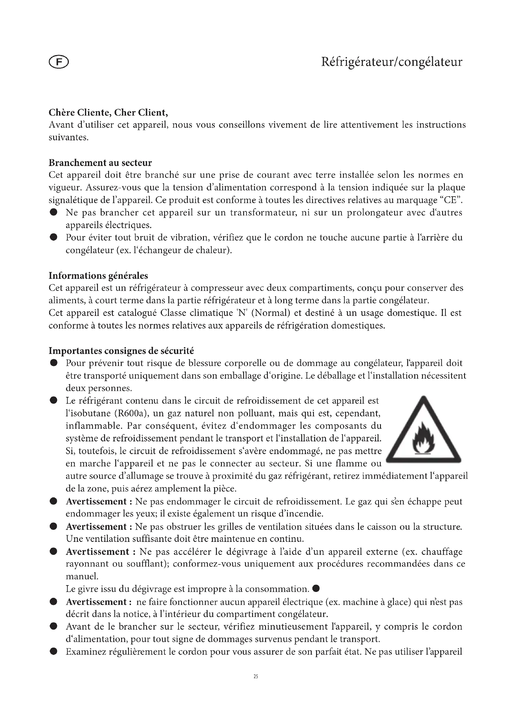 The actual consumption depends on the pattern of use and the location of the appliance Total gross volume, (litres) 215 Usable refrigerator capacity (litres) 170 Usable freezer capacity (litres) 45 Climate classification N Ambient temperature range, °C 16 – 32 Safe storage time in case of malfunction, h 12 Freezing capacity, kg/24h 3 Freezing temperature, °C -18 Dimensions (mm) 1445 x 550 x 570 Weight (kg) 51 Electrical specifications See rating plate Insulation foam Cyclopenthane Noise emission 40 dB(A) 24Réfrigérateur/congélateur Chère Cliente, Cher Client, Avant d’utiliser cet appareil, nous vous conseillons vivement de lire attentivement les instructions suivantes. Branchement au secteur Cet appareil doit être branché sur une prise de courant avec terre installée selon les normes en vigueur. Assurez-vous que la tension d’alimentation correspond à la tension indiquée sur la plaque signalétique de l’appareil. Ce produit est conforme à toutes les directives relatives au marquage “CE”. Ne pas brancher cet appareil sur un transformateur, ni sur un prolongateur avec d‘autres ● appareils électriques. Pour éviter tout bruit de vibration, vérifiez que le cordon ne touche aucune partie à l‘arrière du ● congélateur (ex. l‘échangeur de chaleur). Informations générales Cet appareil est un réfrigérateur à compresseur avec deux compartiments, conçu pour conserver des aliments, à court terme dans la partie réfrigérateur et à long terme dans la partie congélateur. Cet appareil est catalogué Classe climatique 'N' (Normal) et destiné à un usage domestique. Il est conforme à toutes les normes relatives aux appareils de réfrigération domestiques. Importantes consignes de sécurité Pour prévenir tout risque de blessure corporelle ou de dommage au congélateur, l‘appareil doit ● être transporté uniquement dans son emballage d‘origine. Le déballage et l‘installation nécessitent deux personnes. Le réfrigérant contenu dans le circuit de refroidissement de cet appareil est ● l‘isobutane (R600a), un gaz naturel non polluant, mais qui est, cependant, inflammable. Par conséquent, évitez d‘endommager les composants du système de refroidissement pendant le transport et l‘installation de l‘appareil. Si, toutefois, le circuit de refroidissement s‘avère endommagé, ne pas mettre en marche l‘appareil et ne pas le connecter au secteur. Si une flamme ou autre source d’allumage se trouve à proximité du gaz réfrigérant, retirez immédiatement l‘appareil de la zone, puis aérez amplement la pièce.