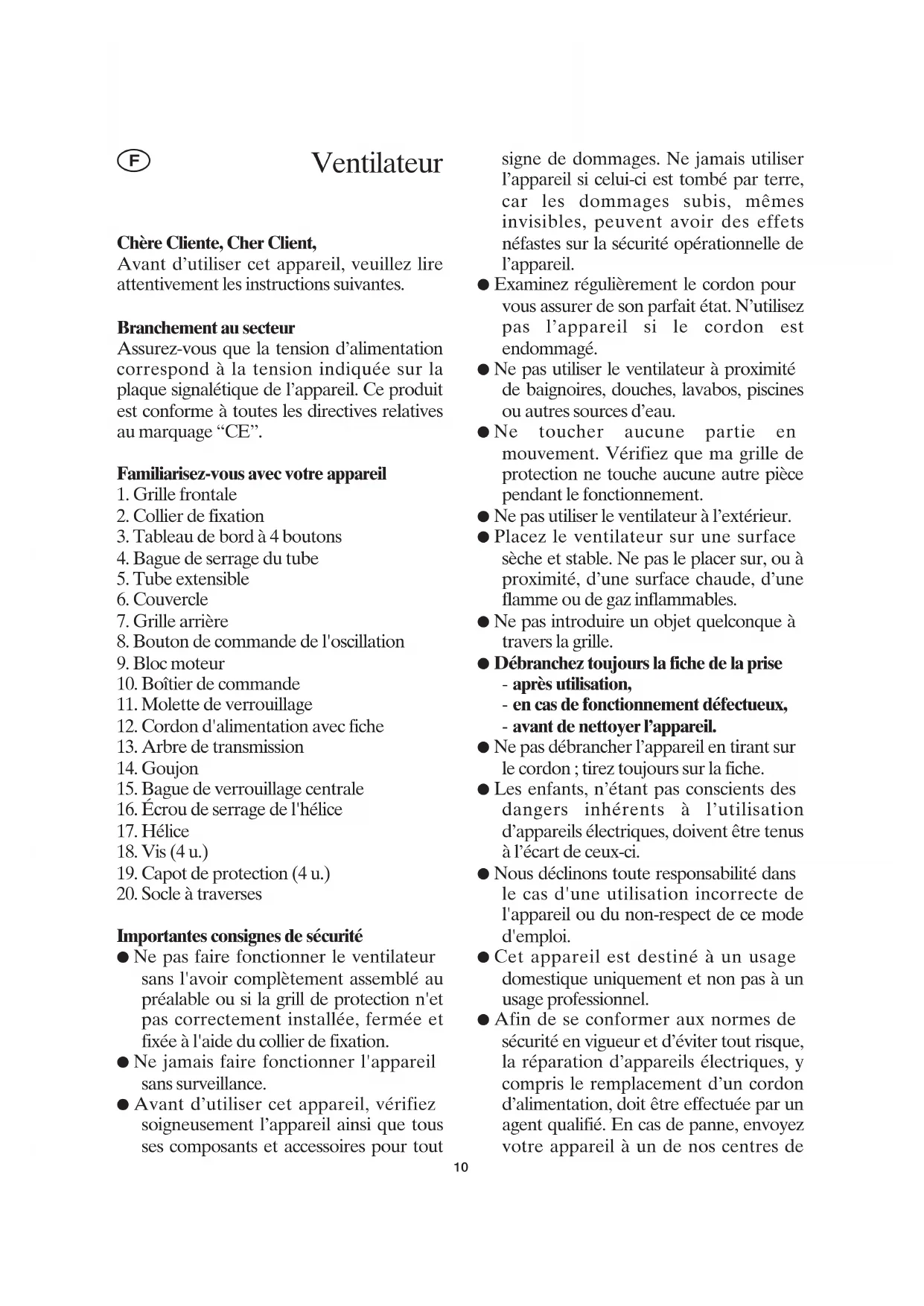 - Ne pas faire fonctionner le ventilateur sans l'avoir complètement assemblé au préalable ou si la grill de protection n'et pas correctement installée, fermée et fixée à l'aide du collier de fixation.