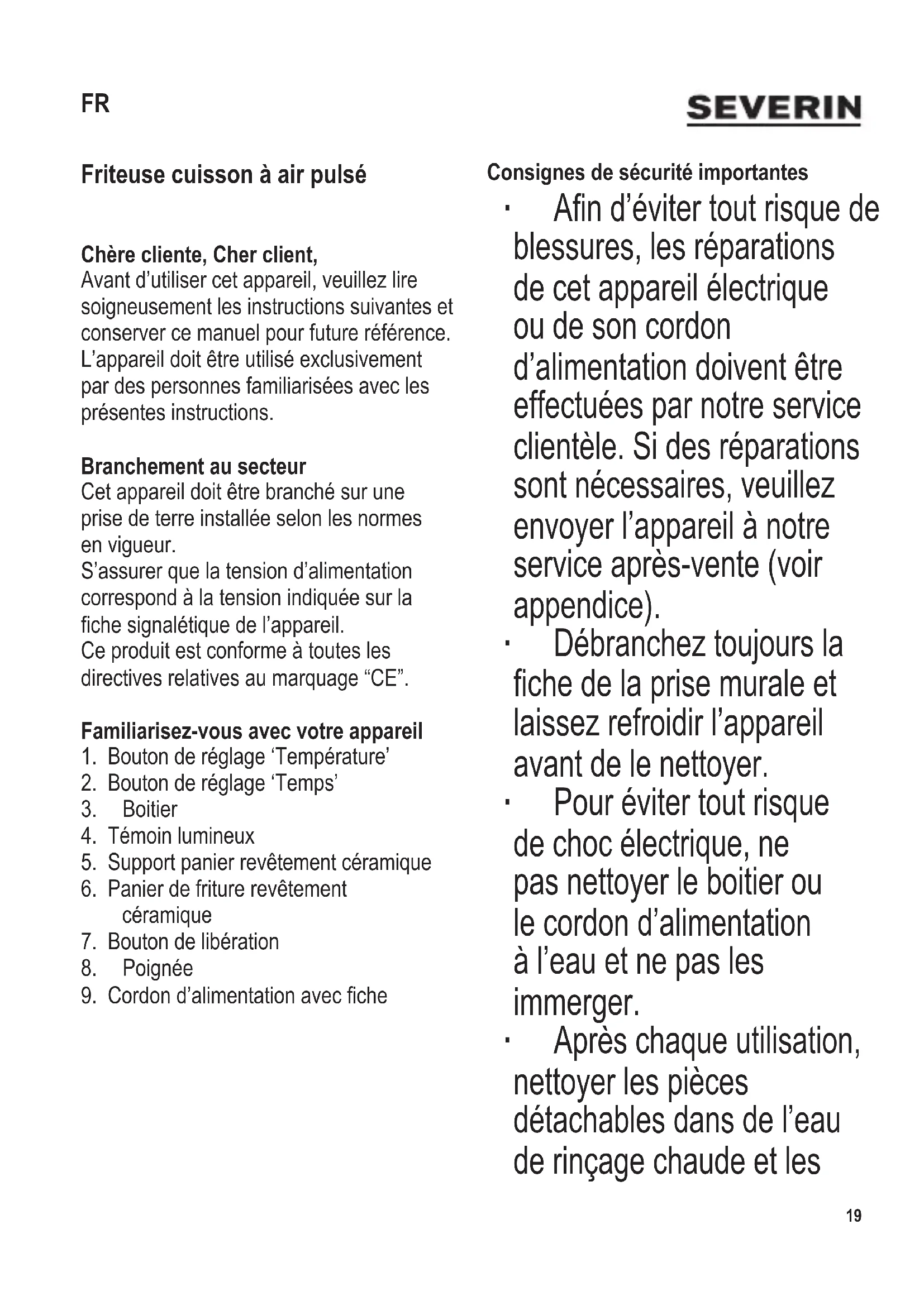 Friteuse cuisson à air pulsé Chère cliente, Cher client, Avant d’utiliser cet appareil, veuillez lire soigneusement les instructions suivantes et conserver ce manuel pour future référence. L’appareil doit être utilisé exclusivement par des personnes familiarisées avec les présentes instructions. Branchement au secteur Cet appareil doit être branché sur une prise de terre installée selon les normes en vigueur. S’assurer que la tension d’alimentation correspond à la tension indiquée sur la che signalétique de l’appareil. Ce produit est conforme à toutes les directives relatives au marquage “CE”. Familiarisez-vous avec votre appareil