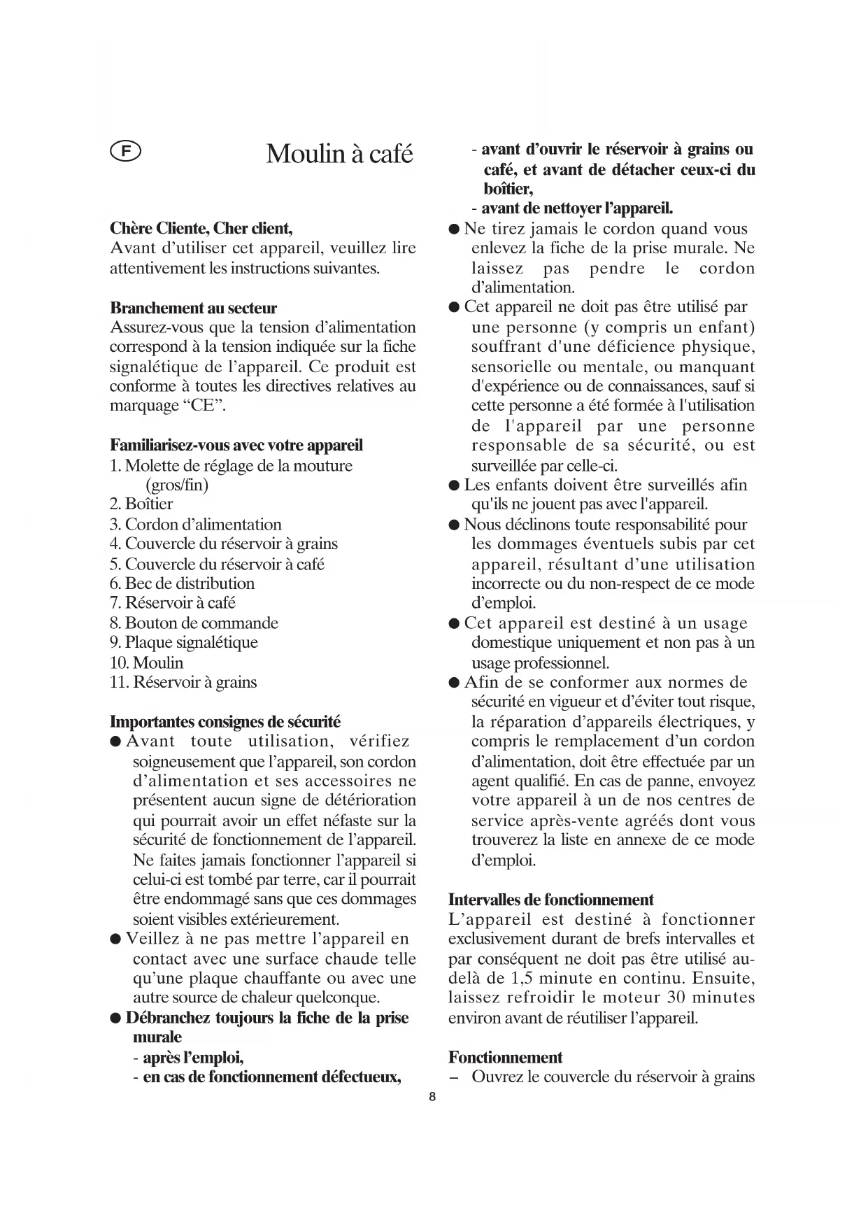 Importantes consignes de sécurité ● Avant toute utilisation, vérifiez soigneusement que l’appareil, son cordon d’alimentation et ses accessoires ne présentent aucun signe de détérioration qui pourrait avoir un effet néfaste sur la sécurité de fonctionnement de l’appareil. Ne faites jamais fonctionner l’appareil si celui-ci est tombé par terre, car il pourrait être endommagé sans que ces dommages soient visibles extérieurement. ● Veillez à ne pas mettre l’appareil en contact avec une surface chaude telle qu’une plaque chauffante ou avec une autre source de chaleur quelconque. ● Débranchez toujours la fiche de la prise murale - après l’emploi, - en cas de fonctionnement défectueux, - avant d’ouvrir le réservoir à grains ou café, et avant de détacher ceux-ci du boîtier, - avant de nettoyer l’appareil. ● Ne tirez jamais le cordon quand vous enlevez la fiche de la prise murale. Ne laissez pas pendre le cordon d’alimentation. ● Cet appareil ne doit pas être utilisé par une personne (y compris un enfant) souffrant d'une déficience physique, sensorielle ou mentale, ou manquant d'expérience ou de connaissances, sauf si cette personne a été formée à l'utilisation de l'appareil par une personne responsable de sa sécurité, ou est surveillée par celle-ci. ● Les enfants doivent être surveillés afin qu'ils ne jouent pas avec l'appareil. ● Nous déclinons toute responsabilité pour les dommages éventuels subis par cet appareil, résultant d’une utilisation incorrecte ou du non-respect de ce mode d’emploi. ● Cet appareil est destiné à un usage domestique uniquement et non pas à un usage professionnel. ● Afin de se conformer aux normes de sécurité en vigueur et d’éviter tout risque, la réparation d’appareils électriques, y compris le remplacement d’un cordon d’alimentation, doit être effectuée par un agent qualifié. En cas de panne, envoyez votre appareil à un de nos centres de service après-vente agréés dont vous trouverez la liste en annexe de ce mode d’emploi. Intervalles de fonctionnement L’appareil est destiné à fonctionner exclusivement durant de brefs intervalles et par conséquent ne doit pas être utilisé au- delà de 1,5 minute en continu. Ensuite, laissez refroidir le moteur 30 minutes environ avant de réutiliser l’appareil. Fonctionnement