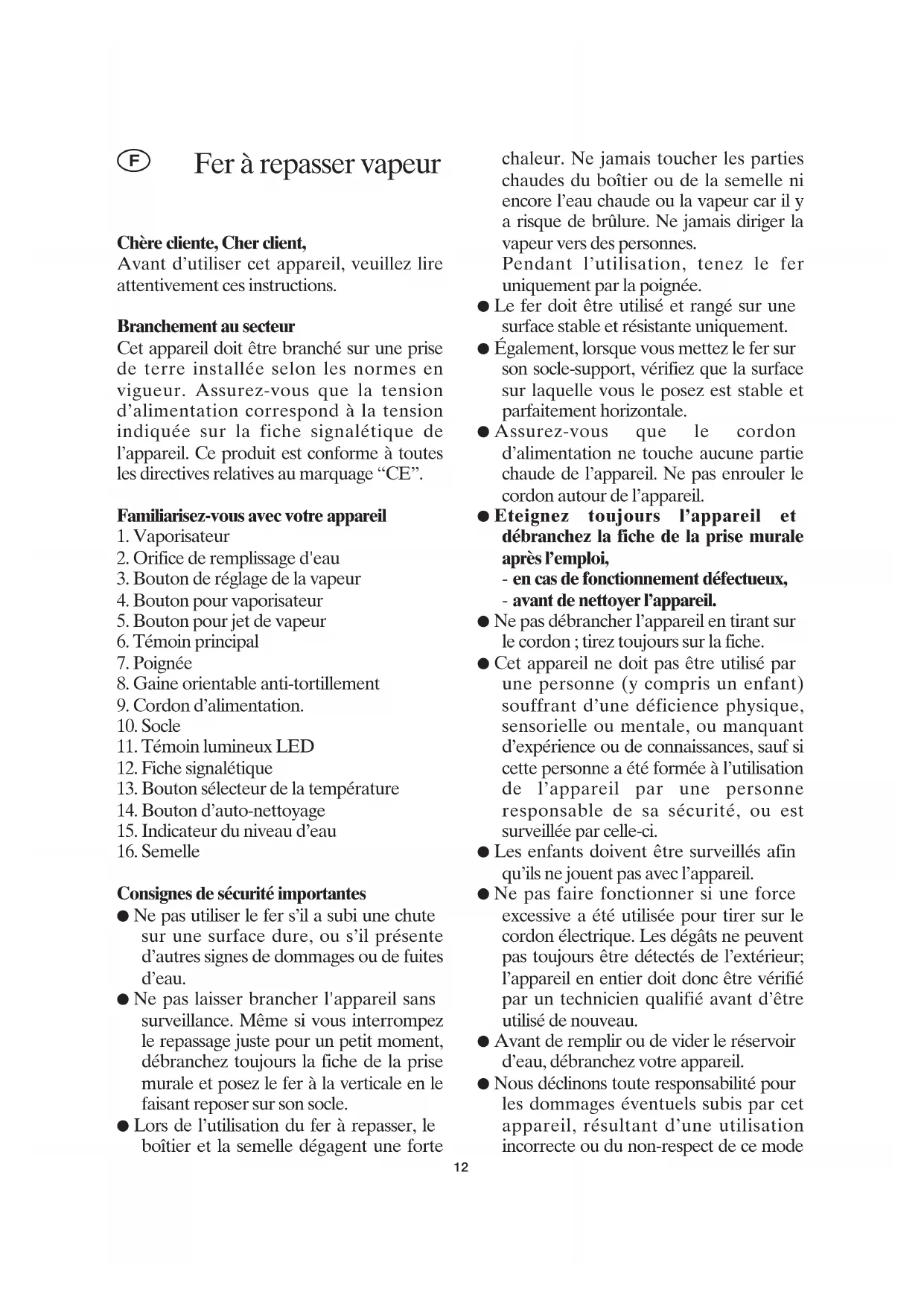 Consignes de sécurité importantes ● Ne pas utiliser le fer s’il a subi une chute sur une surface dure, ou s’il présente d’autres signes de dommages ou de fuites d’eau. ● Ne pas laisser brancher l'appareil sans surveillance. Même si vous interrompez le repassage juste pour un petit moment, débranchez toujours la fiche de la prise murale et posez le fer à la verticale en le faisant reposer sur son socle. ● Lors de l’utilisation du fer à repasser, le boîtier et la semelle dégagent une forte chaleur. Ne jamais toucher les parties chaudes du boîtier ou de la semelle ni encore l’eau chaude ou la vapeur car il y a risque de brûlure. Ne jamais diriger la vapeur vers des personnes. Pendant l’utilisation, tenez le fer uniquement par la poignée. ● Le fer doit être utilisé et rangé sur une surface stable et résistante uniquement. ● Également, lorsque vous mettez le fer sur son socle-support, vérifiez que la surface sur laquelle vous le posez est stable et parfaitement horizontale. ● Assurez-vous que le cordon d’alimentation ne touche aucune partie chaude de l’appareil. Ne pas enrouler le cordon autour de l’appareil. ● Eteignez toujours l’appareil et débranchez la fiche de la prise murale après l’emploi, - en cas de fonctionnement défectueux, - avant de nettoyer l’appareil. ● Ne pas débrancher l’appareil en tirant sur le cordon ; tirez toujours sur la fiche. ● Cet appareil ne doit pas être utilisé par une personne (y compris un enfant) souffrant d’une déficience physique, sensorielle ou mentale, ou manquant d’expérience ou de connaissances, sauf si cette personne a été formée à l’utilisation de l’appareil par une personne responsable de sa sécurité, ou est surveillée par celle-ci. ● Les enfants doivent être surveillés afin qu’ils ne jouent pas avec l’appareil. ● Ne pas faire fonctionner si une force excessive a été utilisée pour tirer sur le cordon électrique. Les dégâts ne peuvent pas toujours être détectés de l’extérieur; l’appareil en entier doit donc être vérifié par un technicien qualifié avant d’être utilisé de nouveau. ● Avant de remplir ou de vider le réservoir d’eau, débranchez votre appareil. ● Nous déclinons toute responsabilité pour les dommages éventuels subis par cet appareil, résultant d’une utilisation incorrecte ou du non-respect de ce mode